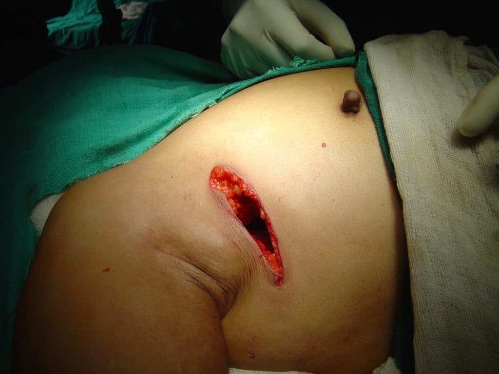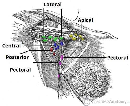 Breast surgery aims to remove breast cancer and assesses evidence of local (axillary) spread. Breast and axillary surgery allows assessment of tumour size, biology, and nodal spread more accurately than imaging and biopsy alone. This helps to not only achieve disease control but provides information to guide any adjuvant treatment. Breast surgery aims to achieve effective oncological treatment whilst maintaining breast cosmesis and symmetry. Surgical Treatments Breast Conserving Surgery Breast Conserving Surgery (BCS) is generally only suitable for patient with localised disease and no evidence of metastatic disease. The foundation of BCS is wide local excision (WLE), which comprises removing the breast cancer with a cuff of healthy tissue around it. Breast conserving surgery can be considered when the size of the breast cancer is small relative to the breast size. As such, a wide local excision can be performed without significantly disrupting the breast shape (Fig. 1). Techniques vary in complexity from incision placement directly over the area of disease, to approaches which hide scars beneath clothing, around the areola, or within the Infra mammary fold. More recently oncoplastic techniques (discussed below) can allow reshaping of the breast or transposition of local tissue flaps to ensure optimal cosmetic outcomes whilst still achieving oncological control. Many breast cancers are clinically not palpable therefore must be localised prior to surgery, so as to target excision. Localisation techniques include image-guided guidewire or magseed insertion, which allow for more accurate surgery. Chintamani, Rohan Khandelwal, Megha Tandon, K Yashwant, Pranjal Kulshreshtha, Tushar Aeron, Dinesh Bhatnagar, Anju Bansal and Sunita Saxena, CC BY-SA 2.0 <https://creativecommons.org/licenses/by-sa/2.0>, via Wikimedia Commons Figure 1Incision following a wide local excision for suspected breast malignancy Mastectomy A mastectomy entails removing the entirety of the breast tissue (in practical terms, approximately 95% of the breast tissue is removed). Mastectomies are indicated in cases of multifocal disease, high tumour:breast tissue ratio, disease recurrence, patient choice, or for risk-reduction. Mastectomies can be performed with varying preservation of the breast skin envelope (and nipple). Whilst “simple mastectomies” involve excision of an area of skin overlying the breast to result in a flat cosmesis, skin-sparing (SSM) and nipple-sparing mastectomy (NSM) can also be performed. Both SSM and NSM allow for the preservation of a breast envelope so as to facilitate reconstruction. Risk Reducing Mastectomy A risk-reducing mastectomy is an operation to remove healthy breast tissue in order to reduce the risk of developing breast cancer. Rsk-reducing mastectomies are only suitable for patients with a high risk of developing breast cancer and requires appropriate counseling to reach this difficult decision. In cases of suspected genetic risks, then patients are often referred to a genetic counsellor. Factors conferring risk include: A strong family history of breast or ovarian cancer Testing positive for genetic mutations, such as BRCA1 or BRCA2, PTEN, or TP53 mutations Previous history of breast cancer Axillary Surgery Axillary surgery can be divided into Sentinel Lymph Node Biopsy (SLNB) and Axillary Node Clearance (ANC) Sentinel Lymph Node Biopsy Breast cancer will generally metastasise initially via the lymphatics, therefore a SLNB allows for the assessment of potential lymphatic spread. SLNB involves removal of the sentinel lymph node, which is the first lymph node (or nodes) into which the breast drains. Sentinel lymph nodes are identifiable following injection of technetium-99 nanocolloid. This gamma emitting radioisotope maps to the lymph nodes via the lymphatics. Radioactive nodes can the be identified intra-operatively using a gamma probe and analysed for cancer spread. Lymph node mapping methods can also utilise blue dye (which stains sentinel lymph nodes blue) or solutions containing superparamagnetic iron oxide particles, which can also be identified with a specialist probe. Axillary Node Clearance Axillary node clearance involves removing all nodes in the axilla. This is performed when nodal spread is confirmed on biopsy during initial investigations. It allows both staging the extent of axillary disease involvement (so as to guide adjuvant treatments) and controls or removes axillary disease. ANC require meticulous dissection and preservation of key neurovascular structures within the axilla. Important structures include the axillary vein, the thoracodorsal pedicle, and the long thoracic nerve of Bell*. Additional risks of axillary node clearance include paraesthesia, seroma formation, and lymphedema in the upper limb (in 20-30%). *The long thoracic nerve is responsible for motor innervation of the serratus anterior muscle and damage to this nerve causes winging of the scapula By TeachMeSeries Ltd (2025) Figure 1The lymphatic drainage of the breast and associated axillary lymph nodes Oncoplastic Management Oncoplastic surgery has emerged as a means of reshaping breasts or replacing volume with local or distant autologous tissue, so as to replace volume in larger excisions which would previously have resulted in mastectomy. Multiple flap reconstructive techniques are available (discussed below). Alternatively, a therapeutic mammoplasty may be considered in certain patient, which involves a WLE combined with breast reduction techniques. This technique is suited to larger ptotic breasts and results in a smaller uplifted breast. Flap Reconstructive techniques Local Flap Techniques Local flap techniques involve the mobilisation of regional tissue to replace volume lost after wide local excision or mastectomy. These include the dermis and skin flaps perfused by local artery perforators, such as the lateral intercostal artery perforator (LICAP) or anterior intercostal artery perforator (