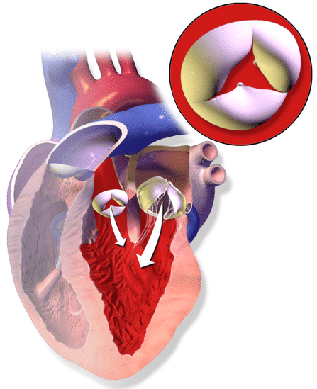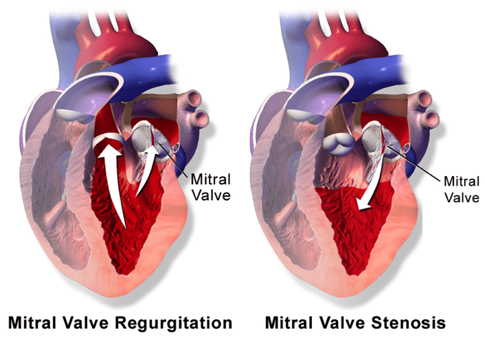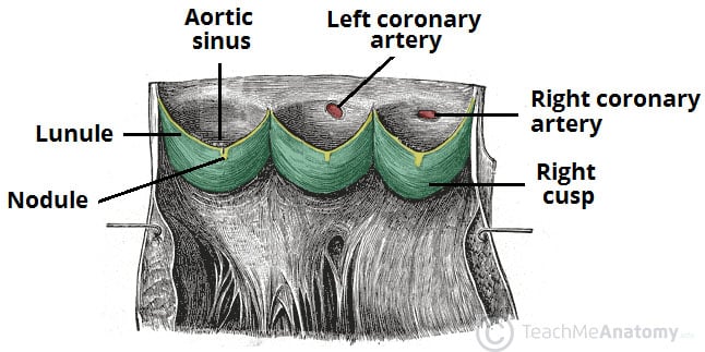 Valvular disease is common amongst the general population, however fortunately the vast majority is mild and does not need intervention. The prevalence is around 2.5% in the general population, however rises to over 10% in those aged over 75yrs. The mainstay of diagnosis for valvular disease is with echocardiogram (ECHO), which can not only diagnose the condition but also assess severity and underlying aetiology, and determine the concurrent cardiac function. Plain film chest radiographs (CXR) and electrocardiograms (ECGs) can be used to look for complications of valvular disease, such as Atrial Fibrillation, and should be performed along with assessment of the coronary system (via either angiography or CT angiograms) prior to any further intervention. By TeachMeSeries Ltd (2022) Figure 1The aortic valve cusps, aortic sinuses, and the origin of the coronary arteries Mitral Regurgitation Mitral regurgitation (MR) is characterised by the retrograde flow of blood through the mitral valve from the left ventricle into the left atrium. It is the most common valvular abnormality worldwide. The causes of MR may be primary, where there is a structural deformity within the valve and its surrounding structures, or secondary (e.g. ischaemic), where there is no structural abnormality of the valve itself. The most common worldwide* cause of MR is mitral valve prolapse secondary to myxomatous degeneration. *In developing countries, however, rheumatic heart disease remains the most common cause of MR Classification of Mitral Regurgitation The Carpentier classification is commonly used to classify the cause of MR according to valve leaflet motion: Type 1 – normal leaflet motility, e.g. annular enlargement or perforated leaflet Type 2 – increased leaflet motility, e.g. elongated or ruptured chords Type 3 – restricted motility, e.g. Rheumatic Heart Disease or ischaemic cardiomyopathy The retrograde flow of blood across the mitral valve into the left atrium increases the preload of the left ventricle during diastole. The left ventricular stroke volume is thereby increased (as per Starling equation), and in chronic cases this results ventricular dilatation and progressive widening of the annulus of the mitral valve. If left untreated, there is a resultant reduced left ventricle ejection fraction and heart failure. Patients with MR most often present with features of heart failure (dyspnoea, orthopnoea, paroxysmal nocturnal dyspnoea). On examination, MR patients will have a pansystolic murmur, best heard at the mitral region (cardiac apex) with radiation into the left axilla. Surgical management is reserved for those with symptomatic severe MR. Mitral Stenosis Mitral stenosis is caused by the narrowing of the mitral valve orifice, most commonly caused by rheumatic fever, with symptoms typically presenting approximately 10 years after the initial infection. The narrowing of the mitral valve orifice leads to the formation of a pressure gradient across the valve, increasing atrial pressure and resulting in left atrial dilatation, often also precipitating an atrial fibrillation. The decompensation of the left atrium results in reduced cardiac output and congestive heart failure. Patients present with features of heart failure, or less commonly from the atrial fibrillation. On examination, a low-pitched, rumbling mid-diastolic murmur is auscultated, loudest in the mitral region and accentuated with the patient in the left lateral decubitus position. The murmur may be accompanied by a loud S1 or an opening snap. Blausen.com staff (2014). "Medical gallery of Blausen Medical 2014". WikiJournal of Medicine 1 (2). DOI:10.15347/wjm/2014.010. ISSN 2002-4436., CC BY 3.0 <https://creativecommons.org/licenses/by/3.0>, via Wikimedia Commons Figure 2Illustration demonstrating pathophysiology of Mitral Regurgitation versus Mitral Stenosis Aortic Stenosis Aortic stenosis (AS) affects 2-7% of people over 65yrs. It is most commonly caused by age-related calcification, however can be caused by congenital bicuspid valves (in those aged <50yrs) or rheumatic heart disease (especially in developing nations) Stenosis of the aortic valve results in reduced blood flow from of the left ventricle. Increased resistance results in hypertrophy of the left ventricle (LV), in attempt to maintain the stroke volume. However, eventually the LV will decompensate, leading to heart failure. In cases of symptomatic aortic stenosis, patients present with exertional dyspnoea, angina*, and syncope (this triad rarely actually occurs together), and can progress to features of heart failure. On examination, an ejection systolic murmur will be present, loudest in the aortic region; patients have a slow-rising pulse with a narrow pulse pressure. Indications for surgical management are severe symptomatic AS or severe AS with left sided heart failure. *Angina occurs due to the increasing oxygen demand of the severely hypertrophied left ventricle Aortic Regurgitation Aortic regurgitation involves the retrograde flow of blood through the aortic valve from the aorta into left ventricle (Fig. 3). This regurgitation results initially with LV hypertrophy, in order to maintain a stroke volume, however this eventually results in LV dilatation and subsequent heart failure. The most common reasons for AR are rheumatic fever (most common worldwide), bicuspid valves (most common in developed countries), connective tissue disease, or in acute cases, infective endocarditis, or aortic dissection. Blausen.com staff (2014). "Medical gallery of Blausen Medical 2014". WikiJournal of Medicine 1 (2). DOI:10.15347/wjm/2014.010. ISSN 2002-4436., CC BY 3.0 <https://creativecommons.org/licenses/by/3.0>, via Wikimedia Commons Figure 3Illustration demonstrating Aortic Regurgitation Patients with aortic regurgitation can remain asymptomatic, with the most common late presenting symptom being exertional dyspnoea. On examination, an mid-diastolic murmur can be auscultated (“Austin F