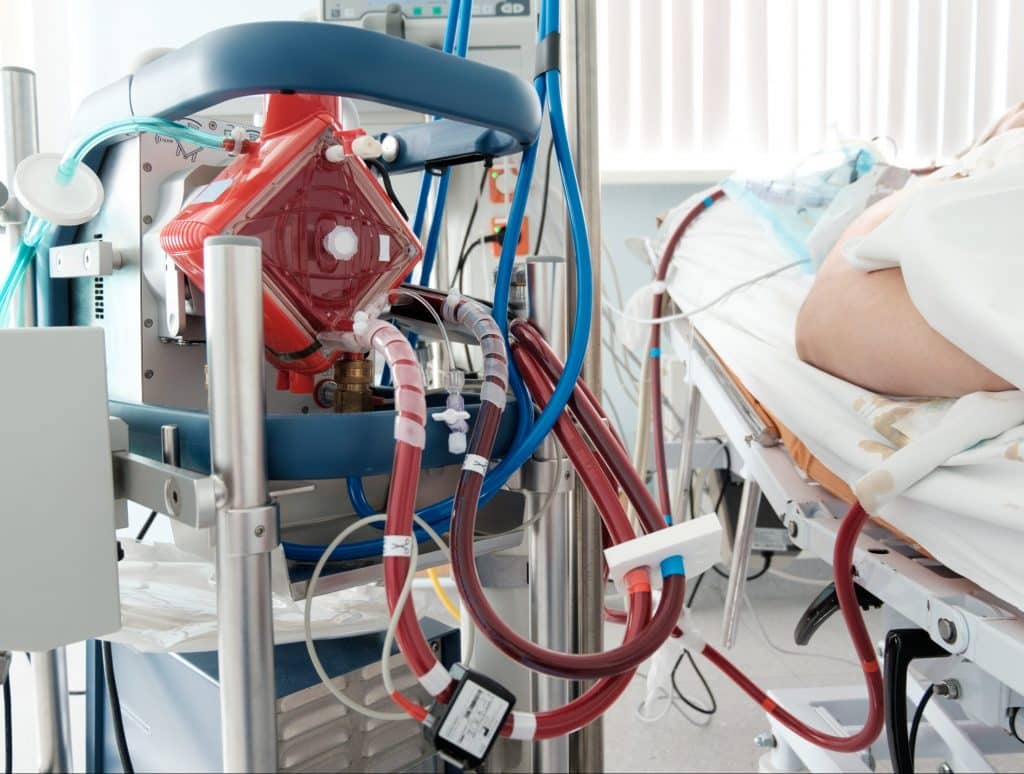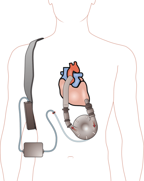 The number of heart and lung transplants has increased over recent years, due to a combination of better surgical techniques and patient management pre- and post-operatively. However, there remains a significant shortage of appropriate organs, resulting in considerable waiting lists and subsequent mortality among patients waiting for a transplant. Bridges to transplantation are used to manage patients who are listed for a heart or lung transplant, acting to temporise whilst on the waiting list. Various approaches are used, depending on the underlying diagnosis and patient characteristics. The main two classifications are ventricular assist devices (VAD) and extracorporeal membrane oxygenation (ECMO). VADs only provide circulatory support, whereas ECMO oxygenates the blood too. Ventricular Assist Devices A VAD is a mechanical pump that provides adequate cardiac output to perfuse end-organs, while unloading the heart. The key components of a VAD are an inflow cannula (implanted in the ventricle), a pumping chamber, an outflow cannula (implanted into the aorta or pulmonary artery), and a drive line (extracorporeal control and power lines that extend from pumping chamber to outside the body). VADs are commonly implanted in the left ventricle, but can be implanted in the right ventricle, or both. The VAD circuit receives blood from the heart and pumps into the arterial circulation. The VAD circuit runs parallel to the native cardiac circuit, but the ventricle functions as a passive conduit mainly due to poor contractility. Indications for VAD Indications for a VAD vary depending on the patient, however the most common are severe symptomatic heart failure, intractable arrhythmias, or advanced heart failure complicated by cardiac cachexia or renal/hepatic failure (not responsive to medical therapy). As such, the three major clinical scenarios its used are as a bridge to transplantation (whilst on the waiting list), as destination therapy (patients who are not transplant candidates or who decline transplantation), or as a bridge to recovery (those with reversible cardiac dysfunction). Types of Ventricular Assist Devices VADs are classified based on the side of the heart that is assisted, the type of pump used, and whether the device is internal or external. Those classified by the side of the heart being assisted include: Left ventricular assist device (LVAD) receives inflow from the left atrium or left ventricle and outflows into the aorta (Fig. 1) Right ventricular assist device (RVAD) receives inflow from the right atrium or right ventricle and outflow into the pulmonary artery Biventricular assist device (BiVAD) consists of an LVAD and RVAD attached in parallel (or as a dual chamber device which is known as a total artificial heart (TAH)) Madhero88, CC BY-SA 3.0 <https://creativecommons.org/licenses/by-sa/3.0>, via Wikimedia Commons Figure 1Schematic demonstrating an intracorporeal left ventricular assist device (LVAD) VADS can be pulsatile or non-pulsatile; pulsatile VADs mimic the natural action of the cardiac ejection cycle, whilst non-pulsatile VADs use a motor at fixed speeds which maintains a constant ejection of blood into the systemic circulation* VADs can also be classified as either intracorporeal (implantable) or extracorporeal (external); intracorporeal VADs have the pump below the heart within the thoracic cavity and power source outside the body (Fig. 1), whilst extracorporeal VADs have the pump and power source outside the body *This means patients with a non-pulsatile VADs often lack a pulse on palpation Extracorporeal Membrane Oxygenation Extracorporeal membrane oxygenation (ECMO) is used to provide prolonged cardiac and respiratory support to patients whose heart and lungs are unable to sustain adequate perfusion. ECMO is similar in principle to cardiopulmonary bypass and contains similar components, but there are several key modifications that enable ECMO support to continue for days rather than hours. Adobe Stock, Licensed to TeachMeSeries Ltd Figure 2An ECMO machine on an intensive care unit The ECMO machine is connected to the patient via cannulas inserted through the groin, axilla, or neck (especially in neonates and infants). The blood is pumped from the patient’s body to an oxygenator that adds oxygen and removes carbon dioxide, therefore replacing the lung function. The ECMO machine then sends the blood back to the patient via a pump with the same force as the heart, therefore replacing the heart function. Indications for ECMO Indications for ECMO include acute heart failure (such as secondary to MI or drug toxicity), primary graft failure following cardiac or lung transplantation, massive pulmonary embolism, or acute respiratory distress syndrome Types of ECMO There are two main types of ECMO: Venovenous – venous blood is accessed from large central veins, typically femoral, pumped through the oxygenator, and returned to the venous system near right atrium This provides respiratory support only Venoarterial – venous cannula is typically inserted into the common femoral vein and an arterial cannula is inserted into the femoral artery, which is used to pump the blood back into the patient This provides both respiratory and haemodynamic support Key Points Bridges to transplantation are used to manage patients who are listed for a heart or lung transplant, acting to temporise whilst on the waiting list The main two classifications are ventricular assist devices (VAD) and extracorporeal membrane oxygenation (ECMO) Most common indications for a VAD are severe symptomatic heart failure, intractable arrhythmias, or advanced heart failure complicated by cardiac cachexia or renal/hepatic failure Most common indications for ECMO include acute heart failure, primary graft failure following cardiac or lung transplantation, massive pulmonary embolism, or acute respiratory distress syndrome Rate This Article
