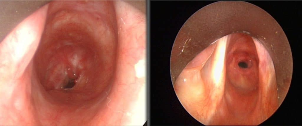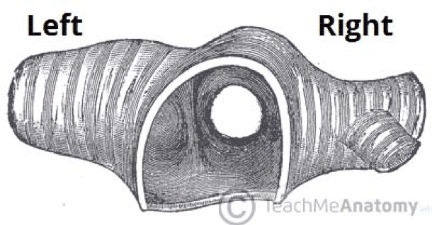 The trachea is a D-shaped fibrocartilaginous tube which runs from the larynx, continuing inferiorly posterior to the sternum, before dividing into the right and left primary bronchi at the carina (around T4 vertebral level). The tracheal cartilages are composed of hyaline cartilage which act to support the trachea and stop it from collapsing during the pressure changes that occur during air ventilation (Fig. 1). The trachealis muscle bridges the gap between the free ends of C-shaped cartilage rings at the posterior border of the trachea. Tracheomalacia and tracheal stenosis are the two most common conditions that affect the trachea, whilst other less common conditions include tracheooesophageal fistulae or tracheal tumours. This article will focus on the management of the tracheal stenosis and tracheomalacia. By TeachMeSeries Ltd (2021) Figure 1Transverse section of the trachea, showing its bifurcation Tracheomalacia Tracheomalacia involves progressive weakening of the tracheal walls, resulting in airway collapse on expiration. Majority of patients will present in younger years, as babies or in early childhood. There are three types of tracheomalacia: Type 1 = congenital causes, can be associated with tracheoesophageal fistula or oesophageal atresia Type 2 = extrinsic compression, such as a thyroid goitre or mediastinal mass Type 3 = acquired, such as from previous prolonged intubation, COPD, or trauma Clinical Features In congenital cases, children will present with difficulty breathing or stridor (the most common cause of stridor in children), which is made worse when supine or when feeding or crying. It can also result in recurrent lower respiratory tract infections. In acquired cases, patients can present with shortness of breath on exertion or recurrent pneumonia, or in severe cases with stridor. In patients on intensive care following prolonged intubation, cases might be suspected if there is difficulty in extubating the patient. Investigations Gold standard for diagnosis is bronchoscopy which can reveal anterior and/or posterior collapse of tracheal lumen during expiration. Tracheomalacia is considered mild if the trachea lumen is <50% of initial size during expiration, moderate if it narrows to 25%, and severe if the tracheal walls oppose. Management Management of tracheomalacia depends on the extent of airway collapse. Symptoms of minor airway collapse will often improve during childhood. However, if the airway collapses and respiratory compromise is severe, both children and adults will typically require stent insertion or surgical repair. Patients can undergo a stent trial (Y-shaped silicone stent) for 2 weeks to see if symptoms improve. Should symptoms improve, patients may be offered a tracheoplasty or tracheobronchoplasty. Complications Symptoms of tracheomalacia often resolve by 18-24 months, particularly when tracheostomy has been used to function as a stent in the airway until maturation of cartilage occurs to reinforce structural integrity. Complications are rare, but mucus plugs are a potential complication during the 2-week stent trial. Tracheal Stenosis Tracheal stenosis is narrowing of the trachea. This can also be either congenital or acquired in nature, however, is most commonly post-tracheostomy* or as a pressure injury from endotracheal intubation. *Most commonly as a result of prolonged endotracheal intubation, prior tracheostomy, or if tracheostomy is too high (resulting in subglottic injuries) Adapted from Samir, CC BY-SA 3.0 <http://creativecommons.org/licenses/by-sa/3.0/>, via Wikimedia Commons Figure 2Plain film radiograph showing a subglottic stenosis post-intubation, with a narrowing in the tracheal lumen (arrow) Clinical Features Symptoms of tracheal stenosis can take up to 6 weeks to appear after extubation, however should be suspected in cases in difficult or prolonged intubations. Patients will present with features of shortness of breath and progressive upper airway obstruction (including stridor). Investigation Bronchoscopy is required for all patients with suspected tracheal stenosis (Fig 3). Similar to tracheomalacia, patients should be awake to enable vocal cord assessment. Tracheal CT scan, specifically spiral CT scan with 3D reconstruction, is often now used to further aid the diagnosis of tracheal stenosis. Adapted from Rn cantab, CC BY-SA 3.0 <https://creativecommons.org/licenses/by-sa/3.0>, via Wikimedia Commons Figure 3Bronchoscopy demonstrating tracheal stenosis Management Surgical options vary depending on the cause and extent of disease: Dilation via a balloon, guidewire, or rigid bronchoscope; this approach is indicated when there is inflammation in the segment to be resected and allows time for the inflammation to subside before definitive surgery For definitive treatment, tracheal resection and reconstruction of the stenotic segment is required; in congenital stenosis, tracheoplasty is also an option Key Points Tracheomalacia and tracheal stenosis are the two most common conditions that affect the trachea Tracheomalacia involves progressive weakening of the tracheal walls, resulting in airway collapse on expiration, most common in early years Tracheal stenosis is narrowing of the trachea and this common occurs post-tracheostomy Rate This Article