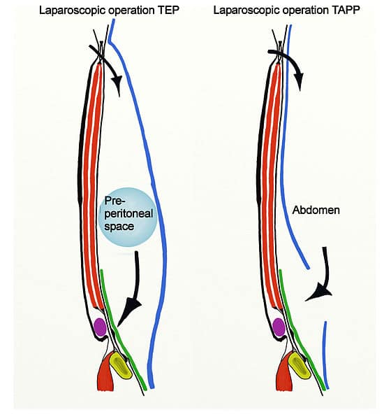 This article is for educational purposes only. It should not be used as a template for consenting patients. The person obtaining consent should have clear knowledge of the procedure and the potential risks and complications. Always refer to your local or national guidelines, and the applicable and appropriate law in your jurisdiction governing patient consent. Overview of Procedure There are several types of hernia, the most common being inguinal, femoral, and umbilical. Repairs can be done both open or laparoscopically, especially for inguinal hernia. The mesh used during the repair is secure in place using tacks. Laparoscopic procedures have been shown to reduce post-operative pain and allow for faster recovery and return to work. For inguinal cases, laparoscopic repair may also be favoured in patients with bilateral or recurrent inguinal hernia. The two commonly employed techniques for laparoscopic inguinal hernia repair are TEP (Totally ExtraPeritoneal) and TAPP (TransAbdominal PrePeritoneal), depending on the layers involved and opened during the repair (Fig. 1). Anpol42, CC BY-SA 3.0 <https://creativecommons.org/licenses/by-sa/3.0>, via Wikimedia Commons Figure 1Layers involved during a TEP and TAPP inguinal hernia repair Complications Intraoperative Complication Description of Complication Potential Ways to Reduce Risk Haemorrhage Injury can occur to inferior epigastric vessels (especially with a TEP repair) or external iliac/ femoral vessels Ensure careful deployment of tacks when securing the mesh Injury to surrounding structures including bowel, bladder and ureter, liver, spermatic cord Contents of the hernial sac may include these structures Bowel resection Incarcerated hernias may contain ischaemic bowel; if the bowel is not viable it must be resected. Conversion to open In some cases anatomy may be difficult and it is safer to proceed to an open anterior inguinal hernia repair. In TEP repairs the peritoneum may be breached and the decision made to convert to TAPP repair. Anaesthetic Risks Includes damage to the teeth, throat and larynx, reaction to medications, nausea and vomiting, cardiovascular and respiratory complications Forms a part of the anaesthetist assessment before the operation Early Complication Description of Complication Potential Ways to Reduce Risk Pain Use of laparoscopic surgery, compared to open surgery, will limit post-operative pain Bleeding/ haematoma There is a small chance of bleeding and bruising in the abdomen post-surgery Haematoma or seroma formation are usually self-limited due to the tamponade of the peritoneum Infection Superficial wound infection is possible. An infected mesh is a fortunately rare but serious complication, as would be revision of wound Peri-operative antibiotics will reduce the risk of wound infections Scarring Laparoscopic surgery will minimise this risk Altered sensation Damage to ilioinguinal and/or genitofemoral nerve Seroma A swelling of lymphatic fluid may occur in redundant subcutaneous space following surgery Testicular Atrophy Damage to the blood supply to the testicle can occur in groin hernia repair, often due to venous thrombosis rather than arterial injury Identify and avoid damage to the spermatic cord and associated vessels Scrotal swelling/ hydrocoele Damage to venous/ lymphatic drainage during dissection Blood Clots The patient will be given anti-embolism stockings and low molecular weight heparin peri-operatively to minimise this risk as deemed appropriate Stroke, MI, Kidney Failure, Death Although small, this is always a risk in any major surgery Late Complication Description of Complication Potential Ways to Reduce Risk Adhesions Abdominal surgery may cause adhesions as a reaction to the procedure, although this is uncommon (especially in TEP repair) Recurrence There is always a potential for further surgery due to recurrence of the hernia. For inguinal hernia it is around 1% at 5 years. Request the patient avoids strenuous activity for a few weeks post-operatively Rate This Article