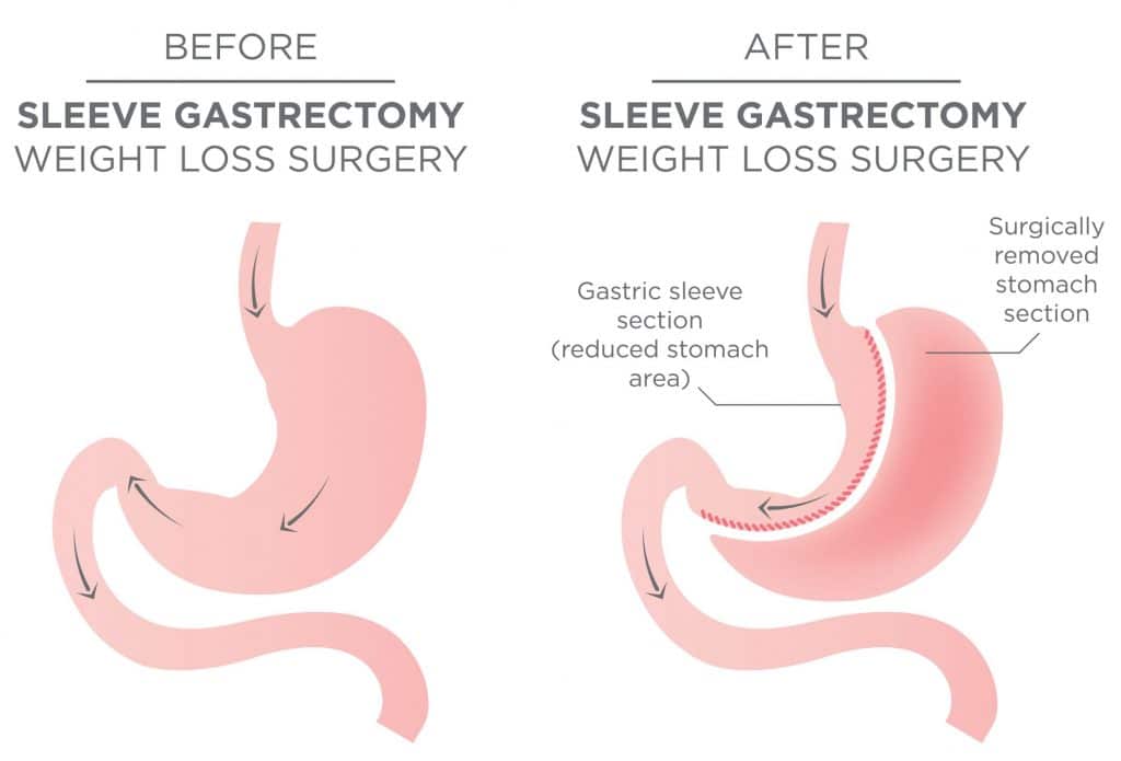 This article is for educational purposes only. It should not be used as a template for consenting patients. The person obtaining consent should have clear knowledge of the procedure and the potential risks and complications. Always refer to your local or national guidelines, and the applicable and appropriate law in your jurisdiction governing patient consent. Overview of Procedure A sleeve gastrectomy procedure primarily works via a restrictive mechanism, whereby the greater curve of the stomach is removed, leaving only a tube ~4-5cm wide. Adobe Stock, Licensed to TeachMeSeries Ltd Figure 1Illustration showing the anatomy following a sleeve gastrectomy procedure Complications Intra-Operative Complication Description of Complication Potential Ways to Reduce Risk Haemorrhage Damage to any of the surrounding structures can cause significant haemorrhage Injury to surrounding structures including bowel, liver, and spleen Damage can occur to any surrounding organ during the surgery Anaesthetic risks Includes damage to the teeth, throat and larynx, reaction to medications, nausea and vomiting, cardiovascular and respiratory complications Forms a part of the anaesthetist assessment before the operation Early Complication Description of Complication Potential Ways to Reduce Risk Infection Includes both wound infections and intra-abdominal collections, as well as respiratory or urinary tract infections post-operatively Intravenous antibiotics at induction, wound irrigation at closure, and early mobilisation Leak from the Staple Line Leakage from the staple line may occur and can be potentially serious and frequently requires further surgery DVT or PE, MI, Stroke, or Mortality As with any major surgery, whilst these events are uncommon, important to be aware of; the mortality risk is over 1 in 200 Adequate pre-optimisation and anaesthetic assessment, peri-operative prophylactic LMWH, high-dependency level care post-operatively Late Complication Description of Complication Potential Ways to Reduce Risk Metabolic and endocrine disturbances Changes to absorption and gastric secretions of the alimentary canal can affect nutrition considerably post-operatively The involvement of a specialist bariatric dietician in the management of bariatric patients is essential Failure to lose weight A sleeve gastrectomy is highly effective, but inevitably a minority of patients ultimately fail to lose weight Rate This Article