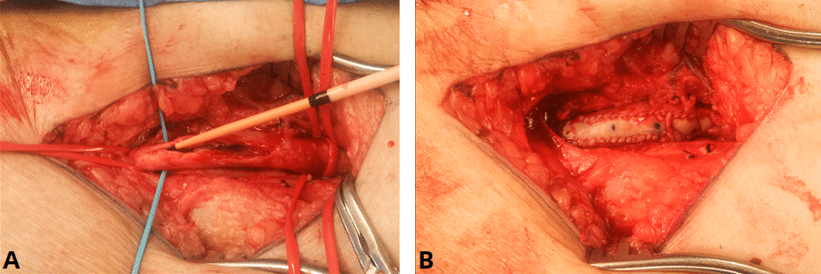 This article is for educational purposes only. It should not be used as a template for consenting patients. The person obtaining consent should have clear knowledge of the procedure and the potential risks and complications. Always refer to your local or national guidelines, and the applicable and appropriate law in your jurisdiction governing patient consent. Overview of Procedure The common femoral artery is particularly susceptible to stenosis, and is typically poorly treated through endovascular means. Thus, common femoral endarterectomy is a frequently performed procedure. It involves dissection of the common femoral artery and its bifurcation into the superficial femoral artery and profunda artery. These are slung and clamped where the artery becomes healthy again, with the artery opened longitudinally and the atherosclerotic plaque excised from the arterial media. The artery is typically closed with a bovine patch to avoid stenosis in the artery from primary closure. 2015 Scientific Research Publishing Inc [CC-BY 4.0] Figure 1Femoral endarterectomy; (A) exposure and arteriotomy of the CFA (B) completed endarterectomy with patch repair Complications Intraoperative Complication Description of Complication Potential Ways to Reduce Risk Haemorrhage This can occur due to damage to either the artery or the femoral vein or its branches, and may require blood transfusion. Injury to surrounding structures including femoral nerve or vein The femoral artery lies between the femoral nerve and femoral vein. Either of these can be damaged during the dissection if not careful. Dissect using a standard approach with identification of the inguinal ligament primarily, then approach the artery proximally Anaesthetic risks Includes damage to the teeth, throat and larynx, reaction to medications, nausea and vomiting, cardiovascular and respiratory complications. Forms a part of the anaesthetist assessment before the operation Early Complication Description of Complication Potential Ways to Reduce Risk Pain The patient will most likely have an epidural anaesthetic to minimise pain. Bleeding There is a small chance of bleeding and bruising in the abdomen post-operatively. Infection Superficial wound infection is possible, yet graft infections are also possible and are major complication that require life-long antibiotics and graft excision if possible. Peri-operative antibiotics will reduce the risk of wound and graft infections Scarring A longitudinal or transverse incisions will result in a scar, which may form a keloid scar, particular in high risk ethnicities. Seroma A swelling of lymphatic fluid may occur particularly in the groin due to disruption of the lymph nodes and channels. Careful dissection of the lymphatic nodes and channels with ligation will minimise this risk. Blood clots DVTs and PEs are a possibility in any operation. The risk is increased in patients with a raised BMI, on the pill, recent flights, previous DVT, pregnancy, smokers, cancer and prolonged bed rest. The patient will be given anti-embolism stocking and low molecular weight heparin peri-operatively to minimise this risk as deemed appropriate. Compartment syndrome Compartment syndrome may occur in patients with prolonged clamp times or in the acute setting. Patients with a long history of peripheral vascular disease are preconditioned for ischaemia so it is less likely to occur in such patients Minimise clamp times Stroke, MI, kidney failure, death Although small, this is always a risk in any major surgery Late Complication Description of Complication Potential Ways to Reduce Risk Hernia Any groin incision can cause a hernia if there is damage to the inguinal ligament or extensive lifting of the ligament during the procedure. Reintervention The common femoral artery may become stenosed again over time, requiring a redo procedure, or more proximal or distal disease may necessitate a bypass in the future. Rate This Article