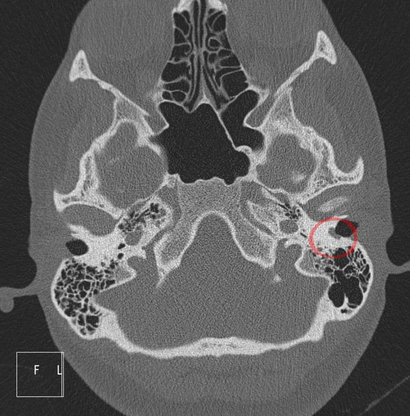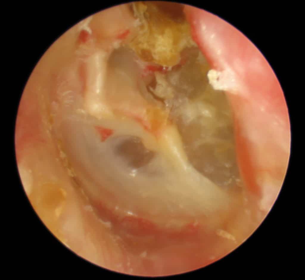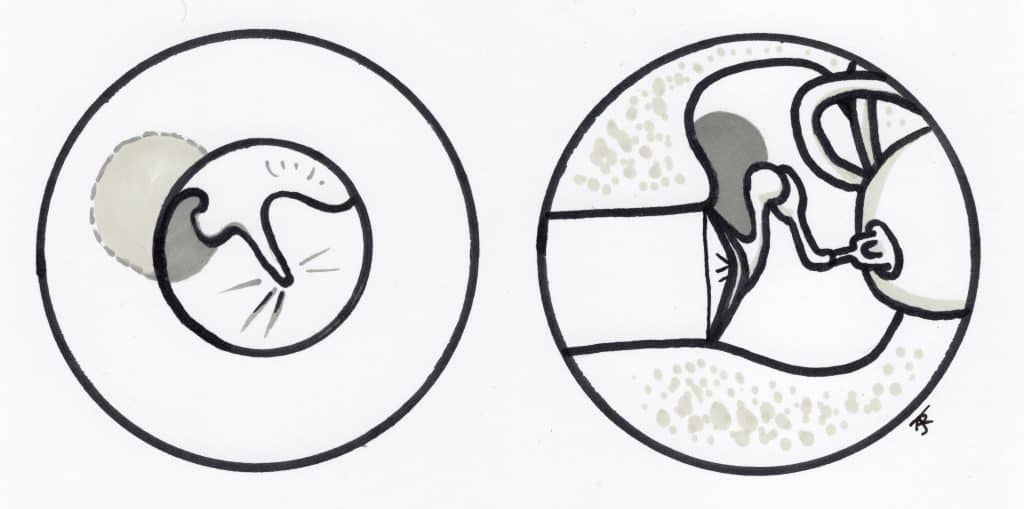 Chronic otitis media (COM) is an inflammatory disorder of the middle ear. It is characterised by persistent or recurrent ear discharge. Most classifications now separate chronic otitis media into two distinct types: Squamous – occurs due to retraction of the tympanic membrane and is associated with the formation of cholesteatoma Mucosal – occurs due to tympanic membrane perforation and subsequent inflammation of the middle ear mucosa due to infection; it is also known as chronic suppurative otitis media In this article, we shall look at the risk factors, clinical features, and management of chronic squamous otitis media. Pathophysiology Squamous chronic otitis media can be congenital* or acquired, however the majority are acquired. In acquired disease, the precise pathophysiology is unknown, with multiple theories. The most popular theory is that cholesteatoma result from chronic negative middle ear pressure from Eustachian tube dysfunction. Due to negative middle ear pressure, the tympanic membrane is retracted inwards. This results in a retraction pocket (Fig 1). These pockets are initially self-cleansing, but some may narrow and trap keratinised squamous cell debris which accumlates with time, leading to the formation of a cyst-like structure which may evolve into a cholesteatoma (Fig. 2). *Congenital disease is seen in patients with no history of ear surgery, and no perforation or retraction of the tympanic membrane; indeed congenital cholesteatomas represent epidermoid cysts within the middle ear cavity By Aimee Rowe, TeachMeSurgery [CC-BY-NC-ND 4.0] Figure 1Schematic demonstrating potential positioning of a pocket, which may lead to collection of keratin debris in the pocket, leading to cholesteatoma Thus, ‘cholesteatoma’ is a misnomer as there is no cholesterol or tumour-like process in the disease. However, the presence of super-added infection on the debris may lead to a purulent discharge. It is not possible to predict with certainty which pockets will go on to form a cholesteatoma, those in the ‘attico-antral’ (postero-superior) aspect of the tympanic membrane are thought to be high-risk, whereas those in the ‘tubotympanic’ (antero-inferior) aspect are thought to be low-risk. By Welleschik [CC-BY-SA-3.0], via Wikimedia Commons Figure 2A cholesteatoma located in the attic, as seen on otoscopy Cholesteatomas can induce an inflammatory process in the adjacent temporal bone. This may lead to local destruction of the ossicles (resulting in a conductive hearing loss), semicircular canals (leading to vertigo), cochlea (sensorineural hearing loss), and facial canal (facial nerve palsy). In the most severe cases, there can be erosion into the intracranial cavity, which may cause life-threatening meningitis, intracranial abscesses, and sinus thrombosis. Risk Factors Middle ear disease such as recurrent acute otitis media, Eustachian tube dysfunction, and prior otological surgery are all known risk factors for cholesteatoma. The disease also has a more aggressive clinical course in children. Clinical Features In the ‘inactive’ phase of the disease, where retraction pockets are made, patients may be asymptomatic. When cholesteatomas are formed, patients may present a conductive hearing loss. Another common presentation is painless and persistent purulent ear discharge. Any bony destruction of the cochlea may present with a sensorineural component, whilst other localised bony destruction may result in tinnitus, vertigo, or facial nerve palsy. Importantly, otalgia is not a common feature. Diagnosis is made clinically during examination whereby a pearly, keratinized, or waxy mass in the attic region is seen on otoscopy (Fig. 2). These are best seen when a perforation of the tympanic membrane is present, providing a window into the middle ear. Investigation As part of the workup, all patients should receive a pure-tone audiogram to objectively determine the extent and type of hearing loss. It is also important to establish the hearing thresholds prior to any surgery. A CT scan of the petrous temporal bone (Fig. 3) must be performed to guide clinical suspicion and for pre-operative surgical planning By Hellerhoff [CC BY-SA 3.0], via Wikimedia Commons Figure 3A cholesteatoma in the attic (circled), as seen on CT scan with opacification Management The definitive management of a cholesteatoma is surgery, aiming to remove the entire cholesteatoma as otherwise it will recur. This can be either a ‘canal wall up’ or ‘canal wall down’ mastoidectomy. Most surgical approaches involve creating a mastoid cavity, whereby the cholesteatoma is removed and the mastoid is “cleaned out” by drilling away the air cells. Access to the mastoid is traditionally made using a post-auricular or pre-auricular incision (although increasingly can be accessed endoscopically). The ossicles can be reconstructed depending on the damage caused by the cholesteatoma. The aim of surgery is not to restore hearing but to halt progression of the destructive lesion and create a ‘safe and dry ear’. Patients can then have a concurrent or subsequent procedure of ossiculoplasty if required. Key Points Squamous COM occurs due to retraction of the tympanic membrane and is associated with the formation of cholesteatoma Patients will present with a chronically discharging ear, in the absence of fever or otalgia Cholesteatomas can be visualised during clinical examination if suspected, and further assessed via CT imaging The definitive management of a cholesteatoma is with surgery Rate This Article