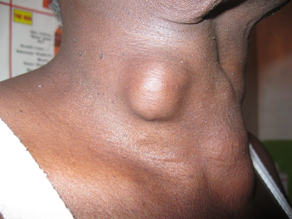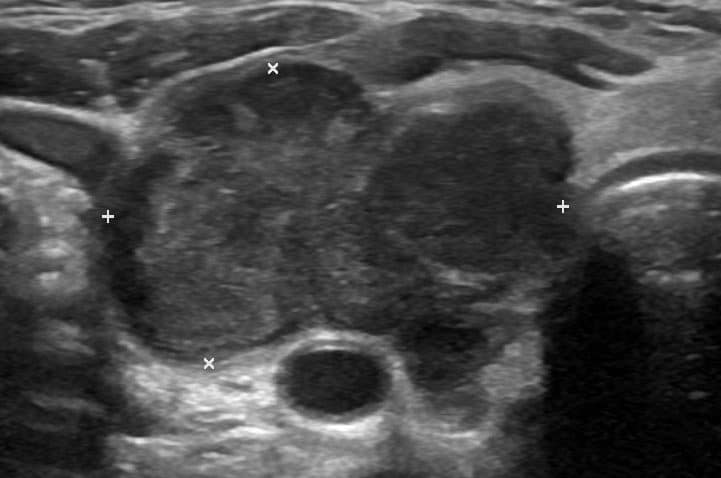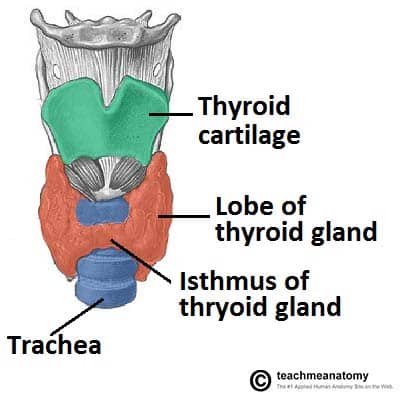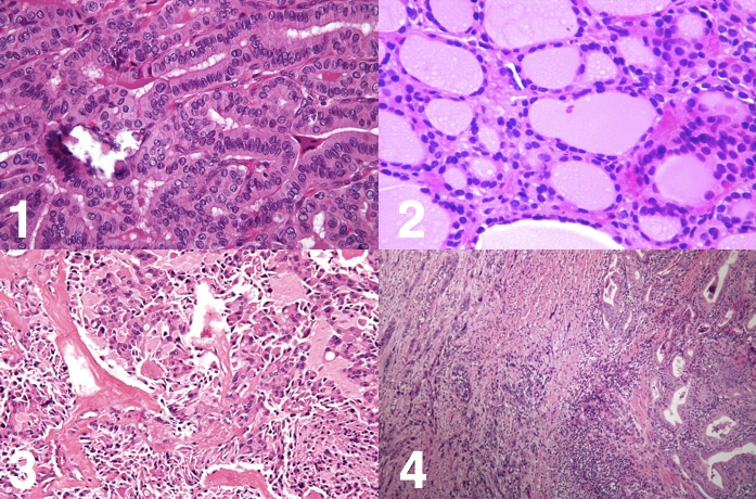 Thyroid lumps are a common presentation, seen in up to 5% of the population, however only a small proportion of them are cancerous. There are different types of cancer that can affect the thyroid gland, all of which can present with different features. The main types of thyroid cancer are papillary, follicular, medullary, anaplastic, and lymphoma. By TeachMeSeries Ltd (2020) Figure 1Anterior view of the neck, showing the anatomical position of the thyroid gland Thyroid Cancer Subtypes Papillary Carcinoma This is the commonest type of thyroid cancer (75%), most commonly seen between 40-50 years and in women. There can be multiple lesions within the gland and they are rarely encapsulated. Histologically, cells are a mixture of papillary and colloid-filled follicles, with papillary projections and pale empty nuclei. They commonly spread via the lymphatics. Follicular Carcinoma Usually seen at 40-60 years and in women, the second most common thyroid malignancy (15%). They present as focal encapsulated lesions (multifocal disease is rare), with microscopic capsular invasion*. Where metastasis occurs, it is usually via haematogenous spread to bones and lungs. *Hurthle cell tumours are a variant of follicular neoplasms in which oxyphil cells predominate Medullary Carcinoma These make up around 3% of thyroid cancers and arise in the parafollicular cells (C-cells, derived from the neural crest cells). Consequently, they produce raised calcitonin levels and are associated (20% of cases) with MEN 2 syndrome (both 2a and 2b). Medullary carcinoma can spread by both lymphatic and medullary routes; unfortunately nodal disease is associated with a very poor prognosis. Anaplastic Thyroid Cancer These rare tumours, accounting for 5% of thyroid cancers, usually present in older patients (mean age of diagnosis 65yrs old) and are more common in women. Approximately 20% of patients with anaplastic cancer have a history of differentiated thyroid cancer. They tend to be very aggressive, grow rapidly with early local invasion and regional or distant spread is apparent by the time of presentation in 90% of cases. Prognosis is poor and treatment is often supportive. Lymphoma Thyroid lymphomas are very rare, making up only 1-2% of all thyroid cancers. They usually present in people >60yrs old. Patients with Hashimoto’s disease are at higher risk of developing thyroid lymphomas. They may grow quite rapidly, with marked compressive symptoms and B-Cell symptoms. Adapted from work by Nephron (1,3,4), Yale Rosen (2) [CC BY-SA 3.0], via Wikimedia Commons and Flickr Figure 2Histological slides of the thyroid cancer subtypes: (1) Papillary (2) Follicular (3) Medullary (4) Anaplastic Risk Factors Female gender Family history – 10x increased risk for those with a first-degree relative with thyroid cancer Includes relevant cancer syndromes, e.g. medullary subtype associated with Multiple Endocrine Neoplasia (MEN) Syndrome type IIa and IIb Radiation exposure in childhood Full body radiotherapy for bone marrow transplant Hashimoto’s disease Predisposes to lymphoma subtype Clinical Features Thyroid cancers may present as a palpable lump, multiple lumps, or be found incidentally on imaging of the neck. The red flag clinical signs to be aware of with any neck lump that may suggest a malignancy are: Rapid growth or pain Pressure symptoms, such as dysphagia Cough, hoarse voice, or stridor Multiple enlarged cervical lymph nodes Tethering of the lump to surrounding structures Differential Diagnosis It is important to remember that most lumps or swellings of the thyroid are not malignant, however some of them may still require surgical intervention for diagnosis or management. Benign thyroid adenoma or thyroid cyst Toxic multi-nodular goitre Toxic refers to excessive productive of thyroid hormone which results in the clinical features of hyperthyroidism Non-toxic multi-nodular goitre Thyroglossal duct cyst* (not in the thyroid itself) Will move superiorly as the patient sticks out their tongue *Thyroglossal cysts, prior to any suggested removal, should be fully investigated with ultrasound thyroid as the as the cyst may be the only functioning thyroid tissue that the patient has therefore should not be removed. Adapted from John Campbell, [CC BY-SA 1.0], Figure 3A thyroid neck lump Investigations Most patients with a neck lumps should have initial Thyroid Function Tests* (TFTs) performed. Any evidence of a toxic nodule (low TSH or raised T3 or T4, or radio-nucleotide imaging showing a “hot” nodule) has a lower likelihood of malignancy. *Serum calcitonin may be useful for the diagnosis and monitoring of treatment response in medullary carcinoma. Most cases of suspected thyroid malignancy require ultrasound thyroid scan (Fig. 4), used to assess the nodule and look for cervical lymphadenopathy. Suspicious features on ultrasound include: Microcalcifications Hypoechongenicity Irregular margin Increased vascularity Classification Interpretation U1 Normal (no nodules) U2 Benign nodules U3 Indeterminate U4 Suspicious features of malignancy U5 Definite malignancy Table 1 – Ultrasound classification of thyroid nodules As a general rule, U1-U2 lesions have low risk of malignancy and will not require fine needle aspiration cytology (FNAC), U3-U5 lesions should undergo Fine Needle Aspiration Cytology (FNAC, see below) By Mme Mim (Own work) [CC BY-SA 4.0], via Wikimedia Commons Figure 4Ultrasound scan showing an Anaplastic Thyroid Malignancy Fine Needle Aspiration Cytology (FNAC) involves passing a needle into the thyroid nodule and aspirating cells out of it. These cells will be reviewed and the relevant score allocated (Thy1-Thy5); the TNM staging system is used for thyroid cancers once diagnosis is confirmed: Thy1 is inconclusive and requires a further sample Thy2 is benign lesion (may need a repeat sample if suspicious features of ultrasound) Thy3 is an indeterminate lesion (possible malignancy), either atypia or a follicular neoplas