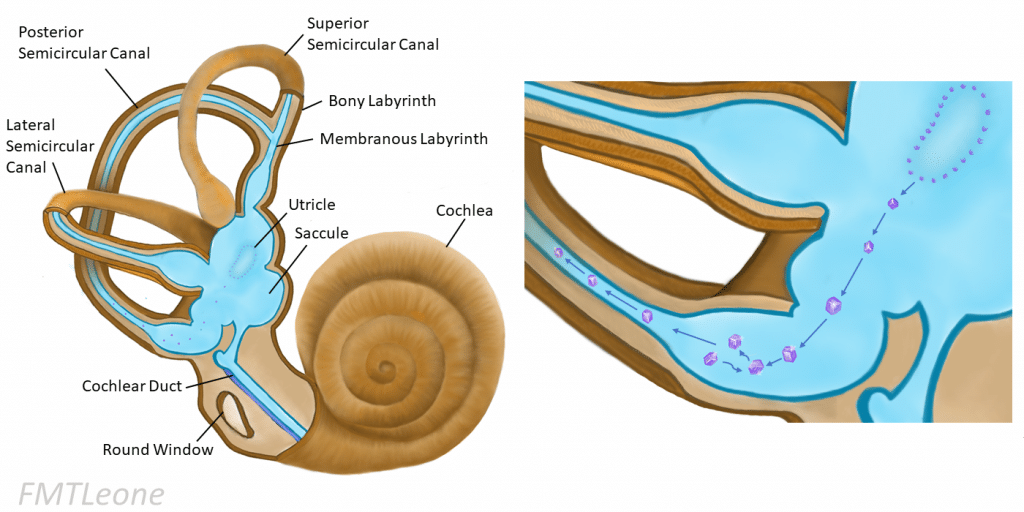 Vertigo is a specific symptom of hallucination of movement or spinning of the environment, often resulting in issues with balance. Whilst aetiology varies, all causes of vertigo produce a conflict between the vestibular input and other sensory inputs of balance (i.e. proprioception and vision), resulting in the sensation of vertigo. The causes of which can be divided into central or otological: Central causes of vertigo include multiple sclerosis, posterior stroke, migraine, or intracranial space occupying lesion Otological causes of vertigo include Benign Positional Paroxysmal Vertigo, Meniere’s Disease, and Vestibular Neuronitis Balance disorders can be multifactorial and have a wide range of causes outside of disorders of the vestibular system or brain. It is important to consider alternative medical issues, such as circulatory/cardiac disease and metabolic issues. Indeed, in the acute setting, the most critical diagnosis to exclude is a posterior circulation stroke. Adobe Stock, Licensed to TeachMeSeries Ltd Figure 1The hallucination of movement felt with vertigo Benign Positional Paroxysmal Vertigo Benign Positional Paroxysmal Vertigo (BPPV) is caused by the presence of canaliths in the semi-circular canal instead of the utricle (Fig. 2). Once in the canal, movement of the patient’s head will result movement of these crystals that cause an abnormal movement of endolymph, resulting in vertigo. Risk factors for BPPV include head injury, previous history of labyrinthitis, and older patients. That said, in most patients it is unprovoked. Clinical Features In BPPV, vertigo attacks last seconds and result from the same head movement causing the onset of symptoms every time. Accompanying symptoms typically include nausea or vomiting. A classical history is of vertigo when turning the head, e.g. movement of the head on the pillow in the morning. By Francesca Leone, TeachMeSurgery [CC-BY-NC-ND 4.0] Figure 2Formation of crystals and their migration into the semi-circular canals in BPPV Management The diagnostic examination for BPPV is the Dix-Hallpike manoeuvre, with a positive test invoking the symptoms and nystagmus* will be present. The nystagmus will typically fatigue in less than a minute. Once the condition is diagnosed, specific manoeuvres can be employed to remove the crystals from the canal and resolve the symptoms. A common manoeuvre is Epley’s Manoeuvre, performed if the canalith are in the posterior canal. Patients post-Epley’s manoeuvre are advised not to drive, to keep sleep upright, not to bend down or look upwards for 48 hours. Resolution is not always complete, with some patients requiring repeated Epley’s as symptoms persist, and BPPV can also recur. Patients can also be advised to perform Brandt-Daroff exercises, positions they can practice at home that are beneficial in reducing symptom intensity. *Most commonly crystals form in the posterior canal, resulting in a rotatory nystagmus to be present; if in the horizontal canal then result in a horizontal nystagmus. Meniere’s Disease Meniere’s Disease is a disorder comprised with a triad of symptoms including vertigo, hearing loss, and tinnitus. Current theories in its pathophysiology suggest the symptoms result from an increase in endolymphatic pressure. Caused by dysfunctioning sodium channels, an osmotic gradient is subsequently set up that draws fluid into the endolymph, increasing the endolymphatic pressure to cause symptoms. By TeachMeSeries Ltd (2020) Figure 3The components of the membranous labyrinth Clinical Features Meniere’s disease presents with attacks comprised of a triad of severe paroxysmal vertigo, sensorineural hearing loss, and tinnitus. Symptoms are predominantly unilateral, lasting for minutes to hours, and usually resolve within 24 hours. During remission between attacks, the symptoms will improve yet repeated attacks result in a sensorineural hearing loss that worsens over time. Whilst the disease will burn out eventually with time, permanent sensorineural hearing loss can remain. Investigation and Management Otoscopy will show a normal ear drum, audiometry will show a low frequency sensorineural hearing loss, and tympanometry will show type A (normal). In acute attacks, the vertigo and nausea symptoms can be reduced by a short course of prochlorperazine (a vestibular sedative), given either buccal or intramuscular. Some conservative measures have been suggested to aim to reduce attack frequency such as lifestyle advice (reducing salt or avoiding chocolate and caffeine) and regular betahistine medication. If attacks persist despite prophylaxis, surgical intervention may be warranted. This can include intratympanic gentamicin injections, intratympanic steroid injections, endolymphatic sac destruction, or labyrinthectomy (now rarely performed). Vestibular Neuronitis Vestibular neuronitis is inflammation of the vestibular nerve, resulting in vertigo that typically lasts days but can last weeks to months. Most cases are due to a viral infection, with a upper respiratory tract infection preceding its onset in half of cases. Clinical Features Symptoms will be sudden onset and severely incapacitating, nearly always associated with nausea and vomiting. On otoscopy, the ear drum will be normal and a horizontal nystagmus will be present when examining the eyes. Neurological examination will be unremarkable and the hearing for these patients will be normal. Whilst most cases resolve fully within a week; long-term vestibular deficit after the acute episode can lead to unsteadiness over a period of weeks whilst the brain compensates for this. Investigation and Management In an acute presentation of dizziness, assessment of a central neurological cause is essential, especially for posterior circulation stroke. Initially this typically involves CT head imaging and, if any uncertainty persists, a subsequent MRI head scan. Once diagnosed, however, most patients can be managed at home. During the acute epi