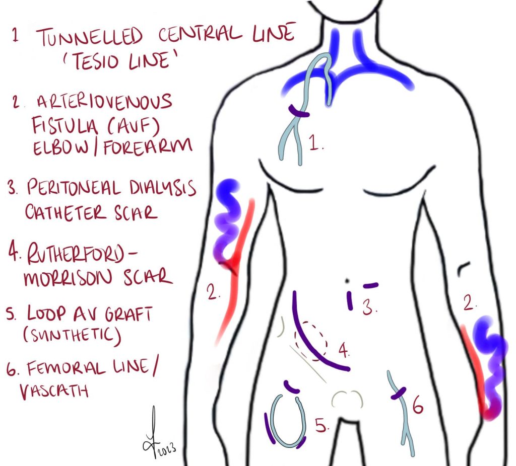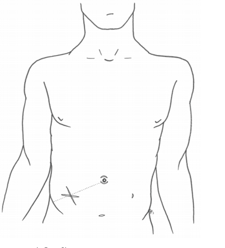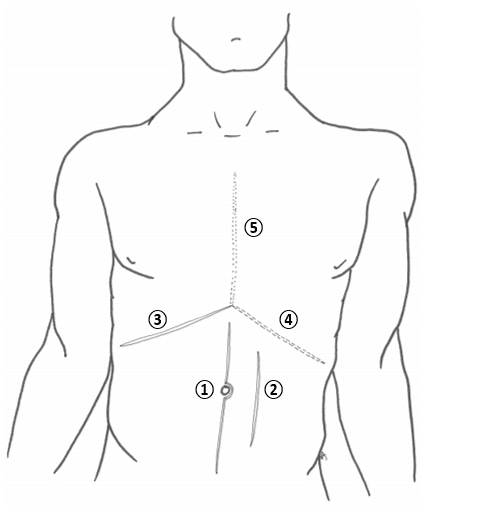A surgical incision is an aperture into the body to permit the work of the operation to proceed. In general surgery, the routinely used incisions include the Lanz incision and midline incision. Principles of Surgical Incisions The specific surgical incision will depend on the underlying pathology, site, patient factors, and the surgeon’s preference and experience. The key principles of making surgical incisions are: Incisions should try to follow Langer’s lines where possible, for maximal wound strength with minimal scarring Muscles should be split and not cut (where possible) Once the operation is over, surgical excisions can be closed by sutures, staples, steri-strips, tissue glue, or a combination of these agents. The wound can be covered in a protective dressing and kept dry for a few days, before normal washing can resume. Post-operative antibiotics may be warranted depending on the degree of contamination. Non-absorbable sutures or staples must be removed; the time when they are removed may vary depending on the site and indication of the closure. Advise the patient should be advised to seek advice if any signs of infection or wound dehiscence. Lanz Incision and Gridiron Incision The Lanz and Gridiron incisions are two incisions that can be used to access the appendix, predominantly for appendicetomy. Both incisions are made at McBurney’s point (two-thirds from the umbilicus to the anterior superior iliac spine). They involve passing through all of the abdominal muscles, transversalis fascia, and then the peritoneum, before entering the abdominal cavity. The Lanz incision is a transverse incision, whilst the Gridiron incision is oblique (superolateral to inferomedial). Due to its continuation with Langer’s lines, the Lanz incision produces much more aesthetically pleasing results with reduced scarring. By Aimee Rowe, TeachMeSurgery [CC-BY-NC-ND 4.0] Figure 1Lanz (transverse) and Gridiron (oblique) incisions at McBurney’s point. Midline Incision The midline incision (no. ①) is used for a wide array of abdominal surgery, as it allows the majority of the abdominal viscera to be accessed. A midline laparotomy can run anywhere from the xiphoid process to the pubic symphysis, passing around the umbilicus. The incision will cut through the skin, subcutaneous tissue, and fascia, the linea alba and tranversalis fascia, and the peritoneum before reaching the abdominal cavity. As well as obtaining significant exposure of the viscera, this incision causes minimal blood loss or nerve damage, and can be used for emergency procedures. Its positioning however does make it susceptible to significant scars. Paramedian Incision The paramedian incision (no. ②) is rarely performed in the UK. It was originally used to access much of the lateral viscera, such as the kidneys, the spleen, and the adrenal glands. The incision runs 2-5cm lateral to the midline, cutting through the skin, subcutaneous tissue, and the anterior rectus sheath. The anterior rectus sheath is separated and moved laterally, before the excision is continued through the posterior rectus sheath (if above the arcuate line) and the transversalis fascia, reaching the peritoneum and abdominal cavity. The incision will take a long time and is often technically difficult, however it does prevent any division of the rectus muscle and provides access to lateral structures. A paramedian incision can damage the muscles’ lateral blood and nerve supply, which may result in the atrophy of the muscle medial to the incision. Kocher Incision A Kocher incision (no. ③) is a subcostal incision used to gain access for the gall bladder the biliary tree. The incision is made to run parallel to the costal margin, starting below the xiphoid and extending laterally. The incision will then pass through the all the rectus sheath and rectus muscle, internal oblique and transversus abdominus, before passing through the transversalis fascia and then peritoneum to enter the abdominal cavity. Two modifications and extensions of the Kocher incision are possible: Chevron / rooftop incision or modification (no. ④) – the extension of the incision to the other side of the abdomen. This may be used for oesophagectomy, gastrectomy, bilateral adrenalectomy, hepatic resections, or liver transplantation Mercedes Benz incision or modification (no. ⑤) – the Chevron incision with a vertical incision and break through the xiphisternum This may be used for the same indications as the Chevron incision, however classically seen in liver transplantation Whilst open procedures that come with inherent drawbacks, all these subcoastal incisions provide the surgeon with good exposure to the abdominal viscera and tend to heal well. By Aimee Rowe, TeachMeSurgery [CC-BY-NC-ND 4.0] Figure 2Common abdominal incisions. ① Midline incision, ② Paramedian incision, ③ Kocher incision, ④ Rooftop modification and ⑤ Mercedes Benz modification Laparoscopic Port Sites Laparoscopic surgery (keyhole surgery) requires small incisions to be made in the skin, which allow instruments to be passed into the abdominal cavity. Common instruments include the camera, cutting and dissecting scissors, and grippers. The port sites will vary depending on the surgery being performed, yet the umbilicus is nearly always utilised as a port site to allow the camera to pass through. Scars in Transplant Patients who have had an organ transplant, such as a kidney transplant or liver transplant, can often have multiple scars present, both from the index procedure and from previous or current access sites (Fig. 3). By Rebecca Varley, TeachMeSurgery [CC-BY-NC-ND 4.0] Figure 3Illustration showing the potential scars in a kidney transplant patient Key Points A surgical incision is an aperture into the body to permit the work of the operation to proceed The specific surgical incision will depend on the underlying pathology, site, patient factors, and the surgeon’s preference and experience Incision