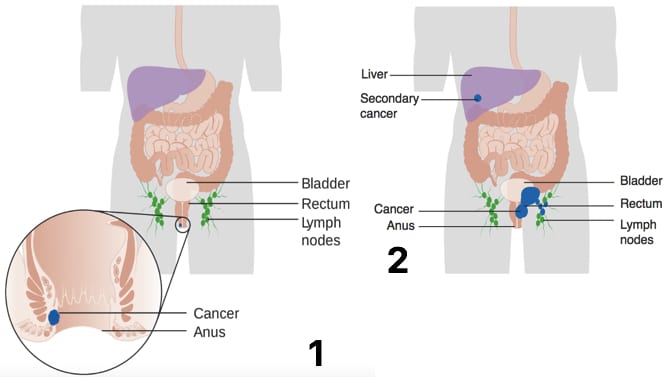 Anal cancer is a relatively rare cancer of the gastrointestinal tract, accounting for around 4% of colorectal cancers and has a UK incidence of approximately 1 in 100,000. The majority of anal cancers are squamous cell carcinomas, arising from below the dentate line (Fig. 1). The remainder (~10%) are adenocarcinomas arise from the upper anal canal epithelium and the crypt glands. Less common anal tumours include melanomas and anal skin cancers. A pre-cancerous condition, anal intraepithelial neoplasia (AIN), may precede the development of invasive squamous anal carcinoma. Anal Intraepithelial Neoplasia Anal intraepithelial neoplasia (AIN) is a precancerous condition that can affect either the perianal skin or anal canal, linked to the development of squamous cell carcinoma. It is strongly linked to infection with the human papilloma virus (HPV). The grading of AIN is dependent on the degree of cytological atypia and the depth of that atypia in the epidermis. High-grade AIN (grade 2 or 3) is premalignant and may progress to invasive cancer. Risk Factors The risk factors for developing anal cancer include HPV infection (accounts for 80-90% of cases, especially HPV-16 and HPV-18), HIV infection, increasing age, smoking, immunosuppression, or Crohn’s disease. By TeachMeSeries Ltd (2020) Figure 1The anal columns, anal valves, and pectinate line Clinical Features The main symptoms of anal cancer are rectal pain or rectal bleeding, occurring in around half of patients. Other symptoms may include anal discharge, pruritus, or the presence of a palpable mass. Recurrent perianal infection can be seen in locally invasive disease. If the anal sphincters have been involved, faecal incontinence and tenesmus can also occur. On examination, the perineal and perianal regions should be screened for any ulceration or the presence of wart-like lesions. Any mass felt on PR exam should be documented along with its distance from the anal verge and the proportion of anal circumference involved. The inguinal lymph nodes should be examined for any lymphadenopathy*. *Lymph from the area below the dentate line drains to the superficial inguinal nodes, whereas the anal canal and rectum above the dentate line drain into the mesorectal, para-aortic, and paravertebral nodes. Dr. K.-H. Günther, Klinikum Main Spessart, Lohr am Main, CC BY 3.0 <https://creativecommons.org/licenses/by/3.0>, via Wikimedia Commons Figure 2A squamous cell carcinoma of the anus Differential Diagnosis The main differentials for an anal cancer include thrombosed haemorrhoids, anal warts, low rectal cancer, or skin cancer. Investigations Initial Investigations Following initial examination, proctoscopy should be performed to obtain a better initial assessment of the anal canal. All patients with suspected anal cancer should then undergo examination under anaesthetic (EUA) of the rectum. An EUA rectum allows for much better assessment for tumour size and invasion of local structures, as well as allowing a biopsy to be taken for histological confirmation. In women, a smear test may be necessary to exclude any cervical intraepithelial neoplasia (CIN) and any further biopsies if signs of vulval intraepithelial neoplasia (VIN) are present. Consider a HIV test, especially those with risk factors. Imaging Once the diagnose has been confirmed by biopsy, further staging investigations (Fig. 3) are required: Ultrasound-guided Fine Needle Aspiration (FNA) of any palpable inguinal lymph nodes CT scan of chest-abdomen-pelvis for evidence of metastases MRI pelvis to assess the extent of local invasion (T stage) By Cancer Research UK (Original email from CRUK) [CC BY-SA 4.0], via Wikimedia Commons Figure 3Diagram showing the (1) Stage 1 and (2) Stage 4 anal cancer metastasis Management A multidisciplinary approach must be used in the management of anal cancer, including oncologists, general surgeons, radiologists, and specialist nurses. Chemo-radiotherapy is often the first choice treatment for anal tumours (expect from T1N0 carcinomas, whereby wide local excision surgical treatment is usually sufficient). Treatment is usually via external beam radiotherapy to the anal canal and inguinal lymph nodes, combined with dual-chemotherapy agents, such as mitomycin C and 5-fluorouracil. Surgical Management Surgical excision is usually reserved for management of advanced disease, after failure of chemoradiotherapy, or in early T1N0 carcinomas. The majority of patients requiring surgical intervention for anal cancer will receive an abdominoperineal resection (APR), yet for some a posterior or total pelvic exenteration is required. Patients should be reviewed every 3–6 months initially. Most recurrences occur in the first 3 years following surgery and will tend to relapse locally and regionally rather than have spread distant. Complications Chemoradiation-related pelvic toxicity is the most common short term complication, which can present with dermatitis, diarrhoea, proctitis, and/or cystitis. Longer term, patients may develop fertility issues, faecal incontinence, vaginal dryness, erectile dysfunction, and rectovaginal fistula. Prognosis is related to the initial staging of the tumour (Table 1). Tumour Stage 5 Year Survival (%) I 69.5 II 61.8 IIIa 45.6 IIIb 39.6 IV 15.3 Table 1 – Five year survival rates of anal cancer Key Points Pain and bleeding are the most common symptoms in anal cancer All patients with suspected anal cancer should undergo examination under anaesthesia of the rectum Chemo-radiotherapy is first line curative treatment for the majority of patient Do you think you’re ready? Take the quiz below Pro Feature - Quiz Anal Cancer Question 1 of 3 Submitting... Skip Next Rate question: You scored 0% Skipped: 0/3 Keep your streak going Unlock the full question bank You’ve made a great start. Continue with over 1,200 MRCS-style MCQs, two full mock papers, and ad-free revision with TeachMeSurgery Pro. Continue with Pro Rate This Article