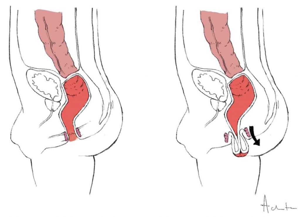 A rectal prolapse is the protrusion of mucosal or full-thickness layer of rectal tissue out of the anus. It is a relatively uncommon condition, affecting about 2.5 per 100 000 individuals each year in the UK, mainly affecting older females. There are two main types* of rectal prolapse: Partial thickness – the rectal mucosa protrudes out of the anus Full thickness – the rectal wall protrudes out the anus In this article, we shall look at the pathophysiology, clinical features, and management of rectal prolapse. *Internal intussusception is the prolapse of the rectum into the distal rectum or anal canal but without its protrusion outside of the anus Pathophysiology The current theories surrounding full prolapse suggest that is a form of sliding hernia, through a defect of the fascia of the pelvic region. This may be caused by chronic straining secondary to constipation, a chronic cough, or from multiple vaginal deliveries. In contrast, partial thickness prolapses are associated with the loosening and stretching of the connective tissue that attaches the rectal mucosa to the remainder of the rectal wall. This often occurs in conjunction with long standing haemorrhoidal disease. By Mohit Achanta, TeachMeSurgery [CC-BY-NC-ND 4.0] Figure 1Schematic demonstrating a rectal prolapse Risk Factors The main risk factors for rectal prolapse are increasing age, female gender, multiple deliveries, straining, anorexia, and previous traumatic vaginal delivery. Clinical Features Patients with a rectal prolapse will typically present with rectal mucus discharge, faecal incontinence, per rectum bleeding, or with visible ulceration. Full thickness prolapses (Fig. 2) will begin internally and thus can initially present with a sensation of rectal fullness, tenesmus, or repeated defecation. On examination, the prolapse may not always be evident, but can be identified by asking the patient to strain. A digital rectal examination should be performed, often on which a weakened anal sphincter is identified. For a suspected internal prolapse, defecating proctography and examination under anaesthesia may be the only means to diagnose clinically. By Mohit Achanta, TeachMeSurgery [CC-BY-NC-ND 4.0] Figure 2Appearances of a full thickness rectal prolapse Management Conservative management of rectal prolapse is more common in those unfit for surgery, with minimal symptoms, or in children (as most prolapses in children will resolve spontaneously). Initial management often involves increasing dietary fibre and fluid intake. Minor mucosal prolapses may be banded in clinic, although this is prone to recurrence. Surgical Management Surgical repair is the only definitive management. The mainstay of treatments is between the abdominal approach and the perineal approach: Perineal approach The two more commonly performed operations are the Delormes operation (the prolapsed lining of the rectal mucosa is removed and the underlying muscle reinforced with plicated sutures) and the Altemeier’s operation (resection of the redundant prolapsed bowel to restore the original anatomy) Abdominal approach Performed laparoscopically (most common), robotically, or open, the procedure will involve a rectopexy, whereby the rectum is mobilised and fixed onto the sacral prominence via sutures or mesh Overall, whilst studies have shown no difference in the post-operative outcomes between abdominal and perineal procedures, the perineal procedures are preferred in older patients as they are considered safer operations. Key Points Rectal prolapse can be either partial or full thickness prolapse Symptoms may include rectal mucus discharge, faecal soiling, or rectal bleeding Definitive management is via surgical repair, either by an abdominal or perineal approach Do you think you’re ready? Take the quiz below Pro Feature - Quiz Rectal Prolapse Question 1 of 3 Submitting... Skip Next Rate question: You scored 0% Skipped: 0/3 Keep your streak going Unlock the full question bank You’ve made a great start. Continue with over 1,200 MRCS-style MCQs, two full mock papers, and ad-free revision with TeachMeSurgery Pro. Continue with Pro Rate This Article
