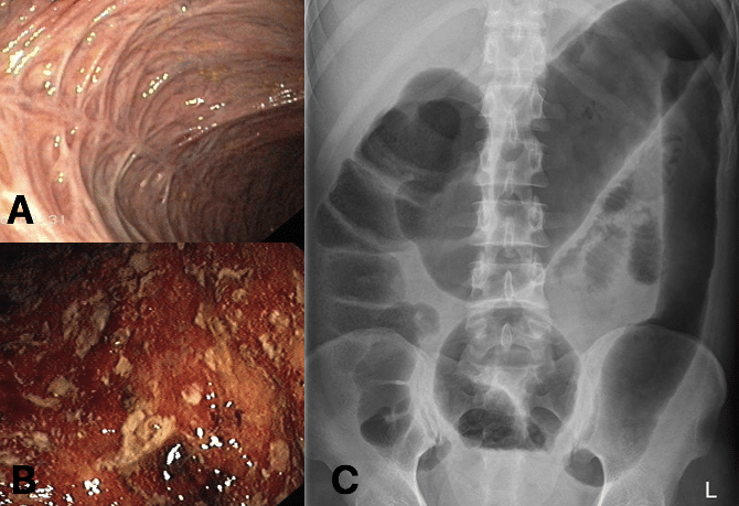 Ulcerative colitis (UC) is the most common form of inflammatory bowel disease, alongside Crohn’s disease (CD). It develops mainly through a combination of genetic predisposition and environmental exposures. There are approximately 5 million cases of ulcerative colitis around the world and incidence is increasing. The peak age of onset is between those aged 15-40yrs old, however incident cases in people >60yrs are increasing (accounting up to 20% of new diagnoses). Males and females are affected equally. The disease typically follows a remitting and relapsing course. A severe fulminant exacerbation may be life-threatening, resulting in severe systemic upset, toxic megacolon, colonic perforation, and even mortality. By KGH [CC-BY-SA-3.0], via Wikimedia Commons Figure 1Histology in ulcerative colitis, with non-granulomatous inflammation & crypt abscess formation Pathophysiology The pathogenesis of ulcerative colitis is complex and its aetiology remains incompletely understood. Current views suggest that it occurs after environmental exposures in individuals with a genetic predisposition, with epithelial barrier defects, dysregulated immune responses, and dysbiosis being key in initiating and perpetuating inflammation. It is characterised by diffuse continual mucosal inflammation of the large bowel, beginning in the rectum and spreading proximally. This can potentially affect the entire large bowel, with up to 20% cases also having terminal ileal involvement, termed “backwash ileitis”. Histological changes include non-granulomatous inflammation of the mucosa and submucosa, crypt abscesses (Fig. 1), and goblet cell hypoplasia (Table 1). Repeated cycles of ulceration and healing may lead to raised areas of inflamed tissue termed “pseudopolyps”. Much like Crohn’s disease, it appears to have a familial link. Ulcerative Colitis Crohn’s Disease Site Involvement Large bowel Entire gastrointestinal tract Inflammation Mucosal involvement only Transmural involvement Microscopic Changes Crypt abscess formation Reduced goblet cells Non-granulomatous Granulomatous (non-caseating) Macroscopic Changes Continuous inflammation (proximal from rectum) Pseudopolyps and ulceration Discontinuous inflammation (‘skip lesions’) Fissures and deep ulcers (‘cobblestone appearance’) Fistula formation Table 1 – Characteristic Features of Inflammatory Bowel Disease Clinical Features The most common manifestation of ulcerative colitis is proctitis, with inflammation confined to the rectum only. As such, the cardinal feature of ulcerative colitis is bloody diarrhoea, with visible blood in stool reported in more than 90% of cases. Symptoms are often present for several weeks before medical advice is sought. Other symptoms of UC include mucus discharge per rectum, increased stool frequency and urgency, and tenesmus. Patients presenting with more widespread colonic involvement may develop clinical features of dehydration or systemic symptoms such as malaise, anorexia, or low-grade pyrexia. In patients with an acute severe flare of ulcerative colitis, or particularly with toxic megacolon or colonic perforation, patients will complain of severe abdominal pain. On examination, such patients will be systemically unwell with signs of peritonism. Disease Grading The severity of an Ulcerative Colitis exacerbation can be graded using the Truelove and Witt criteria (Table 2). The severity degree is based on the presence of any one of the criteria: Criteria Mild Moderate Severe Bowel movements per day <4 4-6 >6 Blood in stool Minimal Mild to severe Visible blood Pyrexia No No Yes Pulse >90 bpm No No Yes Anaemia No No Yes ESR (mm/hour) ≤30 30 >30 Table 2 – Truelove and Witt Criteria Extra-Intestinal Manifestations Ulcerative colitis, much like Crohn’s disease, is associated with certain extra-intestinal manifestations of the disease, occurring in 20 – 35% of cases and can precede intestinal symptoms in up to 25% of patients: Musculoskeletal, such as enteropathic arthritis (most common, typically affecting sacroiliac and other large joints), osteoporosis, or nail clubbing Skin, such as Erythema Nodosum (tender purple subcutaneous nodules, typically on the shins, Fig. 2) or pyoderma gangrenosum Eyes, such as episcleritis, anterior uveitis, or iritis Hepatobiliary, such as primary sclerosing cholangitis* (chronic inflammation and fibrosis of the bile ducts) *Around 70% of patients with PSC will have IBD, whilst around 5% of patients with IBD will have PSC Adapted from work by ErikH from nl and James Heilman [CC-BY-SA-3.0 ] Figure 2Erythema nodosum is an extra-intestinal feature of ulcerative colitis Differential Diagnoses The primary differential diagnosis for ulcerative colitis is Crohn’s disease. However, alternative forms of colitis include chronic infections (schistosomiasis, giardiasis, or abdominal tuberculosis), mesenteric ischaemia, or radiation colitis. Other differentials to consider include malignancy, irritable bowel syndrome, or coeliac disease. Investigations For patients with a suspected diagnosis of Ulcerative Colitis, routine blood tests can be performed, to assess for evidence of any anaemia, low albumin (secondary to systemic illness), or inflammation (raised CRP and WCC). A faecal calprotectin test should be performed in all patents with recent onset lower gastrointestinal symptoms, which has a good sensitivity for inflammatory bowel disease. A stool MC&S sample should be sent to exclude an infective cause. Imaging Colonoscopy with biopsies is the most sensitive and specific tool to establish a diagnosis of ulcerative colitis (Fig. 3A and 3B). Endoscopic views will show continuous and circumferential inflammation, with a clear demarcation of inflammation determining the extent of disease. Biopsies taken will help confirm the diagnosis (and exclude other causes of colitis, including CMV colitis). Macroscopically, endoscopic findings in mild ulcerative colitis include erythema and vascular