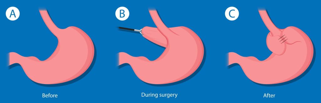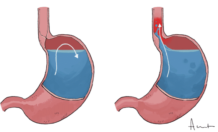 Gastro-oesophageal reflux disease (GORD) is a condition whereby gastric contents from the stomach leaks up into the oesophagus. It is a common problem, affecting around a quarter of the population in many countries to varying degrees of severity; GORD can represent around 4% of primary care appointments. It is twice as common in men compared to women. In this article, we shall look at the risk factors, clinical features and management of gastro-oesophageal reflux disease. Pathophysiology The lower oesophageal sphincter controls the passage of contents from the oesophagus to the stomach. As part of its normal function, episodic sphincter relaxation is expected, yet in patients with GORD these episodes become more frequent and allow the reflux of gastric contents into the oesophagus (Fig. 1). The repeated refluxed acidic gastric contents (or rarely alkaline bile) result in inflammation to the oesophageal mucosa. The presence of a hiatus hernia can increase these reflux episodes, due to disruption to the oesophageal sphincter. Patients with increased abdominal pressure, such as with pregnancy and obesity, will also have increase risk of reflux. By Mohit Achanta, TeachMeSurgery [CC-BY-NC-ND 4.0] Figure 1Illustration demonstrating Gastro-Oesophageal Reflux Disease Risk Factors The main risk factors for GORD include obesity, smoking, alcohol intake, pregnancy, and male gender. Clinical Features The main symptom of gastro-oesophageal reflux disease is chest pain. This is classically a burning retrosternal sensation, worse after meals, lying down / bending over, or straining, and can be relieved (at least partially) by antacids. Additional symptoms may include excessive belching, water brash sensation, or a nocturnal or chronic cough (or less commonly recurrent chest infections). Always check for red flag symptoms (dysphagia, weight loss, early satiety, malaise and loss of appetite) which may suggest an underlying malignancy. Examination is typically unremarkable. The Los Angeles Classification of Reflux The Los Angeles classification can be used to grade reflux oesophagitis based on severity from the endoscopic findings of mucosal breaks in the distal oesophagus: Grade A – breaks ≤5mm Grade B – breaks >5mm Grade C – breaks extending between the tops of ≥2 mucosal folds, but<75% of circumference Grade D – circumferential breaks (≥75%) Differential Diagnosis Important gastrointestinal differentials to consider include upper GI malignancy (oesophageal or gastric) or peptic ulcer disease It is also important not to miss cardiac or biliary disease, such as coronary artery disease or biliary colic, as they can be common mimics of the episodic reflux disease Investigations In most patients, a clinical diagnosis is reached simply from a good history and resolution of symptoms after a trial of a proton-pump inhibitor. However, the presence of any red-flag symptoms requires urgent further investigation for a suspected upper GI malignancy: Any patient with dysphagia Any patient >55yrs with weight loss and upper abdominal pain, dyspepsia, or reflux Patients with persistent symptoms, despite trialling conservative management By TeachMeSeries Ltd (2023) Figure 2The greater and lesser curvatures of the stomach Imaging 24hr pH monitoring is the gold standard for diagnosis of GORD (see below). It can quantify the burden of reflux disease and is especially important for patients in whom medical treatment has failed and surgery is considered. Patients with persistent GORD or those with red-flag symptoms will often undergo an upper GI endoscopy (OGD) to rule out any underlying malignancy present, to quantify any oesophagitis present, and to assess for any complications of reflux disease (such as Barrett’s oesophagus), The presence of a hiatus hernia can also be assessed for with endoscopy Oesophageal manometry is often used in severe cases to exclude any evidence of concurrent oesophageal dysmotility. pH Monitoring Studies pH monitoring studies assess various criteria such as the amount of time acid is present in the oesophagus and the correlation between the presence of acid and the patient’s symptoms. This produces an algorithmic score called the DeMeester score and can help determine a patient’s symptom / reflux correlation Management All patients with gastro-oesophageal reflux disease should be advised to take conservative steps in its management, including avoiding known precipitants (alcohol, coffee, fatty foods), weight loss, and smoking cessation, where appropriate Proton pump inhibitors (PPIs) are the first-line treatment and are very effective for the majority of patients. Symptoms tend to recur rapidly after ceasing to take PPIs and so many patients are likely to remain on them long-term (unless they proceed to surgery). Surgical Management There are three main indications for anti-reflux surgery in gastro-oesophageal reflux disease: Failure to respond (or only a partial response) to medical therapy Patient preference to avoid life-long medication Patients with complications of GORD* (in particular respiratory complications, such as recurrent pneumonia) Surgery has been shown to be more effective than medical treatment in terms of symptom relief, quality of life improvement, and cost. However, due to associated complications and side-effects, many patients are understandably reluctant to accept it. The main surgical intervention that can be offered for patients with GORD is a fundoplication (Fig. 3), whereby the gastro-oesophageal junction and hiatus are dissected and the fundus wrapped around the GOJ, recreating a physiological lower oesophageal sphincter. The hiatal opening in the diaphragm is then narrowed. Several different approaches to the procedure have been described, differing in direction and completeness of the wrap (such as the posterior 360 (Nissen’s) approach or the partial anterior). The main side-effects of anti-reflux surgery are dysphagia and bloating, however the