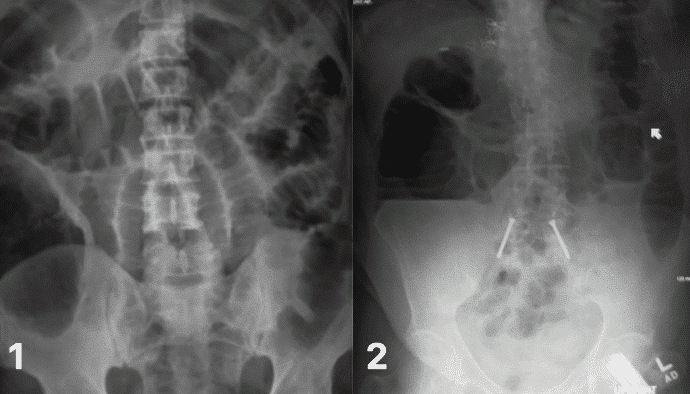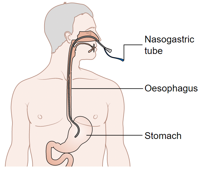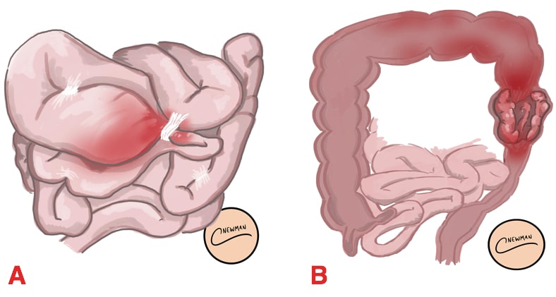 The term bowel obstruction refers to a mechanical blockage of the bowel, whereby a structural pathology physically blocks the passage of intestinal contents. Around 15% of acute abdomen cases are found to have a bowel obstruction. Patients can have bowel obstruction affecting the small bowel, the large bowel, or both. Once the bowel segment has become occluded, gross dilatation of the proximal limb of the bowel occurs. There becomes an increased peristalsis of the bowel, which in turn leads to secretion of large volumes of electrolyte-rich fluid into the bowel (often termed ‘third spacing’). Urgent fluid resuscitation and a careful fluid balance is required. *When the bowel is not mechanically blocked but is adynamic and not working properly, this is typically either an ileus or pseudo-obstruction Closed Loop Obstruction In patients with a mechanical bowel obstruction, if there is a second separate obstructing point proximally (e.g. a large bowel obstruction with a competent ileocaecal valve), this is termed closed-loop obstruction. A closed-loop obstruction is a surgical emergency as if not corrected, the bowel will continue to distend within a closed segment of bowel, stretching the bowel wall until it becomes ischaemic and this can further lead to perforation. Aetiology The most common causes of bowel obstruction depend on location: Small bowel – adhesions or hernia Large bowel – malignancy, diverticular disease, or volvulus The full list of causes of bowel obstruction can otherwise be divided into extramural, intramural, and intraluminal causes (Table 1) Location Causes Intraluminal Gallstone ileus, ingested foreign body, faecal impaction Mural Cancer, inflammatory strictures*, intussusception**, diverticular strictures, Meckel’s diverticulum, lymphoma Extramural Hernias, adhesions, peritoneal metastasis, volvulus Table 1 – Causes of bowel obstruction *especially in Crohn’s patients **most common in children Clinical Features Patients with bowel obstruction will present with the cardinal features of bowel obstruction (to varying degrees): Abdominal pain – colicky or cramping in nature (secondary to the bowel peristalsis) Vomiting – occurring early in proximal obstruction and late in distal obstruction Abdominal distension Absolute constipation – occurring early in distal obstruction and late in proximal obstruction On examination, patients may show evidence of the underlying cause (e.g. surgical scars, cachexia from malignancy, or obvious hernia) or abdominal distension. Ensure to assess the patient’s fluid status, as significant third-spacing can occur in bowel obstruction. Palpate for focal tenderness* (including guarding and rebound tenderness on palpation). Percussion may give a tympanic sound and auscultation may reveal ‘tinkling’ bowel sounds, both signs characteristic of bowel obstruction. *Patients with bowel obstruction may have abdominal tenderness, however should not have features of guarding or rebound tenderness, unless ischaemia is developing By Thomas Newman, www.thomasnewman.design, TeachMeSurgery [CC-BY-NC-ND 4.0] Figure 1(A) Small bowel obstruction secondary to adhesions (B) Large bowel obstruction secondary to malignancy Differential Diagnosis The differential diagnoses for a patient presenting with suspected bowel obstruction include pseudo-obstruction, paralytic ileus, toxic megacolon, or constipation Investigations Laboratory tests All patients with suspected bowel obstruction require routine urgent bloods on admission, as well as a Group and Save (G&S). Ensure to closely monitor renal function and electrolytes closely, given the risk of third-spacing. A venous blood gas can be useful to evaluate for end-organ and for the immediate assessment of any metabolic derangement (secondary to dehydration or excessive vomiting). Imaging A CT scan with intravenous contrast of the abdomen and pelvis (Fig. 2) is the imaging modality of choice in suspected bowel obstruction. This will not only confirm the presence of bowel obstruction (versus a pseudo-obstruction or paralytic ileus), but also demonstrate the underlying cause. By James Heilman, MD [CC BY-SA 3.0 (https://creativecommons.org/licenses/by-sa/3.0)], from Wikimedia Commons Figure 2CT scan demonstrating features of small bowel obstruction A plain abdominal radiograph (AXR) is still used in some settings as the initial investigation for bowel obstruction. The AXR findings (Fig. 3) seen in a patient with bowel obstruction are: Small bowel obstruction – Dilated bowel (>3cm), central abdominal location, and valvulae conniventes visible (lines completely crossing the bowel) Large bowel obstruction – Dilated bowel (>6cm, or >9cm if at the caecum), peripheral location, and haustral lines visible (lines not completely crossing the bowel, ‘indents that go Halfway are Haustra’) Adapted from work by James Heilman, MD [CC BY-SA 3.0], via Wikimedia Commons Figure 3Bowel obstruction as seen on AXR, showing (1) small bowel obstruction (2) large bowel obstruction Management The definitive management of bowel obstruction is dependent on the aetiology and the presence of any specific complications, such as bowel ischaemia or perforation. These patients are often intravascularly fluid deplete and need urgent fluid resuscitation, with careful attention paid to fluid balance (often several litres of intravenous fluid may be required in the first 24 hours). All patients with bowel obstruction should have a nasogastric tube (NG tube) inserted and most will require a urinary catheter Patients with closed loop bowel obstruction or evidence of bowel ischaemia will require urgent surgery. Conservative Management In the absence of signs of ischaemia or perforation, initial management for cases of adhesional bowel obstruction is conservative (with a success rate of around 80%), often referred to as a “drip and suck” management: Make the patient nil-by-mouth (NBM) and insert a nasogastric tube (Fig. 4) to de