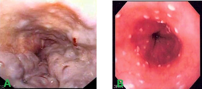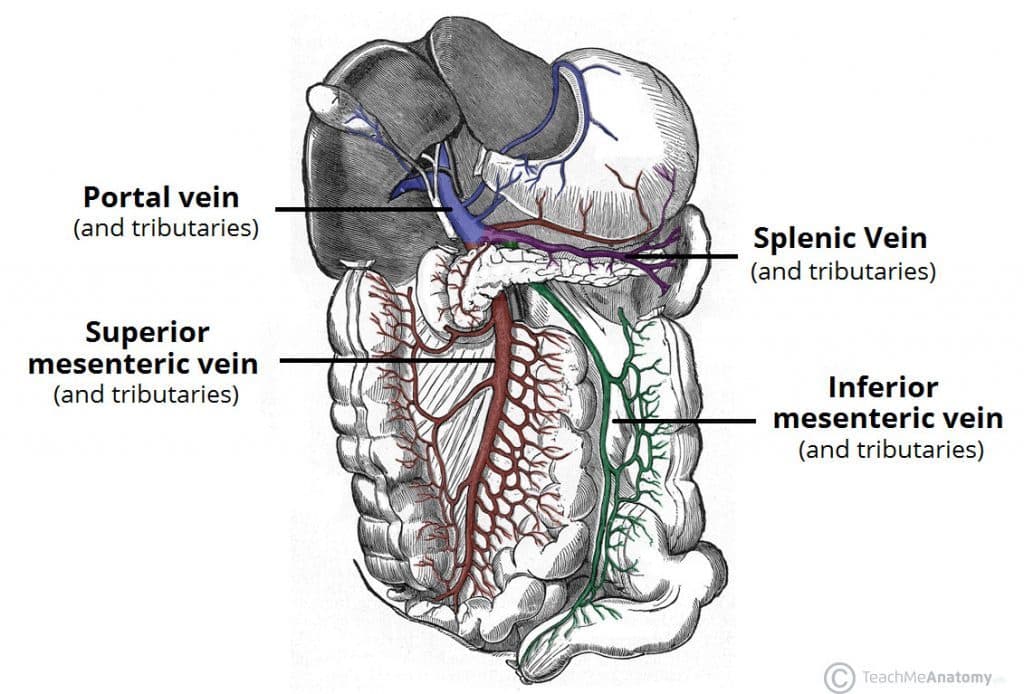 Haematemesis is defined as vomiting fresh blood. This occurs as a result of bleeding occurring in any part of the upper gastrointestinal tract. It has a wide range of causes and patients can present in a spectrum of illness severity. The management require depends on the underlying cause for the haematemesis. In this article, we shall look at the causes, investigations, and management of haematemesis. Differential Diagnosis Oesophageal Varices Oesophageal varices refer to dilations of the porto-systemic anastomoses in the oesophagus. They most commonly occur due to portal hypertension secondary to liver cirrhosis; the dilated veins are swollen and thin-walled, hence prone to rupture and the potential to cause a catastrophic haemorrhage (Fig 2A). The most common underlying cause for oesophageal varices is alcoholic-related liver disease (ArLD), however can occur with any patient with chronic liver disease. Any haematemesis in a patient with a known chronic liver disease should be urgently investigated for potential variceal bleeding. By TeachMeSeries Ltd (2025) Figure 1The portal venous system Peptic Ulcer Disease Peptic ulcer disease is responsible for about 60% of patients presenting with haematemesis. Peptic ulceration can result in erosion into the blood vessels supplying the upper GI tract (most commonly on the lesser curve of the stomach (20%) or posterior duodenum (40%)). which can result in significant haemorrhage. Whilst it can affect any patient group, it should be especially suspected in those with known active peptic ulcer disease, a recent history of NSAID use or steroid use, or known H. pylori infection. Mallory-Weiss Tear A Mallory-Weiss tear is a relatively common phenomenon, typified by episodes of severe or recurrent vomiting, then followed by minor haematemesis. Such forceful vomiting causes a tear in the epithelial lining of the oesophagus, resulting in a small bleed. Most cases are benign and will resolve spontaneously, therefore providing the patient reassurance and monitoring is usually all that is required. Oesophagitis Oesophagitis is a condition that describes inflammation of the intraluminal epithelial layer of the oesophagus, most often due to either reflux disease (GORD) or less commonly from infections (typically Candida Albicans, Fig 2B), medication (such as bisphosphonates), radiotherapy, ingestions of toxic substances, or Crohn’s disease. Other Causes Other less common causes of haematemesis include gastric cancer or oesophageal cancer, or vascular malformations (e.g. angiodysplasia). Based on work by Samir [CC-BY-SA-3.0], via Wikimedia Commons Figure 2Causes of haematemesis; (a) Oesophageal varices and (b) Oesophageal candidiasis Clinical Features The key facts to ascertain from a history of haematemesis are: Features of haematemesis – timing, frequency, and the volume of bleeding Associated symptoms – including dyspepsia, dysphagia, melena, or weight loss Past medical history – including the smoking & alcohol status Drug history – use of steroids, NSAIDs, anticoagulants, or bisphosphonates A full abdominal examination to assess for epigastric tenderness or peritonism, hepatomegaly, and for any stigmata of liver disease. Investigations Initial Investigations All patients with suspected haematemesis should undergo routine blood tests, including FBC, U&Es, LFTs, and clotting, to help investigate for underlying causes and to stratify patient risk Ensure all patients with haematemesis must have a Group and Save requested, and any haemodynamic instability should have blood urgently cross-matched too. Further Investigations All patients with haematemesis must undergo a gastroscopy (OGD) for further assessment. This will not only potentially identify the cause of the bleeding, but also can perform definitive intervention in certain cases (e.g. banding of varices) The urgency by which an OGD is performed should be determined by the patients Glasgow-Blatchford bleeding score (GBS), used to risk stratify patients based purely on clinical and biochemical parameters. After endoscopy, the Rockall score is used to predict mortality and rebleeding risk based on endoscopy findings. Glasgow-Blatchford Bleeding Score The Glasgow-Blatchford bleeding score (GBS) is a scoring system used to risk stratify patients admitted with an upper GI bleed, based purely on clinical and biochemical parameters. This allows for appropriate management of further investigations, especially as the score can be calculated prior to any gastroscopy. Interpretation will vary across endoscopy departments, but scores ≥6 have been associated with a >50% risk of needing an intervention. 1 2 3 4 5 6 Urea (mmol/L) 6.5-8.0 8.0-10.0 10.0-25.0 >25 Hb (g/L) 12.0-12.9 10.0-11.9 <10.0 Systolic BP 100-109 90-99 <90 Pulse (bpm) >100 Melena Present Syncope Present Known Hepatic Failure Present Cardiac Failure Present Table 1 – Glasgow-Blatchford scoring criteria In cases where the OGD is normal (or in certain scenarios where the patient cannot undergo endoscopic procedures), a CT angiogram can be performed if ongoing bleeding is suspected. Further embolisation of any active bleeding sites can then be considered if identified on angiogram* *In peptic ulcer disease, most commonly the gastro-duodenal artery is the cause of active bleeding (Fig. 3), having been eroded into by a posterior D1 ulcer By TeachMeSeries Ltd (2020) Figure 3The gastroduodenal artery seen running posterior to the duodenum Management In any critically unwell patient, an A to E approach should be used to stabilise the patient before considering definitive management steps, as patients with haematemesis can be extremely unstable. Any haemodynamically unstable patient with haematemesis should have large bore intravenous access obtained and urgent blood transfusion(s) given, for the patient to be stabilised (even if partially). Any deranged coagulation should be corrected as appropriate, which may include use of fresh frozen plasma (