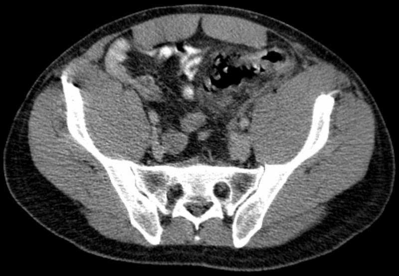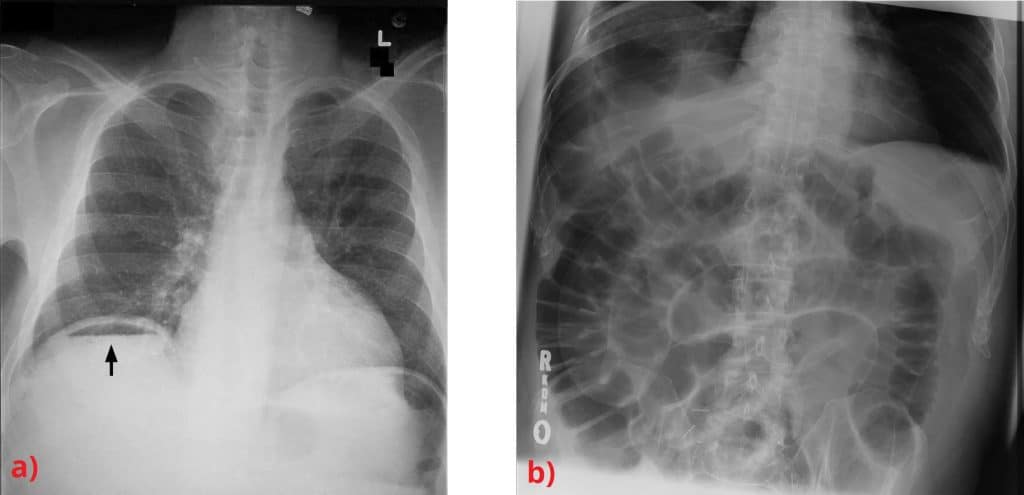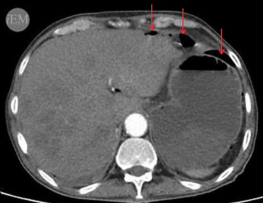 A gastrointestinal perforation can occur at any anatomical location of the alimentary canal, from the upper oesophagus to the anorectal junction. Delay in resuscitation and definitive surgery of any perforation will progress rapidly into septic shock, multi organ dysfunction, and death, hence it should be one of the first diagnoses considered in all patients who present with acute abdominal pain. In this article, we shall look at the causes, clinical features, and management of gastrointestinal perforation, mainly focusing on those patients presenting with a bowel perforation. Aetiology There are multiple causes of gastrointestinal perforation, varying dependent on the location of the GI tract involved: Upper GI tract Peptic ulcer disease Gastric cancer or oesophageal cancer Foreign body ingestion (e.g. battery or caustic soda) Excessive vomiting (Boerhaave Syndrome) Lower GI tract Diverticulitis (most common in higher-income countries) Colorectal cancer Appendicitis or Meckel’s Diverticulitis Foreign body insertion Severe colitis, such as Crohn’s Disease Toxic megacolon (e.g. from Clostridum Difficile or Ulcerative Colitis) Any part of the GI tract Iatrogenic, such as during gastroscopy or colonoscopy Trauma, either through penetrating or blunt mechanisms Mesenteric ischaemia Obstructing lesions (e.g. cancer, bezoar, or faeces/sterocoral), leading to bowel obstruction, with subsequent ischaemia and necrosis By Jiri.pekhart [CC BY-SA 3.0], via Wikimedia Commons Figure 1Endoscopic image of colorectal adenocarcinoma Clinical Features The main feature of gastrointestinal perforation is abdominal pain. Typically this is rapid onset and severe. Patients are systemically unwell and may also have associated malaise, vomiting, or lethargy. Further symptoms will be dependent on the underlying cause The degree of how unwell a patient is with gastrointestinal perforation is dependent on multiple factors, such as the type of perforation, timing of presentation, and patient co-morbidities and functional status On examination, patients will look unwell and often have features of sepsis. They will usually have features of peritonism, which may be localised or generalized (a rigid abdomen); generalised peritonitis implies diffuse contamination of the abdomen and the patient will be very unwell. Thoracic Perforation Any thoracic region perforation (such as a oesophageal rupture) will present with pain, ranging from chest or neck pain to pain radiating to the back, typically worsening on inspiration. There may be associated vomiting and respiratory symptoms. On examination, auscultation and percussion may reveal signs of a pleural effusion, with the potential for palpable crepitus. This is discussed in more detail here. Investigations Laboratory Tests Any patient with an acute abdomen will require urgent blood tests, including FBC, U&Es, LFTs, CRP, clotting, and G&S. Patients will have raised inflammatory markers (WCC and CRP). Depending on how unwell the patient is at time of presentation, blood tests may also show evidence of organ dysfunction (such as acute kidney injury or a coagulopathy), developing secondary to sepsis. Imaging The gold standard for diagnosis of any perforation is with a CT scan with intravenous contrast (Fig. 2) confirming the presence of free air and suggesting a location of the perforation (as well as a possible underlying cause). In cases of suspected upper GI perforation, a CT scan with oral contrast may be used, for better assessment. Hellerhoff, CC BY-SA 3.0 <https://creativecommons.org/licenses/by-sa/3.0>, via Wikimedia Commons Figure 2CT scan showing a patient with perforated sigmoid diverticulitis Classically, both a plain film erect chest radiograph (eCXR) and abdominal radiograph (AXR) were used for diagnosis, however are much less specific* compared to CT imaging. As such, in suspected cases, a CT scan should always be performed. *The sensitivity in detecting perforation on eCXR is around 70%, meaning 3 out of every 10 patients with a gastrointestinal perforation will have no signs on plain film radiograph CXR and AXR Features An eCXR may show air under the diaphragm in cases of pneumoperitoneum (Fig. 3a), whilst an AXR may show either Rigler’s sign (both sides of the bowel visible, Fig. 3b), or psoas sign (loss of the sharp delineation of the psoas muscle border) Adapted from work by Scott1751 and Clinical_Cases [CC BY-SA 2.5], via Wikimedia Commons Figure 3Radiographic evidence of pnuemoperitoneum a) Free air under the diaphragm; and b) Rigler’s sign Management The management of any suspected gastrointestinal perforation warrants an early resuscitation, prompt diagnosis, and definitive treatment. Broad spectrum antibiotics should be started early. Patients should be placed nil by mouth (NBM) and a nasogastric tube inserted if required. Provide adequate intravenous fluid resuscitation and appropriate analgesia. Following this standard initial approach, management becomes highly individualised, taking into account the site of perforation and patient factors. Most patients with a perforated viscus will require theatre for repair and control of contamination. Adapted from Ekrem Musalar on Flickr (CC BY-NC-SA 2.0) Figure 4CT scan showing free intra-peritoneal gas (arrows) Surgical Intervention The key aspects of any surgical intervention for a GI perforation are: Identification of the underlying cause Appropriate management of perforation Thorough washout The surgical technique employed varies depending on the pathology and the anatomical location involved. The most important aspect of any surgery for perforation however remains the intra-operative washout Peptic ulcer perforation can be accessed typically either open or laparoscopically and a patch of omentum (termed a “Graham patch”) is tacked loosely over the ulcer Small bowel perforation should be managed with a bowel resection +/- primary anastomosis +/- stoma formation; on occasion, small perforations (e.g