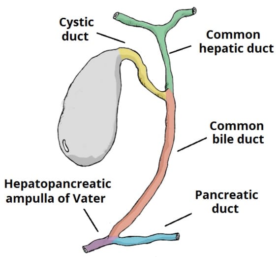 Cholangiocarcinoma is a malignancy of the biliary system. It can occur at any site along the biliary tree, although predominantly arises in the extrahepatic biliary system; incidence of intrahepatic cholangiocarcinoma is increasing for unknown reasons. The incidence is 1-2 per 100,000 population per year in many high-income setting, with over two-thirds of these cases in patients >65yrs. There is a higher incidence in South-East Asia due to the association with chronic endemic parasitic infections from liver flukes, as well as the likely contribution of chronic hepatitis C infection. Histologically, 95% of bile duct cancers are adenocarcinomas, arising from cholangiocytes within the biliary tree with squamous cell carcinomas and other rarer types of bile duct cancers include sarcomas, lymphomas, and small cell cancers seen. Klatskin Tumours The most common site for bile duct cancers is at the bifurcation of the right and left hepatic ducts, termed Klatskin tumours or hilar cholangiocarcinoma, and account for 60% of cholangiocarcinoma. These tumours generally invade local structures, such as the portal vein and hepatic arteries, and metastasise to local lymph nodes, before spreading to the peritoneal cavity, lung, and liver. In this article, we shall look at the risk factors, clinical features and management of a patient with cholangiocarcinoma. Risk Factors The main risk factors for cholangiocarcinoma include: Primary sclerosing cholangitis (lifetime risk of 10-20%) More likely to have multifocal disease Congenital (Caroli’s disease, choledochal cyst) Intraductal gallstone formation Infective (Liver flukes, hepatitis virus) Toxins (Chemicals in rubber and aircraft industry) Liver cirrhosis By TeachMeSeries Ltd (2025) Figure 1Anatomy of the biliary tree Clinical Features Intrahepatic cholangiocarcinoma is generally asymptomatic until a late stage in the disease, whereas extrahepatic cholangiocarcinoma will typically present early. Patients will present with jaundice, along with associated pruritus, steatorrhoea, non-specific abdominal pain, or dark urine. In advanced disease, weight loss and lethargy can occur. On examination, jaundice and cachexia are often evident. Courvoisier’s law can be applied in clinical assessment. Courvoisier’s Law Courvoisier’s law states that in the presence of jaundice and an enlarged or palpable gallbladder, malignancy of the biliary tree or pancreas should be strongly suspected as the cause is unlikely to be gallstones. Investigations Biochemical investigations will confirm an obstructive jaundice (elevated bilirubin, ALP, and ɣGT). The tumour markers CEA and CA19-9 may also be elevated, but are non-specific and generally less useful in diagnosis. The mainstay of diagnosis comes from radiology*. *Ultrasound scanning may initially show dilated biliary ducts and on occasion can demonstrate tumour location within the biliary tree, however is highly user dependent and CT or MRI imaging are generally required for diagnosis Radiological Investigations Magnetic resonance cholangiopancreatography (MRCP) is the gold standard imaging modality* for the diagnosis of cholangiocarcinoma, as it affords improved analysis of tumour location and biliary obstruction as well as vascular involvement, lymph node spread and metastasis within the liver parenchyma. The use of CT imaging can assess for tumour location and any evidence of arterial or venous invasion, especially when contrast enhancement is used. Longstanding tumours with biliary obstruction may also cause segmental atrophy, which can be assessed on CT scan. Endoscopic retrograde cholangiopancreatography (ERCP) or Percutaneous Transhepatic Cholangiography (PTC) may be required to allow biliary decompression and can be used to obtain tissue brushings for cytological diagnosis. Direct visualisation of the bile duct by endoscopic cholangioscopy may assist in diagnosis of indeterminate lesions, by allowing biopsies to be taken for histological diagnosis. *Cholangiocarcinoma is characterised by hyperintensity on T2-weighted MRI with slow delayed enhancement after contrats administration Adapted from work by Samir at English Wikipedia [CC-BY-SA-3.0] Figure 2Imaging for Cholangiocarcinoma. (1) CT scan showing cholangiocarcinoma (circled) (2) ERCP showing common bile duct stricture and dilatation of the proximal duct Staging of the disease is best done via a combination of contrast-enhanced triple phase CT imaging and contrast-enhanced MRI of the liver. Staging for cholangiocarcinoma is classified by TNM staging as for most cancers, with seperate T-stage classification for intrahepatic and hilar cholangiocarcinoma respectively. Management The definitive cure for cholangiocarcinoma is complete surgical resection. However, the majority of patients have inoperable disease at the time of presentation, due to bilobar disease, vascular involvement, distant metastasis, or patient frailty. Only 10-15% of patients are suitable for surgical intervention and approximately 50% have recurrence after surgery within 5 years. Intrahepatic or Klatskin tumours require a partial hepatectomy and reconstruction of the biliary tree. In hilar cholangiocarcinoma, remant liver volume may be low and preoperative procedures, such as portal vein embolisation, may be needed to increase the liver volume. Patients with distal common duct tumours require a pancreaticoduodenectomy (either a Whipple’s procedure or a Pylorus preserving pancreaticduodenectomy (PPPD)). Both chemotherapy and radiotherapy may be used in some cases as adjuvant treatments after surgery. Recent data has shown there is a significant survival benefit with adjuvant capecitabine chemotherapy after surgical resection, whilst radiotherapy after R1 resection may also have benefit. Palliative Most cases will end up only having palliative management. The palliative treatment options in cholangiocarcinoma include: Stenting – ERCP and PTC may be used to stent the biliary tree and re