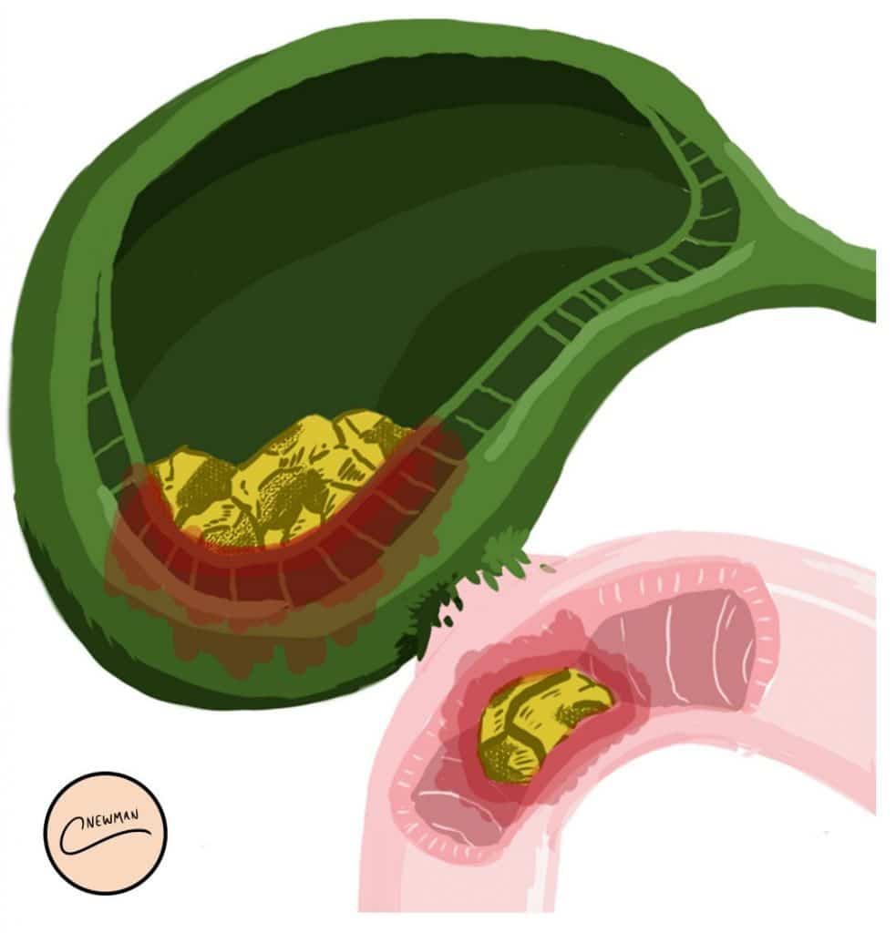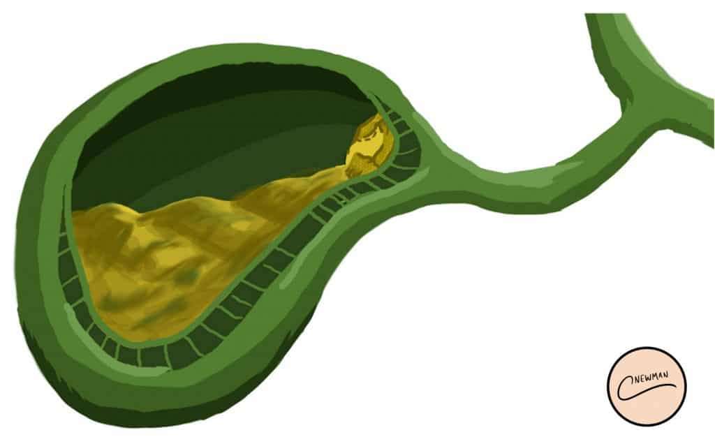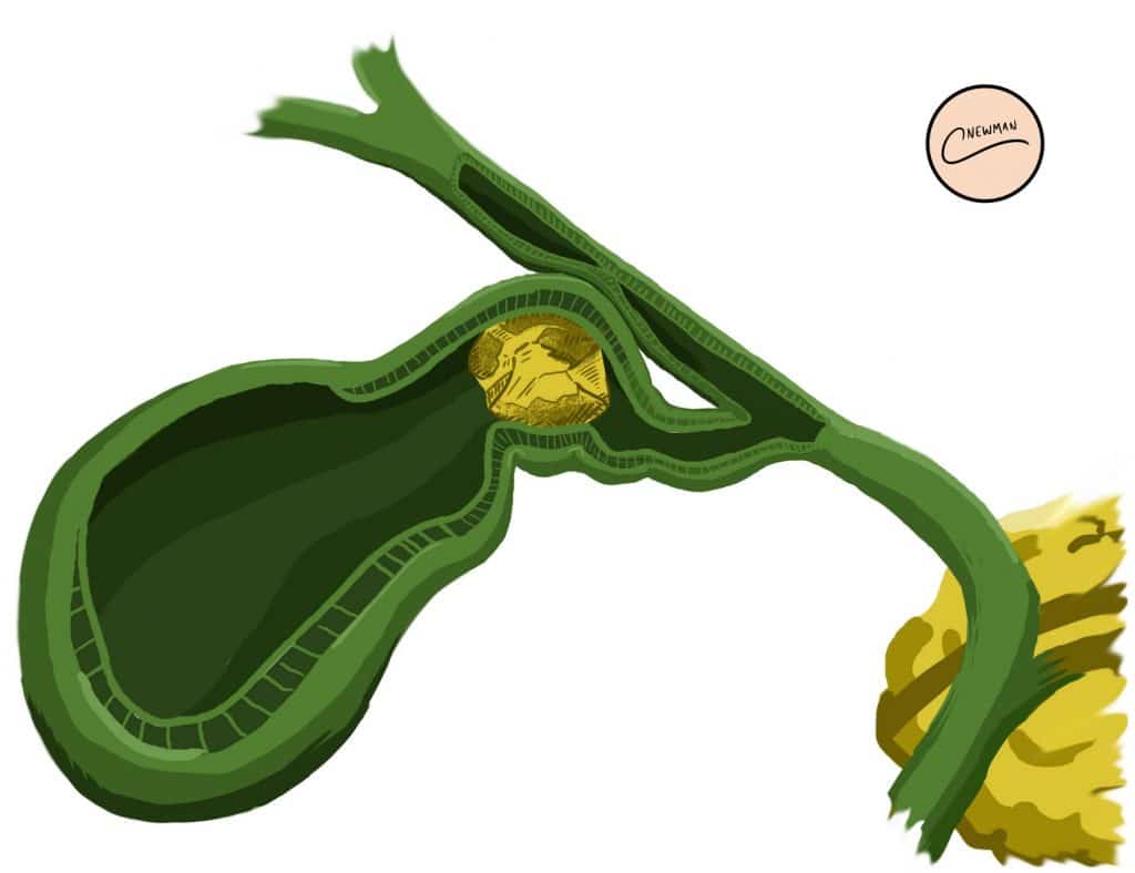 Gallstone disease is a common condition, affecting around 10-14% in Western populations. Most individuals with gallstones will remain asymptomatic, however on average 1-4% of individuals will develop symptoms secondary to their gallstones. Gallstones can cause a spectrum of disease, from biliary colic to acute pancreatitis, depending on the region of the biliary system involved. This article will focus on the presentation and management of biliary colic and acute cholecystitis. Pathophysiology Bile is formed from cholesterol, phospholipids, and bile pigments (products of haemoglobin metabolism). It is stored in the gallbladder, before passing into the duodenum upon gallbladder stimulation. Gallstones form as a result of supersaturation of the bile. There are three main types of gallstones: Cholesterol stones – composed purely of cholesterol, from excess cholesterol production There is a well recognised link between poor diet, obesity, and cholesterol stones Pigment stones – composed purely of bile pigments, from excess bile pigments production Commonly seen in those with known haemolytic anaemia Mixed stones – comprised of both cholesterol and bile pigments By TeachMeSeries Ltd (2025) Figure 1The biliary system, which transports bile from the gallbladder to the duodenum Risk Factors Classically the common risk factors for gallstone disease are colloquially described as the “5 F’s”: Fat, Female, Fertile, Forty, and Family history. Other recognised risk factors include pregnancy and oral contraceptives*, haemolytic anaemia (specifically for pigment stones), and malabsorption (such as previous ileal resection or Crohn’s disease). *Oestrogen causes more cholesterol to be secreted into bile Clinical Features Studies have shown for those who are symptomatic, over 50% will present as biliary colic and 35% as an acute cholecystitis. By Nevit Dilmen [CC BY-SA 3.0], via Wikimedia Commons Figure 2Gallstone found incidentally on an ultrasound scan in an asymptomatic patient Biliary Colic Biliary colic occurs when the gallbladder neck becomes impacted by a gallstone. There is no inflammatory response, yet the contraction of the gallbladder against the occluded neck will result in pain. The pain is typically sudden, dull, and colicky in nature. It is often focused in the right upper quadrant although it may radiate to the epigastrium and/or back. The pain may be precipitated by the consumption of fatty foods* and the patient often complains of nausea / vomiting. In general, once pain relief has been started, symptoms often settle quickly. *Fatty acids stimulate the duodenum endocrine cells to release cholecystokinin (CCK), which in turn stimulates contraction of the gallbladder. Acute Cholecystitis Patients with acute cholecystitis will report a constant pain in the RUQ or epigastrium, associated with signs of inflammation, such as fever or lethargy. Patients with acute cholecystitis will be tender in the RUQ and may demonstrate a positive Murphy’s sign. Ensure to check for any guarding (may suggest a gallbladder perforation) and for features of sepsis. Murphy’s Sign Whilst applying pressure in the RUQ, ask the patient to inspire. Murphy’s sign is positive when there is a halt in inspiration due to pain, indicating an inflamed gallbladder. This can be achieved more accurately with an ultrasound, namely the sonographic Murphy sign. Differential Diagnosis There are a wide variety of pathologies that can present with RUQ pain. However, differentials to consider include gastro-oesophageal reflux disease, peptic ulcer disease, acute pancreatitis, or inflammatory bowel disease. Investigations Laboratory Test Certain blood tests can help in the initial evaluation of suspected cases: FBC and CRP – assess for the presence of any inflammatory response, which will be raised in cholecystitis LFTs – biliary colic and acute cholecystitis are likely to show a raised ALP (indicating ductal occlusion), yet ALT and bilirubin should remain within normal limits (unless a Mirizzi syndrome, discussed below) Amylase (or lipase) – to check for any evidence of pancreatitis A urinalysis, including a pregnancy test if relevant, should be performed to exclude any renal or tubo-ovarian pathology. Imaging A trans-abdominal ultrasound (Fig. 2) is one of the most sensitive modalities for visualising gallstone disease and is typically used first line to investigate suspected gallstone pathology. Three specific areas are often visualised on US: The presence of gallstones or sludge (the start of gallstone formation) Gallbladder wall thickness (if thick walled, then inflammation is likely) Bile duct dilatation (indicates a possible stone in the distal bile ducts) If results from US scans are inconclusive, further imaging options are available. The gold standard investigation* for gallstones is Magnetic Resonance Cholangiopancreatography (MRCP), largely replacing ERCP for diagnostic purposes (Fig. 3). MRCP can show potential defects in the biliary tree caused by gallstone disease, with a sensitivity approaching 100%. By Hellerhoff (Own work) [CC BY-SA 3.0], via Wikimedia Commons Figure 3MRCP image showing stones in the distal common bile duct: (a) Gallbladder with stones (b) Stone in bile duct (c) Pancreatic duct (d) Duodenum. *Any patient with symptoms suggestive of gallstones with inconclusive US (or CT scans) should undergo a MRCP Management Biliary Colic Patients with biliary colic should be prescribed analgesia (regular paracetamol +/- NSAIDs +/- opiates analgesia). The patient should be advised about lifestyle factors that may help control symptoms (and help with future surgery), such as a low fat diet, weight loss, and increasing exercise. Following first presentation of biliary colic, there is a high chance of symptom recurrence or the development of complications of gallstones, therefore an elective laparoscopic cholecystectomy* (Fig. 4) is warranted and should be offered within 6 weeks of first present