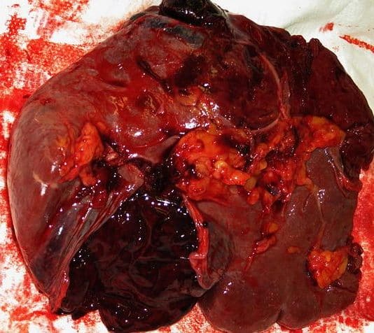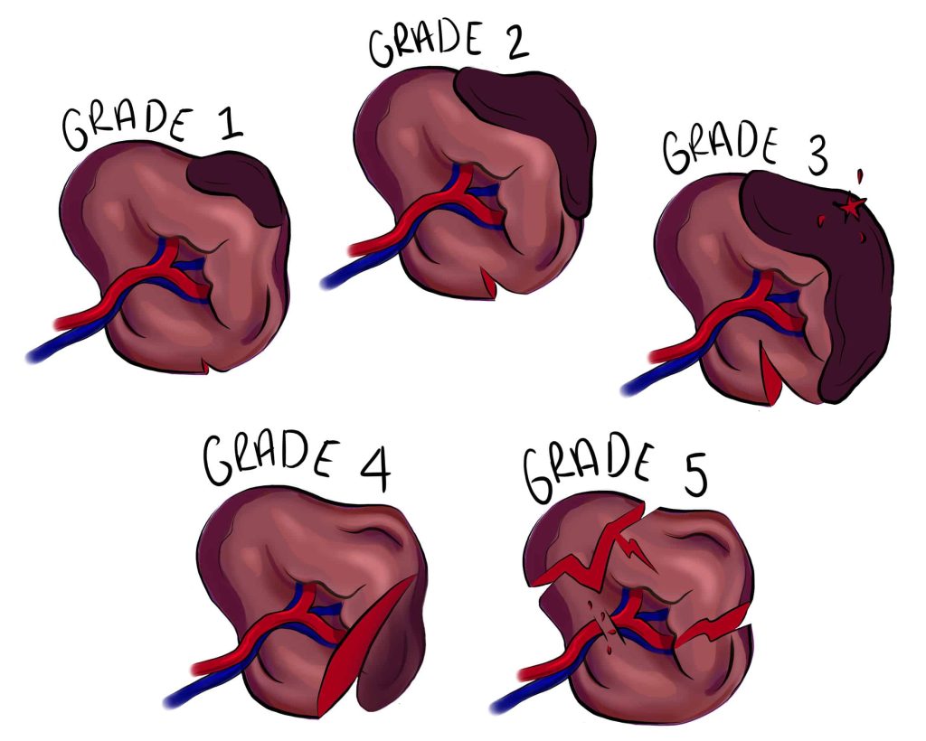 The spleen is an extremely vascular organ and consequently splenic rupture can lead to large intraperitoneal haemorrhage, rapidly leading to fatal haemorrhagic shock. Whilst protected by the ribcage (Fig. 1), the majority of cases of splenic injury are secondary to abdominal trauma – particularly blunt trauma. Common situations in which the spleen is injured include seat-belt injuries in road traffic collisions and falls onto the left side (such as patients slipping on ice or elderly patient falling in the bathroom). A minority of cases are iatrogenic, or secondary due to underlying splenomegaly from haematological malignancy or infective causes (such as Epstein-Barr virus). In these cases, as the spleen grows, the capsule stretches and thins, becoming more fragile and predisposing to rupture. By TeachMeSeries Ltd (2020) Figure 1The anatomical position of the spleen in the abdomen Clinical Features Diagnosis is most commonly made from the investigations of abdominal pain following a history of trauma. Patients may complain of abdominal pain, however a proportion will only present with the clinical features of hypovolaemic shock. Only work-up imaging will confirm the diagnosis. On examination, patients may have left upper quadrant tenderness and / or peritonism (often becoming more generalised as the blood loss increases). Free blood can irritate the diaphragm and cause a radiating left shoulder pain (known as Kehr’s sign). Investigations Patients who are haemodynamically unstable with peritonism following trauma have abdominal bleeding until proven otherwise and require immediate laparotomy. Those who are haemodynamically stable with suspected abdominal injury will need an urgent CT chest-abdomen-pelvis with intravenous contrast (Fig. 2) CT imaging allows for the identification and assessment of splenic injury*, alongside any other abdominal viscera involvement. Specifically, it also allows for the grading of the splenic injury to guide further management. *FAST scans in the emergency department setting can reveal free peritoneal fluid or fluid in the pericardium, however whilst a potentially helpful adjunct, they should not delay CT imaging and / or surgical intervention By Hellerhoff [CC BY-SA 4.0], via Wikimedia Commons Figure 2A traumatic splenic rupture as seen on CT scan, the rim at the lower edge demonstrating a sign of free fluid (blood) Organ Injury Scale The American Association for the Surgery of Trauma (AAST) splenic injury scale (Table 1) is the most commonly used system for grading splenic trauma. It is used to help guide which patients are likely to benefit from conservative management and which need surgery. Grade of Injury Description 1 – Capsular tear <1cm parenchymal depth – Subcapsular haematoma <10% surface area 2 – Capsular tear 1-3cm parenchymal depth – Subcapsular 10-50% surface area, or intraparenchymal <5cm 3 – Capsular tear >3cm parenchymal depth, or any tear involving trabecular vessels – Subcapsular >50% surface area, or intraparenchymal >5cm, or any expanding or ruptured haematoma. 4 – Laceration involving segmental or hilar vessels, devascularising >25% of the spleen 5 – Completely shattered spleen or hilar vascular injury, devascularising the entire spleen Table 1 – The AAST Splenic Injury Scale By Rebecca Varley, TeachMeSurgery [CC-BY-NC-ND 4.0] Figure 3Illustration demonstrating the classification of splenic rupture, as per the AAST splenic injury scale Management All patients with suspect splenic injury should be assessed, resuscitated, and treated according to ATLS principles. Patients who are haemodynamically unstable* or with a grade 5 injury (a shattered spleen or major hilar vascular injury) need urgent laparotomy and splenectomy. Haemodynamically stable patients with grade 1–3 injuries without active extravasation can be considered for conservative treatment. They should be resuscitated using the principle of permissive hypotension, admitted to a high dependency area for observation, and have serial abdominal examinations for any evidence of deterioration, with a low threshold for repeat imaging Consideration should be given for prophylactic vaccinations (against Strep Pneumoniae, Haemophilus Influenzae B (HIB) and Meningococcus) and prophylactic antibiotics (against encapsulated bacteria) Splenic Artery Embolisation Splenic artery embolisation by interventional radiology is an important alternative management option, where available, potentially negating the need for laparotomy and preserving splenic function. This should be used haemodynamically stable with high grade splenic injuries. For multifocal injuries, a proximal embolisation involving the splenic artery can be used, whilst in more focal bleeding, a targeted distal embolisation can be performed, Proximal embolisation can also be used alongside surgery in high grade injuries to facilitate splenic salvage surgery. Embolic agents that are used for splenic embolisation include metallic coils, glue, gelfoam, or particles. Even when a vessel is embolised, there is a small proportion who fail this approach and will require a splenectomy. By Thomas Zimmermann [CC BY-SA 3.0], via Wikimedia Commons Figure 4A ruptured spleen, following a laparotomy with splenectomy Complications of Treatment The main complications of conservative treatment or embolisation are ongoing bleeding, splenic necrosis, splenic abscess or cyst formation, and thrombocytosis* (typically transient) The main complications following splenectomy include intra-abdominal collections, thrombocytosis* (typically transient), and Overwhelming Post-Splenectomy Infection. The overall mortality rates of patients presenting to hospital with trauma splenic injury are around 10%. *There is a theoretical increased thrombotic risk, including deep vein thrombosis and portal vein thrombosis, with increasing platelet count, however advice from a haematologist for ongoing management (e.g. aspirin therapy) should be taken if