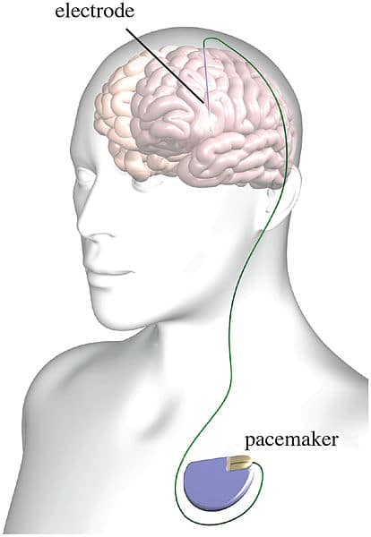 Deep brain stimulation (DBS) is a neurosurgical technique used in the treatment of movement and psychiatric disorders. A battery-operated neurostimulator sends impulses to electrodes which have been implanted in the brain, however the precise mechanism by which DBS alters brain activity remains not fully understood. Until the development of DBS in the 1980s, neurosurgeons only had ablative techniques to treat such movement disorders, psychiatric disorders, and epilepsy. Rather than creating lesions in functional targets, such as ablation the subthalamic nucleus in the case of Parkinson’s disease, DBS achieves a similar effect via electrical stimulation, however is reversible and adjustable. DBS is a minimally-invasive and stereotactic procedure with or without real-time image-guided navigation as an adjunct. By Dr. Craig Hacking, A. Prof Frank Gaillard [CC BY-SA 4.0 (https://creativecommons.org/licenses/by-sa/4.0)], via Wikimedia Commons Figure 1A sagittal radiograph of a skull with DBS probes in-situ Indications Deep brain stimulation can be used to treat a range of movement disorders refractory to (or complicated by) pharmacological therapy. Conditions that have been trialled for treatment via DBS include Parkinson’s disease, dystonia, treatment-resistant depression, and obsessive-compulsive disorder (OCD). Procedure DBS can be performed under local or general anaesthestia. A rigid frame is used to fix the skull and a scan is obtained, and the surgical anatomical target is identified and co-ordinated. A burr hole is created in the cranium over the frontal bone. An electrode is advanced to the target, along a trajectory guided by the frame. Leads can be placed uni- or bi-laterally. The leads are secured to the cranium and a wire is tunnelled under the scalp and down to the pacemaker (Fig. 2). This can be secured, typically to the fascia overlying pectoralis major (similar to a cardiac pacemaker). The neurostimulator can be switched on and off via an external device, and can be programmed to the settings which achieve optimal symptomatic control. By Shamir R, Noecker A and McIntyre C [CC BY 3.0 (https://creativecommons.org/licenses/by/3.0)], via Wikimedia Commons Figure 2The typical positioning of DBS electrodes and connection to the pacemaker Complications Specific complications can be divided into operation-related, hardware-related, and stimulation-related. Operation-related complications include peri-operative intracranial haemorrhage and electrode malposition Hardware-related complications include electrode migration, electrode fracture, and infection and erosion Stimulation-related complications include sensorimotor conditions including dyskinesia and blepharospasm, transient confusion, mood changes, or even psychiatric conditions, such as manic episodes Key Points Deep brain stimulation is minimally invasive, reversible, and adjustable DBS can be used for a range of refractory movement disorders, and there is increasing evidence that it is efficacious in some psychiatric disorders Potential complications include intracerebral haemorrhage and hardware malfunction Rate This Article