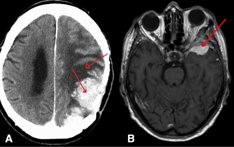 A meningioma is a non-glial cell growth arising from the arachnoid meningothelial cells within the meninges. Meningiomas form around 30% of all brain tumours. Meningiomas are typically benign and slow growing. Around 90% of meningiomas occur within the cranium, with 25% around the falx cerebri, 20% on the convexity, and 20% on the sphenoid wing. The annual incidence of meningiomas is currently around 1.3-7.8 per 100,000 and are more common in females than males. Mysid / Public domain Figure 1Coronal section of the skull, meninges, and cerebrum Classification The WHO classification of meningiomas classifies them into 3 grades Grade Type Characteristics I Meningioma 90% of meningiomas, benign tumours II Atypical meningioma 5% of meningiomas, abnormal cells, more likely to recur post-resection III Anaplastic meningioma 5% of meningiomas, malignant tumour, fast growing and more frequent recurrence post-resection Risk Factors Most cases are sporadic with no identifiable risk factors. However, known risk factors include increasing age, previous cranial irradiation, or certain genetic disorders (e.g. neurofibromatosis type II). Clinical Features Meningioma presentation occurs as that of any space-occupying lesion. They can also often be an incidental finding, especially when asymptomatic and benign. Clinical features can include seizures, cranial nerve palsies or visual field defects, language dysfunction, or features of raised intracranial pressure. Differential Diagnosis Potential differentials can be either neoplastic or non-neoplastic lesions. Neoplastic lesions include gliomas, secondary metastasis, or lymphoma, whilst non-neoplastic causes of a mass lesion include infection (i.e. cerebral abscess) or infarction. Investigations Imaging CT head imaging with IV contrast is often the first line investigation performed. Meningiomas appear as well-circumscribed (globose) extra-axial masses with uniform contrast enhancement on imaging, and potential associated regions of dural thickening. MRI imaging may also be used to further characterise and assess the lesion. Angiography can be required the assessment of tumour blood supply to aid in planned operative approach. Adapted from James Heilman, MD [CC BY-SA 3.0 (https://creativecommons.org/licenses/by-sa/3.0)] and Hellerhoff [CC BY 3.0 (https://creativecommons.org/licenses/by/3.0)] Figure 2 (A) CT scan showing a meningioma with surrounding oedema (B) MRI scan showing a meningioma Biopsy A biopsy can be used to confirm the diagnosis, which can be achieved either through a stereotactic (burr hole) approach or through open exploration (craniotomy). For the burr hole approach, a Leksell stereotactic frame can be used, which is based around an arc on a rectangular based ring attached to skull via four pins. The system then co-ordinates the centre of the target to perform the biopsy (can also be used in gamma knife surgery, discussed later). Management Treatment choice depends on patient factors (e.g. age, co-morbidities, performance status), disease factors (e.g. volume, location, evidence of growth, evidence of calcification), and treatment factors (e.g. probability of satisfactory excision or disease control, operative risks) Treatment options involve combinations of endovascular embolisation, surgical removal, radiotherapy (including gamma knife). Chemotherapy will be employed as adjuvant treatment to surgery, or in anaplastic or recurring meninigiomas. Endovascular Embolisation This treatment is usually performed by an interventional neuroradiologist*, involving an endovascular catheter passing up to the location of the meningioma, before embolising the tumour. This technique can act as an adjuvant to neurosurgical resection, aiming to optimise chance of resection success (minimising bleeding in highly vascularised tumours), improve operating times and recovery times, or even to facilitate palliation *Intraoperative digital subtraction angiography can be used to ascertain the correct position of the vasculature being targeted Surgical Removal There are 3 classifications for extent of resection (EOR) that can be performed (1) gross total resection* (2) subtotal resection (3) biopsy only. A Mayfield three-point fixation method is often employed for accuracy in targeting the lesion; a Mayfield clamp is used to immobilise the patient’s skull, the image-guided system and retractor components can then be attached to the clamp. The location of the meningioma using navigation is confirmed using surface anatomical landmarks. The operative approach chosen aims to maximise conservation of normal anatomy and lesion exposure. *Whilst the entire tumour removed, microscopic cells may remain Intra-Operative Equipment The cavitron ultrasonic surgical aspirator (CUSA) uses ultrasound waveforms to cavitate neural tissue, which can then be aspirated +/- irrigated Neuronavigation is used to enhance lesion location and to facilitate protection of key structures. A 3D model is created from the optical/electromagnetic probe and detector, reconstructing axial images into the 3D model. Radiotherapy By NRC [Public domain] Figure 3Graphic demonstrating the Leksell Gamma Knife Radiotherapy can be employed as an adjunct to surgery, in cases of tumour recurrence, or where factors preclude surgery. Stereotactic Radiosurgery (SRS) uses high-dose focused radiation that targets the lesion and minimises damage to surrounding tissues, even allowing long-term tumour control to be possible. One such type of SRS is the Gamme Knife, using multiple beams of radiation from all three dimensions to focus on a small volume, allowing for high radiation doses to be delivered. Prognosis The Simpson grade of meningioma resection can be used to help predict symptomatic recurrence following treatment (although other factors can now also employed to determine mortality) Description Recurrence at 10yrs Grade I Total removal including resection of underlying bone plus associated dura 9% Grade II Tota