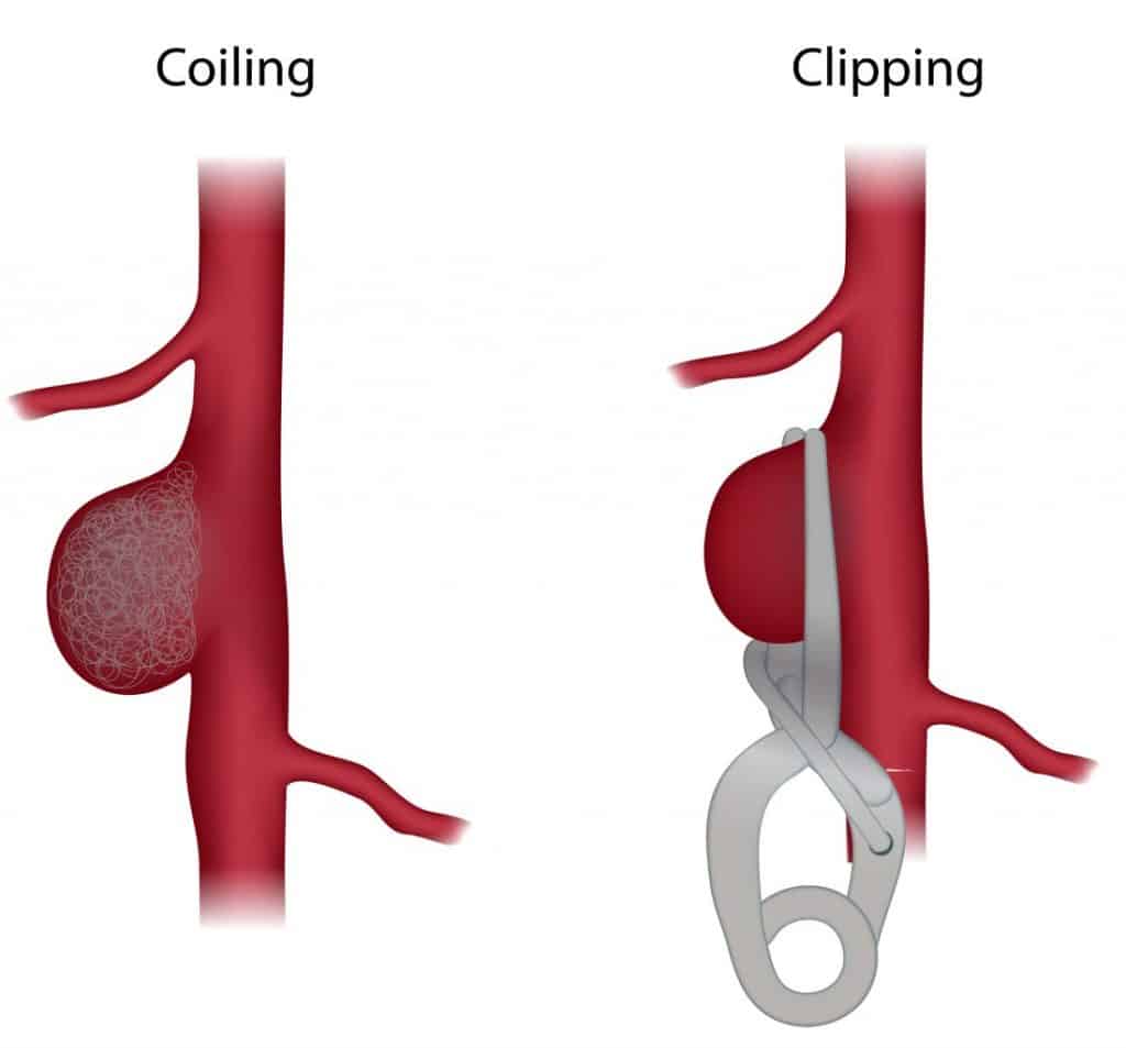 Subarachnoid haemorrhage (SAH) is bleeding into the subarachnoid space, the anatomical space between the arachnoid mater and pia mater (Fig. 1). SAH can be classified into either aneurysmal or non-aneurysmal causes: Aneurysmal disease (85%) is associated with ADPKD, fibromuscular dysplasia, connective tissue disorders, atherosclerosis, and hypertension Non-aneurysmal causes for SAH include trauma, arteriovenous malformations, coagulopathies, or tumour-related They typically occur in patients around 60yrs old and account for 3% of all strokes. By SVG by Mysid, original by SEER Development Team [1], Jmarchn [CC BY-SA 3.0 (https://creativecommons.org/licenses/by-sa/3.0)], via Wikimedia Commons Figure 1The layers of the meninges Berry Aneurysms Berry aneurysms are ‘berry-shaped’ true aneurysms that occur at the bifurcation of arteries. They are typically saccular aneurysms that occur mostly at either the circle of Willis and the bifurcation of the middle cerebral artery (Fig. 2). Unruptured aneurysms occur in around 3% of the adult population; those that present ruptured will be at the age 40-60yrs and can cause either a subarachnoid haemorrhage, cerebral haematoma, or intraventricular haemorrhage. Risk Factors Aside from the above, further risk factors include family history, female gender, and African descent. By TeachMeSeries Ltd (2020) Figure 2The circle of Willis (yellow); the majority of Berry aneurysms will form here Clinical Features SAH will classically presents with a severe headache, sudden onset (within seconds to minutes), typically in the occipital region (often termed “thunderclap” headaches). Other features include nausea and vomiting, reduced consciousness, collapse, or seizures, or evidence of meningism (including photophobia, stiff neck, pain on neck flexion, or positive Kernig’s sign). Examination may reveal focal neurology or evidence of meningism, however may be otherwise unremarkable. By Aimee Rowe, TeachMeSurgery [CC-BY-NC-ND 4.0] Figure 3Diagram demonstrating types of intracranial bleeds, across (A) axial and (B) coronal views; EDH = epidural haematoma, SDH = subdural haematoma, SAH = subarachnoid haemorrhage, IPH = intraparenchymal haemorrhage Investigations Investigations for a suspected SAH should aim to initially confirm the presence of subarachnoid haemorrhage and then to localise the source of any potential bleeding to decide on a management plan Initial Investigations An initial urgent non-contrast CT head scan is typically warranted for assessment for SAH (Fig. 4), with a sensitivity of 98% within 12 hours (however small SAH may not be picked up). Hyperattenuating material is seen within the subarachnoid space, most apparent typically around the circle of Willis* or in the Sylvian fissure. In cases where the initial CT is negative however clinical history is suggestive of SAH, then a lumbar puncture (LP) may be warranted. CSF spectrophotometric analysis following LP will reveal elevated levels of oxyhaemoglobin and bilirubin, in cases of SAH. *This occurs due to the majority of berry aneurysms occurring in this region By Lipothymia, CC-BY-SA-3.0 (http://creativecommons.org/licenses/by-sa/3.0/), via Wikimedia Commons Figure 4A non-contrast CT showing a hyperintense area in the subarachnoid basal cisterns, in keeping with subarachnoid haemaorrhage, with widening of the temporal horns of the lateral ventricles suggestive of an associated hydrocephalus Definitive Imaging Once the SAH has been confirmed, further imaging is warranted to localise the source of bleed. Several potential modalities are available, including CT angiography or digital subtraction angiography (which allows for better visualisation of the smaller vessels and the feeding vessels), depending on the treating centre. Management The mainstay of treatment is to definitively treat the bleeding region and reduce potential complications. All acutely unwell patients should be stabilised using an A to E approach, with fluid resuscitation and analgesia with anti-emetics as necessary. Once the condition is identified, early neurosurgical involvement is essential and transfer to a high-dependency care centre. Patients can be started on nimodipine, a calcium channel blocker that aims to reduce vasospasm and reduce the risk of delayed cerebral ischaemia Surgical Management Ruptured aneurysmal SAH will commonly require neurosurgical intervention, either coiling or clipping of the aneurysm, depending on the location, size, age, and comorbidities. Nearly 80% of aneurysms are coiled (Fig. 5), however this requires a suitable aneurysm neck to dome ratio. Coiling is more suitable in the presence of multiple co-morbidities, older patient age, presence of vasospasm, or aneurysms present in deep areas or along the basilar artery. Clipping is now currently only performed in a minority of aneurysms, mainly when aneurysm morphology is not suitable for coiling (e.g. wide necked aneurysms), there is a presence of a clot, or a previously coiled aneurysm has ruptured. Adobe Stock, Licensed to TeachMeSeries Ltd Figure 5Illustration demonstrating aneurysm coiling vs clipping Ongoing Monitoring Patients need close monitoring for potential complications, including rebleeding, hydrocephalus, vasospasm, and electrolyte disturbances (particularly hyponatremia). Patients may warrant ICP monitoring. Prophylactic levetiracetam may be started to reduce seizure risk. Key Points Subarachnoid haemorrhage is bleeding into the subarachnoid space, most commonly caused by ruptured Berry aneurysms Patients will typically present with severe sudden-onset occipital headache, with evidence of meningism and reduced consciousness Patients should have a non-contrast CT head scan initially to assess for potential subarachnoid haemorrhage Ruptured aneurysms suitable for intervention will usually undergo coling Rate This Article