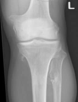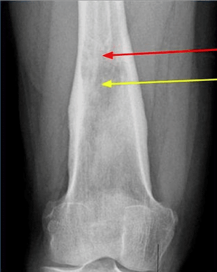 Bone tumours can be divided into primary and secondary (metastatic) tumours. Primary tumours arise from cells which constitute the bone and can divided into benign and malignant types (Table 1). Tissue Type Benign Malignant Bone forming Osteoma Osteoid osteoma Osteoblastoma Osteosarcoma Cartilage forming Chondroma Osteochondroma Chondroblastoma Chondrosarcoma Fibrous tissue Fibroma Fibromatosis Fibrosarcoma Giant-cell tumours Benign osteoclastoma Malignant osteoclastoma Marrow tumours Ewing’s tumour Myeloma Table 1 – List of bone tumours, divided into benign and metastatic Metastatic bone tumours make the most of the disease burden. Primary bone tumours are relatively rare, with an overall prevalence of less than 1% in the UK. In children & adolescents, bone cancer is more common, comprising around 5% of all cancers. Metastatic Bone Cancer Metastatic spread from other cancer types is the most common cause of bone cancer, the most common primary sites being renal, thyroid, lung, prostate, and breast. The most common site for a bony metastases is the spine. Metastatic disease is rarely treated surgically, with the mainstay of disease management via systemic therapies and often are palliative. Prophylactic nailing of certain long bones can be performed in certain individuals at high risk of pathological fractures from metastatic disease, especially of the femur and humerus. Wan-Hsiu Liao, Sheng-Hsiang Lin and Tsu-Tuan Wu [CC BY-SA 2.0 (https://creativecommons.org/licenses/by-sa/2.0)] Figure 1Sclerotic bone metastasis on plain film radiograph (arrows), secondary to metastatic prostate cancer Risk Factors There are certain well documented risk factors for developing a primary bone cancer: Genetic association RB1(familial retinoblastoma) and p53 (Li Fraumeni syndrome) are associated with an increased risk of osteosarcomas Mutations to TSC1 andTSC2 mutation (tuberous sclerosis) are associated with an increased risk of chordomas during childhood Previous exposure to radiation or alkylating agents in chemotherapy Benign bone conditions, such as Paget’s disease and fibrous dysplasia (both increase the risk of osteosarcoma) Clinical Features The main symptom of a (primary) bone tumour is pain. This is typically not associated with movement and is worse at night (often deemed a ‘red flag’ symptom). As the tumour enlarges, a mass may be palpable. If the patient presents with a fracture without a history of trauma (pathological fracture), a bone tumour may be suspected. Differential Diagnosis Patient presenting with ongoing bone pain can have a wide variety of conditions, including osteomyelitis, multiple myeloma, metabolic bone disease (e.g. renal osteodystrophy), or a pathological fracture. Bone Tumours Primary bone tumours can be either benign or malignant; here, we discuss the most common types of primary bone tumours. Benign Osteoid Osteoma Osteoid osteomas arise from osteoblasts, often around the second decade of life (10-20yrs), and are more common in males. They are typically small tumours (<2cm), located usually around the metaphysis of long bones (e.g. proximal femur or tibia). They present with a localised progressive pain, worse at night, and typically made better with NSAIDS. There may be associated localised swelling, tenderness, or limping. Radiologically they show a small mass, comprised of a radiolucent nidus with a rim of reactive bone (Fig. 2). Most can be managed conservatively through serial radiological imaging every 4-6 months, however those with severe pain may warrant surgical resection. Overall they have a good prognosis, with most resolving spontaneously. Hellerhoff [CC BY-SA 3.0 (https://creativecommons.org/licenses/by-sa/3.0)] Figure 2Osteoid osteoma at the lesser trochanter, on plain film radiograph and subsequent MRI scan Osteochondroma Osteochondromas (also known as exostoses) are benign bony tumours*, forming as an outgrowth from the metaphysis of long bones covered with a cartilaginous cap. They develop most commonly in the second decade of life (10-20yrs) and are more common in males. Most are detected incidentally, as usually are asymptomatic and slow growing, although can cause deformities or impinge on nerves if they grow large enough. On plain film radiograph, they show as a pedunculated bony outgrowth from metaphysis pointing away from the joint (Fig. 3). Most can be managed conservatively through serial radiological imaging every 4-6 months, however those with significant deformity or neurological symptoms may warrant surgical resection. *85% occur as solitary osteochondromas, however osteochondromas are also associated with hereditary conditions, such as Multiple Hereditary Exostoses (MHE) Syndrome. Bovée JV. [CC BY 2.0 (https://creativecommons.org/licenses/by/2.0)] Figure 3Multiple osteochondromas as seen on plain film radiograph affecting the left knee Chondroma Chondromas arise* from chondroblasts within the medullary cavity of the bones (termed enchondromas) or from the cortical surface. They present in patients 20-50 years old, most commonly affecting the long bones of the hands, femur, and humerus. Most of asymptomatic, however they can present as a pathological fracture. On plain film radiograph, they appear as a well circumscribed oval lucency with intact cortex. Chondromas should be managed depending upon the size and clinical features. Most asymptomatic and small chondromas can be observed, however large or symptomatic chondromas may require removal with curettage and bone grafting. There is a small risk of transformation into chondrosarcomas (malignant). *Two syndromes are associated with chondromas, Ollier’s disease and Maffucci syndrome, both of which are characterised by the formation of multiple enchondromas Giant Cell Tumour Giant cell tumours, also called osteoclastomas, arise from the multinucleated giant cells and stromal cells. They occur in patients 20-30 years old, usually affecting the epiphysis of long bones (most commonly 