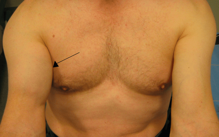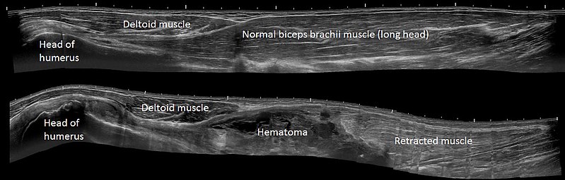 Biceps Tendinopathy Introduction Tendinopathy is a broad term used to encompass a variety of pathological changes that occur in tendons, typically due to overuse. This results in a painful, swollen, and structurally weaker tendon that is at risk of rupture*. Biceps tendinopathy can occur in both the proximal and distal bicep tendons. It is common in younger individuals who are active (e.g. sports with repetitive flexion movements, such as tennis or cricket) and in older individuals with more of a degenerative tendinopathy. The majority of this article will focus on distal biceps tendinopathy. *The tendons become disorganised, hypervascular, and degenerative; whilst inflammation is certainly present, it is not thought to be the primarily pathological process By TeachMeSeries Ltd (2025) Figure 1The coracobrachialis, biceps brachii, and brachialis muscles Clinical Features Patients will present with pain, made worse with stressing the tendon (and alleviated through rest and ice therapy). This can also be associated with weakness (flexion and supination) and stiffness. On examination, patients will demonstrate tenderness over the affected tendon. If the patients has avoided using the limb due to pain, there may be a loss of muscle bulk due to disuse atrophy. There are certain special tests that can be performed specifically for biceps tendinopathy: Speed test (proximal biceps tendon) – The patient stands with their elbows extended and their forearms supinated. They then forward flex their shoulders against the examiners resistance Yergason’s test (distal biceps tendon) – The patients stands with their elbows flexed to 90 degrees and their forearm pronated. They actively supinate against the examiners resistance Differential Diagnoses The main differential diagnoses* to consider in a patient with suspected biceps tendinopathy include inflammatory arthropathy, radiculopathy, osteoarthritis, or rotator cuff disease (for proximal tendon involvement) *Biceps tendinopathy is rarely an isolated pathology and often the differentials may be co-existing, hence the need for thorough history and examination Investigations The diagnosis of bicep tendinopathy is largely clinical, with further investigations reserved for cases where there is diagnostic uncertainty. Blood tests (FBC and CRP) and plain film radiographs can be undertaken as first line investigations, often most useful to exclude other differentials. Specialist imaging is rarely warranted, but ultrasound imaging can identify involved thickened tendons and MRI imaging can show thickened inflamed tendons. Management Nearly all cases can be treated conservatively, with the use of analgesia (specifically NSAIDs, if tolerated) and ice therapy as first line. Physiotherapy also plays an important role. Ultrasound-guided steroid injections can be useful in cases unresponsive to initial conservative management. Rarely, surgical options are required in refractory cases. Arthroscopic tenodesis (tendon is severed and reattached) or tenotomy (division of the tendon) for decompression are options that may be discussed with the patient if indicated. Prognosis Most cases will recover well with no complications. Small proportion of cases may develop recurrent or chronic pain at the affected site or some weakness. Chronic cases are at an increased risk of having a biceps tendon rupture. Biceps Tendon Rupture Rupture of the distal biceps tendon is an uncommon injury. It can be classified as either complete (through entire tendon) or partial (remains partly intact) tears. These injuries typically occur following sudden forced extension of a flexed elbow. Those with previous episodes of biceps tendinopathy are at increased risk. Other risk factors for biceps tendon rupture include steroid use, smoking, chronic kidney disease (CKD), or use of fluoroquinolone antibiotics. Clinical Features Patients will present with sudden onset pain and weakness* at the affected area. Patients often report the feeling of a “pop” during the incident. Examination demonstrates marked swelling and bruising in the antecubital fossa. As the proximal muscle belly retracts (due to loss of counter traction) a bulge may become evident in the arm; this is termed the “reverse Popeye sign” (Fig. 2). The Hook test is a special test to identify a potential distal tendon rupture: The elbow is actively flexed to 90º and fully supinated, the examiner attempts to ‘hook’ their index finger underneath the lateral edge of the biceps tendon (which cannot be done in a ruptured biceps tendon) *Action of the brachialis and supinator muscles allows for flexion at the elbow to remain. James Heilman, MD [CC BY-SA 3.0 (https://creativecommons.org/licenses/by-sa/3.0)] Figure 2A right distal biceps tendon rupture Investigations Whilst cases can be diagnosed clinically, confirmation is usually obtained via ultrasound imaging. This also helps the surgeon localise the distal end of the biceps tendon, which can retract many inches proximally. If ultrasound imaging is inconclusive but clinical suspicion remains, an MRI scan may be warranted to further assess. Mikael Häggström, M.D. [CC0] Figure 3Ultrasound scan of a normal biceps tendon (above) and of a biceps tendon rupture (below) Management Discussions with the patient regarding the best management option for them in cases of biceps tendon rupture are essential. As elbow flexion and supination can still occur (albeit weakened), due to the remaining action of other associated muscles, not all cases require surgical management. However, this does come with issues with fatiguability and weakness. Accordingly, for lower demand patients, a conservative approach may be most suitable. Analgesia and physiotherapy form the mainstay of conservative management, often allowing for significant recovery of muscle strength and function. Operative Management For those who warrant surgical management, either an anterior single-incision or a dual incision techni