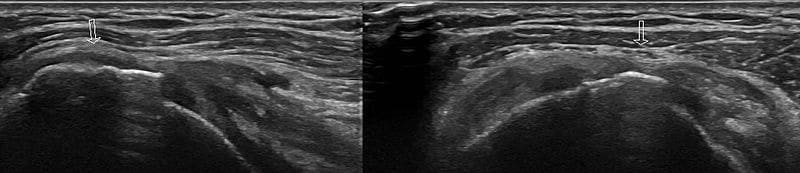 The rotator cuff is a group of 4 muscles that support and rotate the glenohumeral joint (Fig. 1). Alongside their role in movement of the shoulder, the rotator cuff muscles act to stabilise the humeral head in the glenoid fossa. Rotator cuff tears are common; acute full thickness tears have an incidence around 2.5 per 10,000 patients for those aged 40-70yrs, whilst the prevalence of a rotator cuff tear (of all degrees) in the general population is around 20%. Classification Rotator cuff tears are classified as either acute (lasting <3 months) or chronic (lasting >3 months) tears. They can be either partial thickness or full thickness tears. Full thickness tears can be further classified into small (<1cm), medium (1-3cm), large (3-5cm), or massive (>5cm or involves multiple tendons) tears. The Rotator Cuff Muscles The rotator cuff is composed of four muscles: Supraspinatus – abduction Infraspinatus – external rotation Teres minor – external rotation (and adduction) Subscapularis – internal rotation Pathophysiology Acute tears commonly occur within tendons with pre-existing degeneration, typically occurring alone following minimal force. However, acute tears can occur in young individuals subjected to a larger force, often alongside other injuries. Chronic tears occur in individuals with degenerative microtears to the tendon, most commonly from overuse and seen in greater incidence with increasing age. By TeachMeSeries Ltd (2023) Figure 1The rotator cuff muscles Risk Factors The main risk factors for rotator cuff tears are increasing age, significant trauma, and repetitive overhead shoulder motions (e.g. athletes). Other risk factors include obesity, smoking, and diabetes mellitus. Clinical Features Patients will present with pain over the lateral aspect of shoulder and an inability to abduct the arm above 90 degrees. Tears are more common in the dominant arm. On examination, there is often tenderness over the greater tuberosity and subacromial bursa regions. Supraspinatus and infraspinatus atrophy can be seen in massive rotator cuff tears. Specific Tests There are specific tests that can be performed to help clinically assess for the presence of a rotator cuff tear and elucidate which tendon(s) are affected: Jobe’s test (tests supraspinatus) – place the shoulder in 90° abduction and 30° of forward flexion and internally rotate fully (as if you’re “emptying a can”), gently push downwards on the arm. A positive test is present if there is weakness on resistance Gerber’s lift-off test (tests subscapularis) – internally rotate the arm so the dorsal surface of hand rests on lower back, then ask the patient to lift hand away from back against examiner resistance A positive test is weakness in actively lifting the hand away from back (compare to the contralateral side) Posterior cuff test (tests infraspinatus and teres minor) – the arm positioned at patient’s side, with the elbow flexed to 90°, then the patient is instructed to externally rotate their arm against resistance A positive test is present if there is weakness on resistance Differential Diagnoses The main differentials to be considered include fracture, persistent glenohumeral subluxation, brachial plexus injury, or radiculopathy. Investigations Patients presenting with clinical features of a rotator cuff tear should have an urgent plain film radiograph to exclude a fracture*. Once a fracture has been excluded, rotator cuff tears can be assessed through further imaging. Ultrasonograhy can establish the presence and size of tear (Fig. 2), whilst MRI imaging can also be used to detect the size, characteristics, and location of the tear. *Whilst most plain film radiographs will be unremarkable, in chronic tears, there may be evidence of reduced acromiohumeral distance or sclerosis and cyst formation the rotator cuff insertion on the greater tuberosity By Mme Mim [CC BY-SA 3.0 (https://creativecommons.org/licenses/by-sa/3.0)], from Wikimedia Commons Figure 2 US imaging showing full thickness rotator cuff tear (arrow) Management Management is dependent on the type of tear and functional status of the patient. Conservative management is preferred in patients who are not limited by pain or loss of function, or those who have significant co-morbidities and unsuitable for surgery. Indeed, those who are presenting within 2 weeks since injury can be managed conservatively, with the mainstay of this being both analgesia and physiotherapy, with activity modification. Surgical Management For those presenting 2 weeks since the injury or remaining symptomatic despite conservative management may be referred for surgical intervention. Large and massive tears should also be considered for surgical repair. Repairs can be done arthroscopically (allowing for earlier recovery) or via open approach (preferred in large or complex tears) Prognosis following surgical repair overall tends to be good, however those with large or massive tears, aged >65yrs, poor compliance with rehabilitation programs, or current smokers may have worse outcomes. Prognosis The main complication from the condition is adhesive capsulitis, leading to stiffness of the glenohumeral joint. Around 40% of those with age-related tears will have enlargement of their tears within 5 years. Of those whose tears enlarge, 80% will become symptomatic. Key Points Rotator cuff tears are classified as either acute (lasting <3 months) or chronic (lasting >3 months) Patients will present with pain over the lateral aspect of shoulder and an inability to abduct the arm above 90 degrees Once fracture has been excluded, either ultrasound or MRI imaging can be used to further assess the condition The condition can be managed both conservatively or surgically Rate This Article