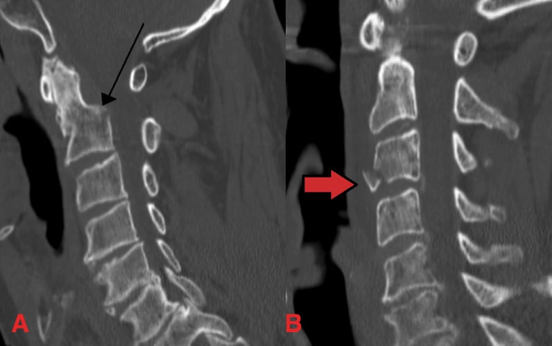 The cervical spine acts to support the head and provide mobility. However, it is susceptible to injury as a result, alongside having relatively small vertebral bodies. The vertebrae of the cervical spine are frequently fractured; C2 (~30%) and C7 (~20%) are the most commonly fractured vertebrae. Due to the differing shape of C1 and C2, relative to the other cervical vertebrae, they present with unique fracture patterns that vary significantly compared to conventional cervical fractures. Classification There are many classification systems to describe fractures of the cervical spine, however the AO classification is most universally used. For upper cervical fractures (involving the C1 or C2 vertebrae), the AO system divides them into: Region(s) involved: Type 1 = occipital condyle and craniocervical junction Type 2 = C1 ring and C1/2 joint Type 3 = C2 and C2/3 joint (Fig. 1A) Injury type: Type A = bony injury only Type B = tension band injuries Type C = translation injuries. For subaxial fractures, the AO system divides them into: Injury type: Type A = compression injuries (Fig. 1B) Type B = distraction injuries Type C = translation injuries (Fig. 3) Type F = facet joint injury Adapted from James Heilman, MD, CC BY-SA 3.0 <https://creativecommons.org/licenses/by-sa/3.0> via Wikimedia Commons, and James Heilman, MD, CC BY-SA 4.0 <https://creativecommons.org/licenses/by-sa/4.0> via Wikimedia Commons Figure 1CT scan showing (A) fracture at the base of the dens (B) fracture of the C3 vertebral body Clinical Features Among younger patients, cervical fractures are usually the result of high-energy trauma, whilst older patients can develop cervical fractures from low impact injuries, especially if underlying osteoporosis is present. Patients can present with neck pain, but this is not always the case, especially if there are concurrent (i.e. distracting) injuries. There may be varying degrees of neurological involvement present, depending on the level of spinal cord involvement (further discussed here). Alongside potential sensory and motor deficits, innervation to the diaphragm and vasomotor tone can also be affected. Any injury to the vertebral artery from a cervical fracture (especially in high cervical fractures) may present with a posterior circulation stroke. Differential Diagnosis Differentials for patients presenting with cervical neck pain, with or without neurology, following injury include cervical spondylosis, cervical dislocation, or whiplash injury. Eponymous Fractures Jefferson Fracture A Jefferson fracture is the eponymous name given to a burst fracture of the atlas (Fig. 2A). It is caused by axial loading of the cervical spine resulting in the occipital condyles being driven into the lateral masses of C1. They are often associated with head injuries and other concurrent cervical spinal injuries. These fractures are usually unstable and account for approximately a third of all C1 fractures. Hangman’s Fracture A Hangman’s fracture, also termed as traumatic spondylolisthesis of the axis, describes a fracture through the pars interarticularis of C2 bilaterally (Fig. 2B), usually with subluxation of the C2 vertebra on C3. These are caused by cervical hyperextension and distraction (historically the forces that were delivered by a noose). These fractures can be unstable; in such cases, surgical fixation will be required. Odontoid Peg Fractures Odontoid peg fractures are common cervical fractures, most common in older patients. Patients can present following low-impact injuries, neck pain being common. The condition can be fatal, especially with significant displacement of the odontoid; those who survive can have no neurology. Hellerhoff, CC BY-SA 3.0 <https://creativecommons.org/licenses/by-sa/3.0> via Wikimedia Commons, and Lucien Monfils, CC BY-SA 3.0 <https://creativecommons.org/licenses/by-sa/3.0>, via Wikimedia Commons Figure 2(A) CT scan demonstrating a Jefferson Fracture (B) Pain film radiograph demonstrating a Hangman’s Fracture Investigations Any suspected cervical spine injury needs imaging, and the Canadian C-Spine Rules (further discussed here) can help in the assessment. NICE guidelines will suggest for suspected cervical spinal fractures: Perform a CT scan in adults, if suggested by Canadian C-spine rules Perform MRI for children, if suggested by Canadian C-spine rules Only consider a plain film radiograph in children for those who do not fulfil the criteria for MRI but where clinical suspicion remains after repeated clinical assessment. Whilst CT imaging has become the mainstay for cervical fracture diagnosis, MRI is also useful to assess for concurrent injury of soft tissue structures, such as the intervertebral discs, spinal cord, nerve roots and posterior ligaments. Frank Gaillard, CC BY-SA 3.0 <https://creativecommons.org/licenses/by-sa/3.0>, via Wikimedia Commons Figure 3CT scan showing fracture dislocation at level C6/7 Management Patients with a suspected cervical fracture must be managed as per ATLS guideline, including 3-point C-spine immobilisation, until any potential injuries have been excluded. Restricting movement of the spine is recommended to prevent potential damage to the spinal cord; movement at the level of an unstable fracture can cause further neurological deficit*. All cervical fractures need discussion with spinal specialists. Non-operative management can be appropriate for stable injuries (or may be needed for patients in whom surgical intervention is high risk): Rigid collars are used for immobilisation of the cervical spine during extrication and initial assessment Halo vests are used when more rigid support is needed, and are favoured for the non-operative treatment of unstable cervical spine fractures Pins are placed in the outer table of the skull under local anaesthesia, and are connected to a halo device, which is mounted on a thoracic brace. Traction devices can be used for definitive treatment when operative treatment is high risk