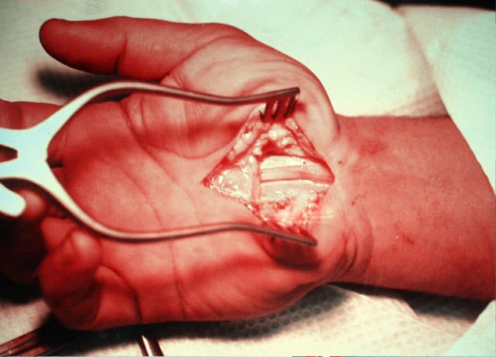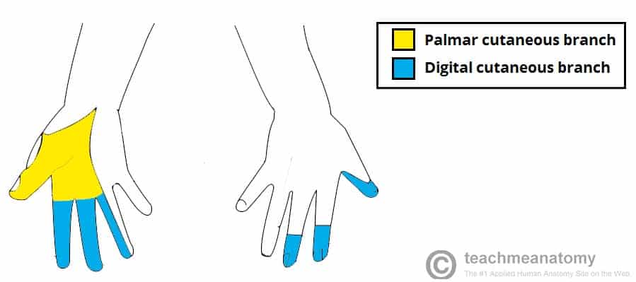 Carpal tunnel syndrome (CTS) is a condition involving a compression of the median nerve within the carpal tunnel of the wrist, due to a raised pressure within this compartment. Compression of the median nerve leads to symptoms of pain, numbness, and paresthesia in the lateral 3½ digits. CTS accounts for 90% of all nerve compression syndromes. It is more common in women and has peak incidence between ages 45-60 (only 10% of CTS cases are in patients under 30 years of age). In this article, we shall look at the risk factors, clinical features and management of carpal tunnel syndrome. By TeachMeSeries Ltd (2025) Figure 1Transverse section of the carpal tunnel Risk Factors The main risk factors for developing carpal tunnel syndrome include female gender, increasing age, pregnancy, obesity, and previous injury to the wrist. Carpal tunnel syndrome is as associated with other conditions, such as diabetes mellitus, rheumatoid arthritis, and hypothyroidism. Individuals who have occupations involving repetitive hand or wrist movements (e.g. vibrating tools or assembly line work) are also potentially at increased risk of CTS. Clinical Features Patients with carpal tunnel syndrome typically complain of pain, numbness, and/or paraesthesia throughout the median nerve sensory distribution. The palm is often spared, due to the palmar cutaneous branch of the median nerve branching proximal to the flexor retinaculum and passing over the carpal tunnel. Symptoms are typically worse during night and symptoms can often be temporarily relieved by hanging the affected arm over the side of the bed or by shaking it back and forth. On examination there are often no visible findings during early stages of CTS. However, sensory symptoms can be reproduced by either percussing over the median nerve (Tinel’s Test) or holding the wrist in full flexion for one minute (Phalen’s Test). In the later stages of carpal tunnel syndrome, there may be weakness of thumb abduction (due to denervation atrophy of the thenar muscles) and / or wasting of the thenar eminence (Fig. 2). Adapted from Dr. Harry Gouvas, MD, PhD [Public domain], via Wikimedia Commons Figure 2Wasting of the thenar eminence in a case of untreated CES Differential Diagnosis Cervical Radiculopathy C6 nerve root involvement may produce pain or paraesthesia in a similar distribution however will likely have an element of neck pain or symptoms involving the entire arm length Pronator teres syndrome (median nerve compression by pronator teres) Symptoms will also extend to the proximal forearm and sensation of the palm will also be reduced Flexor carpi radialis tenosynovitis This can be distinguished by tenderness at the base of the thumb By TeachMeSeries Ltd (2025) Figure 3Schematic of the cutaneous innervation of the branches of the median nerve. Investigation Carpal tunnel syndrome is a clinical diagnosis and is an evident pathology in most cases on history and examination However, in the more uncertain cases, nerve conduction studies may be useful to confirm median nerve damage (however a normal median nerve conduction does not rule out CTS) Management Carpal tunnel syndrome can be treated conservatively initially with a wrist splint (commonly worn at night), which can relieve some of the symptoms by preventing wrist flexion. Hand therapy can also be prescribed. Corticosteroids injections can be trialled. They are administered directly into carpal tunnel to reduce swelling and in turn symptoms. Some clinicians may also trials NSAIDs in an attempt to further reduce swelling, however there is limited evidence to support their routine use. Surgical Treatment Surgical treatment is undertaken in symptomatic patient, where previous treatments (splints and hand therapy) have not been successful. Carpal tunnel release surgery (Fig. 4) decompresses the carpal tunnel, involving cutting through the flexor retinaculum, in turn reducing the pressure on the median nerve. This can be done under local anaesthetic and is performed as a day case. By Dr.Harry Gouvas, MD, PhD [Public domain], via Wikimedia Commons Figure 4 Release Surgery for Carpel Tunnel Syndrome Complications of carpal tunnel surgery include recurrence, persistent CTS symptoms (from incomplete release of ligament), infection, scar formation, nerve damage, or trigger thumb. However overall post-operative outcomes are good, with 90% of patients reporting improved symptoms afterwards. Complications Long-term untreated CTS can lead to permanent neurological impairment that will not improve with surgery. Key Points Carpal Tunnel Syndrome is caused by compression of the median due to a raised pressure within the carpal tunnel Patients will typically complain of pain, numbness, and paraesthesia throughout the median nerve sensory distribution Diagnosis is typically a clinical one Patients will initially be managed conservatively, however some may have to undergo Carpal Tunnel Release Surgery if symptoms persist Rate This Article