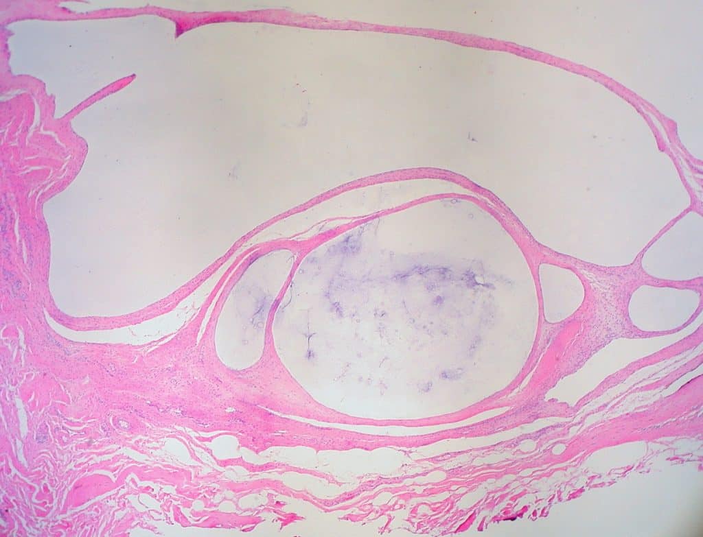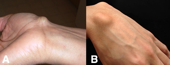 Ganglionic cysts are non-cancerous soft tissue lumps that occur along any joint or tendon. They arise from degeneration within the joint capsule or tendon sheath of the joint, subsequently becoming filled with synovial fluid (Fig. 1). They are most commonly found around the hands and feet, with 60-70% of ganglions appearing on the dorsal aspect of the wrist. More common in females, they have a peak age of onset of 20-40 years old. In this article, we shall look at the risk factors, clinical features and management of ganglionic cysts. By Ed Uthman, Attribution 2.0 Generic (CC BY 2.0) Figure 1Histological section of ganglionic cyst Risk Factors The main risk factors for developing a ganglionic cyst include: Female Osteoarthritis* Previous joint or tendon injury *Osteoarthritis can cause an increase of the fluid in the joint, resulting in a leakage through the tendon sheath into the cyst Clinical Features A ganglionic cyst typically presents as a smooth spherical painless lump adjacent to the joint affected (Fig. 2). It may have appeared suddenly or grown over time. In some cases, the cyst may have subsided initially, to then reappear at a later date. On examination, the lump will be soft and will transilluminate, however may mechanically restrict the full range of motion in the affected joint. If the cyst exerts any pressure upon an adjacent nerve(s), the patient may present with localised paresthesia, pain, or motor weakness. Adapted from GEMalone (Own work) CC BY 3.0, via Wikimedia Commons, and from Cieslaw (CC BY-SA 3.0) Figure 2(A) Ganglion located on the volar aspect of the wrist (B) Ganglion located on the dorsal surface of the hand Differential Diagnosis Tenosynovitis – no discrete mass, with the swelling tracking along the tendon. Giant cell tumour of tendon sheath – the mass is solid, does not translumuniate, and is fixed to the underlying sheath (therefore less mobile than a cyst). Lipoma – This will not be entirely spherical and does not trans-illuminate. Osteoarthritis – usually accompanied from a long standing OA of the scaphotrapeziotrapezoid joint, presenting as a palpable, hard, non-cystic, and immobile mass that does not trans-illuminate. Sarcoma – typically are not well circumscribed or mobile lesions. Investigations Most ganglion cysts are diagnosed clinically. A plain film radiograph may assist in ruling out osteoarthritis or bone malignancies as differentials, as ganglions cannot be visualised via X-ray. In uncertain cases, imaging via ultrasound or MRI can be done in order to assess the shape, size, and depth of the cyst. Due to their high sensitivity, such imaging may also pick up incidental cysts that have not yet grown large enough to be symptomatic. A ganglionic cyst can be aspirated for temporary symptomatic relief (however there is a high rate of recurrence) and any fluid extracted can be sent off for microscopy +/- cytology if required. Management If the cyst does not cause any pain, the usual recommended treatment is to simply monitor, as cysts often disappear spontaneously without further intervention. If the cyst causes pain or severely limits range of movement, there are two main interventions that can be performed: Aspiration +/- steroid injection*, although this is associated with infection and high rate of recurrence. *There is only limited evidence demonstrating a clear benefit of steroid injections in ganglion. Cyst excision, removing the cyst capsule along with a portion of the associated tendon sheath (recurrence is less than with aspiration, but still possible) Often reserved for symptomatic cases with recurrence following aspiration. Key Points Ganglionic cysts are non-cancerous soft tissue lumps that occur along any joint or tendon They appear as smooth spherical painless lumps, that are soft and transilluminate on examination Diagnosis is clinical and most cases will be managed conservatively, intervention only indicated in symptomatic cases or those limiting range of movement Rate This Article