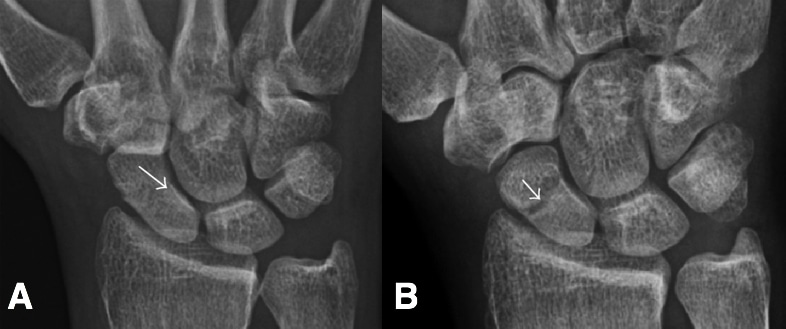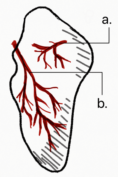 The scaphoid is ‘boat’-shaped* bone and is the most common carpus to be fractured. Scaphoid fractures are most common in men aged 20-30 years and are high-energy injuries. Approximately 10% have an associated fracture. They are very commonly referred to orthopaedics, due to diagnostic uncertainty; however, only around 1 in 10 referred patients actually have a scaphoid fracture. *The word scaphoid derived from the Greek word “skaphos”, which means boat By TeachMeSeries Ltd (2020) Figure 1The carpal bones Pathophysiology The scaphoid is anatomically divided into three parts: the proximal pole, waist, and distal pole. It is important to appreciate the blood supply to the scaphoid (Fig. 2), which is by branches of the radial artery. The dorsal branch of the radial artery, which supplies 80% of the blood, enters in the distal pole and travels in a retrograde fashion towards the proximal pole. Consequently, fractures can compromise the blood supply, leading to avascular necrosis (AVN) and subsequent degenerative wrist disease. The more proximal the scaphoid fracture, the higher the risk of AVN. By Iiibalesiii [CC BY-SA 4.0 (https://creativecommons.org/licenses/by-sa/4.0)], from Wikimedia Commons Figure 2Blood supply to the scaphoid (a) volar branch (b) dorsal branch (supplying 70-80% blood supply to the scaphoid, travelling towards the proximal pole) Clinical Features The scaphoid is fractured following trauma, which is often high energy. Patients will complain of sudden onset wrist pain and bruising may be present. There is tenderness in the floor of the anatomical snuffbox, pain on palpating the scaphoid tubercle, and pain on telescoping of the thumb. The Anatomical Snuffbox The anatomical snuffbox (also termed the radial fossa) is a triangular depression found on the lateral aspect of the dorsum of the hand, located at the level of the carpal bones. It is defined laterally by the abductor pollicis longus and extensor pollicis brevis tendons (the 1st extensor compartment), and medially by the extensor pollicis longus tendon (the 3rd extensor compartment). The contents of the snuffbox includes the radial artery, superficial radial nerve, and the cephalic vein. The floor of the snuffbox is made of the scaphoid, along with the trapezium (distally) and the radial styloid (proximally); tenderness in this area may indicate a scaphoid fracture, but this is not specific. Differential Diagnosis The main differentials of radial wrist pain following trauma are distal radial fracture, an alternative carpal bone fracture, fracture of the base of the 1st metacarpal, ulnar collateral ligament injury, wrist sprain, or De Quervains tenosynovitis. Investigations For suspected cases of scaphoid fracture, initial plain radiographs should be taken. A “scaphoid series” should be requested, including anteroposterior, lateral, oblique views. Scaphoid fractures are not always detected by initial radiographs (especially undisplaced fractures); if there remains sufficient clinical suspicion, despite negative initial imaging, the patient should have the wrist immobilised in a thumb splint and repeat plain radiographs in 10-14 days for further evaluation (Fig. 3). If repeat radiographic imaging is negative, however clinical findings are still in keeping with a scaphoid fracture, an MRI scan of the wrist is indicated. This is the definitive investigation and, whilst it is awaited, the interim management is as for a fracture. Adapted from Mohamed Jarraya, Daichi Hayashi, Frank W. Roemer, Michel D. Crema, Luis Diaz, Jane Conlin, Monica D. Marra, Nabil Jomaah, and Ali Guermazi [CC BY 3.0 (https://creativecommons.org/licenses/by/3.0)], via Wikimedia Commons Figure 3(A) Initial AP radiograph showing a subtle linear lucency within the scaphoid (B) more pronounced lucency observed in repeat imaging after 12 days Management The treatment of scaphoid fractures is determined by location of the fracture and degree of the fracture. Undisplaced fractures can typically be managed with strict immobilisation in a plaster with a thumb spica splint. However, undisplaced fractures of the proximal pole have a high risk of AVN and surgical treatment may be advocated, particularly if it is the dominant hand of a working-age patient. All displaced fractures should be fixed operatively. The most common operative technique is using a percutaneous variable-pitched screw, which can be placed across the fracture site to compress it. Complications Avascular necrosis is common complication of a scaphoid fracture (in around 30% of cases), with its risk increasing the more proximal the fracture. Non-union is the bone failing to heal properly, most commonly due to a poor blood supply. It is particularly common in scaphoid fractures (in around 10% of cases) that go undiagnosed or are inappropriately managed. Such cases can be managed with internal fixation and bone grafts, although the morbidity is high, even with surgical repair. Key Points The scaphoid is the most commonly fractured carpal bone, often occurring through falling on an outstretched hand Diagnosis is based on history, clinical examination, and imaging If initial radiographs do not show evidence of a fracture however there is sufficient clinical suspicion, treat conservatively and re-image in two weeks Important complications of scaphoid fractures are avascular necrosis and non-union Do you think you’re ready? Take the quiz below Pro Feature - Quiz Scaphoid Fractures Question 1 of 3 Submitting... Skip Next Rate question: You scored 0% Skipped: 0/3 Keep your streak going Unlock the full question bank You’ve made a great start. Continue with over 1,200 MRCS-style MCQs, two full mock papers, and ad-free revision with TeachMeSurgery Pro. Continue with Pro Rate This Article