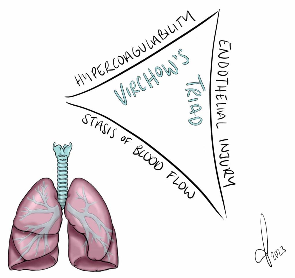 Venous thromboembolism (VTE) is a term used to describe both deep vein thrombosis (DVT) and pulmonary embolism (PE) – disorders caused by thrombus formation. All patients being admitted to the hospital or undergoing surgery should be assessed for VTE risk on admission and re-assessed within 24 hours or if a change occurs in the clinical situation. VTE is one of theleading causes of preventable death in hospitals and is an important topic for juniors doctors to understand. Pathophysiology The formation of a thrombus in a patient is dependent on any one of Virchow’s Triad (Fig. 1) being present: Abnormal blood flow– usually due to recent immobility, such as a long-distance flight or being bed-bound in hospital (this is the most common underlying cause of a DVT) Abnormal blood components – can be caused by multiple factors, such as smoking, sepsis, malignancy, or even inherited blood disorders (e.g. Factor V Leiden) Abnormal vessel wall – can be from atheroma formation, inflammatory response, or direct trauma By Rebecca Varley, TeachMeSurgery [CC-BY-NC-ND 4.0] Figure 1Virchow’s triad Risk Factors The main risk factors for developing a venous thromboembolism include: Increasing age Previous VTE Smoking Pregnancy or recently post-partum Recent surgery (especially abdominal surgery, pelvic surgery, or hip or knee replacements) or prolonged immobility (approx. > 3 days) Hormone replacement therapy or combined oral contraceptive pill Current active malignancy Obesity Known thrombophilia disorder (e.g. antiphospholipid syndrome or Factor V Leidin) Deep Vein Thrombosis A deep vein thrombosis refers to the formation of a blood clot in the deep veins of a limb, most commonly affecting those of the legs or pelvis. Clinical Features The most common presenting symptom of a DVT is unilateral leg pain and swelling (Fig. 2). Other symptoms include low-grade pyrexia, pitting oedema, tenderness, or prominent superficial veins. Importantly, 65% of DVTs are asymptomatic. By James Heilman [CC BY-SA 3.0], via Wikimedia CommonsFigure 2Deep vein thrombosis in the right leg Investigations If a deep vein thrombosis is suspected in a patient, the DVT Wells’ Score should be calculated: Score less than or equal to 1 – DVT is clinically unlikely, requires a further D-dimer test to exclude Score greater than 1 – DVT is clinically likely and a DVT diagnosis should be confirmed via either an ultrasound scan (more common) or a contrast venography (rarely used) It is important to note that a D-dimer test is sensitive but not specific, specifically a D-dimer may also be raised following recent surgery or trauma, ongoing infection or inflammation, liver disease, or pregnancy. Investigating for Underlying Causes Around 10% of DVT patients are subsequently diagnosed with a malignancy. As such, patients should have a thorough history & examination performed, alongside basic blood tests (FBC, U&Es, LFTs, clotting screen). Age-appropriate cancer screening investigations may be required in unprovoked cases, such as CT imaging, to search for an underlying cause. Management Direct oral anticoagulants* (DOACs) are now recommended as first line treatment for DVT. Caution is advised in those with chronic renal impairment or if taking potentially interacting medications. Certain individuals may warrant Vitamin K antagonists (i.e. Warfarin) instead, which needs therapeutic LMWH to cover until the the patients INR levels are sufficiently therapeutic. LMWH alone is recommended in patients with cancer-associated VTE, due to lower recurrence rates than on Warfarin. Anticoagulation treatment should be continued for 3 months in most patients with a provoked DVT. in those with a proximal DVT and a persistent risk factor or high risk of DVT recurrence may require lifelong anticoagulation *DOACs include direct factor Xa inhibitors (apixaban, rivaroxaban, and edoxaban) and direct thrombin inhibitor (dabigatran); whilst dabigatran and edoxaban require initial cover with low molecular weight heparin (LMWH) (>5 days) before commencement of the DOAC, rivaroxaban and apixaban do not Pulmonary Embolism A Pulmonary Embolism (PE) refers to a blockage of the pulmonary artery by a substance that has travelled there in the bloodstream. Most commonly, this blockage is a thrombosis that has migrated. such as from a Deep Vein Thrombosis. Other causes include a right-sided mural thrombus (e.g. post-MI), atrial fibrillation (AF), neoplastic cells, or from fat cells (e.g. following tibial fracture). Clinical Features The key clinical features of a PE are sudden onset dyspnoea, pleuritic chest pain, cough, or (rarely) haemoptysis. Clinically, a patient may have tachycardia, tachypnoea, pyrexia, a raised JVP (rare), or pleural rub or pleural effusion (rare). Remember to examine for any signs of DVT in any patient with suspected PE. Adobe Stock, licensed to TeachMeSeries Ltd Figure 3Microscopic view of micro-embolism within pulmonary vessel Investigation and Management If pulmonary embolism is suspected in a patient, the PE Wells’ Score should be calculated: Score less than or equal to 4 – PE clinically unlikely, requires a further D-dimer test to exclude* Score greater than 4 – PE clinically likely and a PE diagnosis should be confirmed with a CT Pulmonary Angiography (CTPA) scan (or V/Q scan in those with poor renal function). As with DVTs, it is important to note that a D-dimer test is sensitive but not specific, specifically a D-dimer may also be raised following recent surgery or trauma, ongoing infection or inflammation, liver disease, or pregnancy. An ECG should be performed given patients often present with chest pain, however the most common ECG finding in PE is no abnormality or sinus tachycardia* *Less commonly, a PE may present on ECG with a right bundle branch block (RBBB), RV strain (inverted T waves in V1-V4 and / or leads AvF-III), or a rare S1Q3T3 (deep S wave in Lead I, pathological Q wave in Lead III, and inverted T wave in L