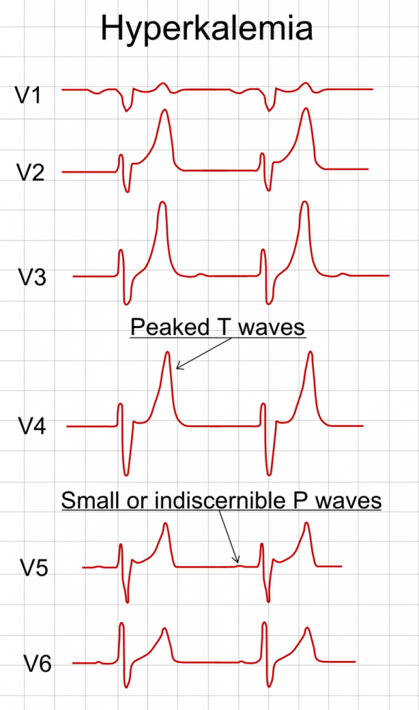 Hyperkalaemia is defined as an elevated serum potassium, greater than 5.5 mmol/l (may vary depending on local reference ranges) Whilst usually asymptomatic at relatively low levels, it is important to identify and treat the condition early due to cardiac and other complications that may arise. Causes The most common causes of hyperkalaemia in the post-operative patient are: Post-operative Acute Kidney Injury Repeated blood transfusions Drugs: Potassium-Sparing Diuretics, including Spironolactone ACE inhibitors (or ARBs) Excessive potassium treatment Presentation A patient may commonly be asymptomatic; symptoms are rare in patients with a potassium serum concentration of less than 7.0mmol/l. Any symptoms of hyperkalaemia that may present include paraesthesia, muscle weakness, nausea and vomiting, and palpitations. Assessment and Investigations The assessment of any patient with hyperkalaemia needs to be timely and is often performed simultaneously with treatment. The initial investigations required are: Routine bloods, including U&Es, Ca2+ and PO42-, and Mg2+ Venous blood gas (VBG) A VBG will provide an immediate result of the patient’s potassium levels ECG (as discussed below) Catheterisation, if necessary (for fluid balance monitoring) The patients observations and fluid status should be reviewed, as well as their medication (identifying any precipitants of hyperkalaemia). ECG Changes in Hyperkalaemia By TeachMeSeries Ltd (2025) Figure 1ECG findings in the precordial leads in hyperkalaemia The ECG is vital in the assessment of hyperkalaemia, as ECG findings will progress with increasing serum levels. Whilst the ECG findings generally can be correlated to the serum potassium concentration (Fig. 1), potentially life-threatening arrhythmias can occur without warning in hyperkalaemia. Mild (5.5 – 6.5mmol) Tall ‘tented’ T waves (seen across the precordial leads) Prolonged PR segment Moderate (6.5 – 7.5mmol) Decreased or ‘flattened’ P wave Prolonged QRS complex Severe (> 7.5mmol) Progressive widening of the QRS complex Axial deviation and Bundle Branch Blocks The progressively widened QRS eventually merges with the T wave, forming a sine wave pattern. Subsequent Ventricular Fibrillation (VF) or asystole may then follow. Management The management of a hyperkalaemic patient can be considered in three parts: Stabilisation of the myocardium Reduction of serum potassium Reduction of total body potassium Whilst the rationale for the first and second management strategies may be self-evident, it is important to consider that the underlying cause for the hyperkalaemia must also be addressed. Early and repeated blood testing is vital and any ECG changes warrant urgent treatment and moving the patient to a high-dependency area. Alert a senior to any complications developing. Stabilisation of the Myocardium A stat dose of intravenous Calcium Gluconate or Calcium Chloride (typically 10ml of 10%, dependent on local guidelines) should be started, either when ECG changes are present or in all cases of moderate or severe hyperkalaemia Continuous cardiac monitoring is required following stabilisation treatment in such cases. Reduction of Serum Potassium Variable rate insulin with dextrose infusion should be started (typically 200ml of 20% glucose with 10U of insulin over 30mins, yet varies with local policy), acting to increase cellular uptake of potassium and thus reduce serum concentration. These measures are only short term, as the potassium will leave the cells within 30-60 minutes, therefore repeated doses may be required. Salbutamol nebulisers may also be additionally added in for further (albeit limited) reduction. Reduction of Total Body Potassium Any reversible underlying cause should be identified and appropriately managed*. Referral to renal physicians may be warranted in cases of severe hyperkalaemia or resistant hyperkalaemia potentially warranting haemodialysis. *Oral calcium resonium can be used to reduce total body potassium, reabsorbing potassium into the bowel intra-luminally, however this step is complex and specialist input should be sought early. Key Points Hyperkalaemia is an elevated serum potassium There are several potential causes of hyperkalaemia, most commonly renal impairment or iatrogenic Typically asymptomatic, however can cause cardiac instability if not identified and treated appropriately Management involves stabilisation of the myocardium, reduction of serum potassium, and reduction of total body potassium Do you think you’re ready? Take the quiz below Pro Feature - Quiz Hyperkalaemia Question 1 of 3 Submitting... Skip Next Rate question: You scored 0% Skipped: 0/3 Keep your streak going Unlock the full question bank You’ve made a great start. Continue with over 1,200 MRCS-style MCQs, two full mock papers, and ad-free revision with TeachMeSurgery Pro. Continue with Pro Rate This Article