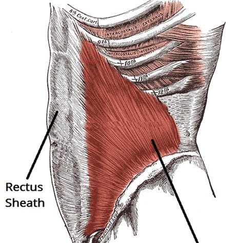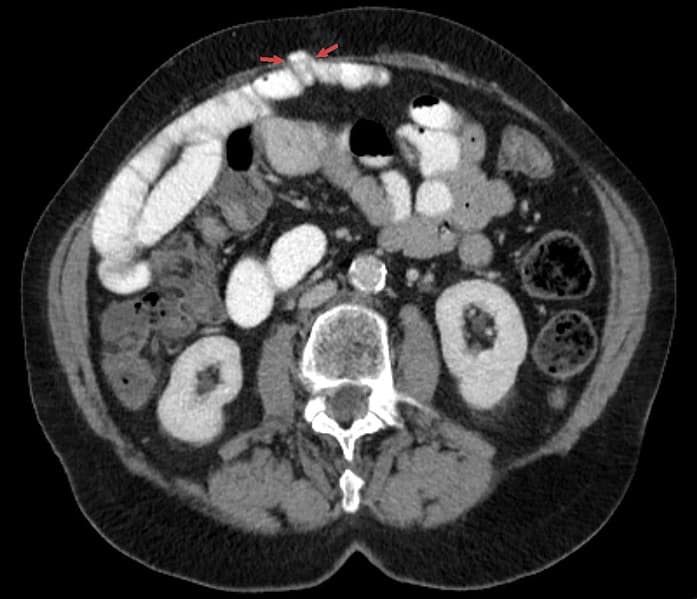 An incisional hernia is the protrusion of the contents of a cavity (usually the abdomen) through a previously made incision in the compartment’s wall. They occur (by definition) after an operation, and unfortunately are a common complication of abdominal surgery, with prevalence following laparotomy around 5.2% at 1year (nearly 25% by 2yrs). In this article, we shall look at the risk factors, clinical features and management of an incisional hernia. Pathophysiology The layers of the anterior abdominal wall are normally strong and act to maintain the integrity of the abdominal cavity. However, once these layers are interrupted by a surgical incision, their continuity is disrupted and become structurally weakened. In the presence of increased intra-abdominal pressure and potential risk factors (such as smoking or obesity), the contents of the abdomen are able to herniate through the weakness, forming an incisional hernia. As with any hernia, complications can occur, such as incarceration, strangulation, or obstruction. By TeachMeSeries Ltd (2025) Figure 1The rectus sheath and external oblique Risk Factors The risk factors for incisional hernia following abdominal surgery include (ranked by relative risk): Emergency Surgery Emergency surgery carries double the risk of elective surgery BMI >25 Obese patients are more likely to develop an incisional hernia Midline incision There is a 74% risk increase compared to non-midline Post-operative wound infection This increases incisional hernia risk by 70% Diabetes Mellitus, Connective Tissue Disorders, or Steroid Use Advancing age Current Smoker Clinical Features The characteristic clinical feature of an incisional hernia is a reducible, soft and non-tender swelling at or near the site of a previous surgical wound. If the hernia is incarcerated, it can become painful, tender, and erythematous. On examination, a mass is palpable at or near the site of the surgical incision, which may be reducible into the abdominal cavity (depending on its severity). Ensure to also check the groins for the other hernial orifices. Ensure to check for clinical features of obstruction and ischaemia. Investigations In most cases of incisional hernia, the diagnosis is made on a clinical basis. However, often radiological imaging can be used to confirm the diagnosis, most commonly CT imaging* (Fig. 2). *CT imaging can not only confirm the diagnosis, but in large incisional hernia can help plan operative management Hellerhoff, CC BY-SA 4.0 <https://creativecommons.org/licenses/by-sa/4.0>, via Wikimedia Commons Figure 2CT imaging showing a small bowel loop within an abdominal incisional hernia at the midline (arrow) Management The management of an incisional hernia should be considered on a case-by-case basis. The majority of incisional hernias are asymptomatic and can be managed electively. Surgery is typically indicated in patients with symptomatic hernias who are clinically fit enough for surgery. The size of the hernia and the abdominal wall defect, the clinical features, the patient’s age and co-morbidities, and the patient’s preferences should all be taken into account. Incisional hernias can be repaired using a variety of techniques, including suture repair (for very small hernias), laparoscopic mesh repair, and open mesh repair. For large incisional hernia, varying degrees of abdominal wall reconstruction may be required. Prognosis Many incisional hernias remain asymptomatic life-long; 6-15% of them will incarcerate and 2% will progress to strangulation. Key Points An incisional hernia is a hernia that occurs through a previously made incision in the abdominal wall Diagnosis is typically clinical, however imaging can help to confirm the diagnosis and elucidate the anatomy Management is decided on a case-by-case basis, however if suitable most patients will warrant surgical intervention Do you think you’re ready? Take the quiz below Pro Feature - Quiz Incisional Hernia Question 1 of 2 Submitting... Skip Next Rate question: You scored 0% Skipped: 0/2 Keep your streak going Unlock the full question bank You’ve made a great start. Continue with over 1,200 MRCS-style MCQs, two full mock papers, and ad-free revision with TeachMeSurgery Pro. Continue with Pro Rate This Article