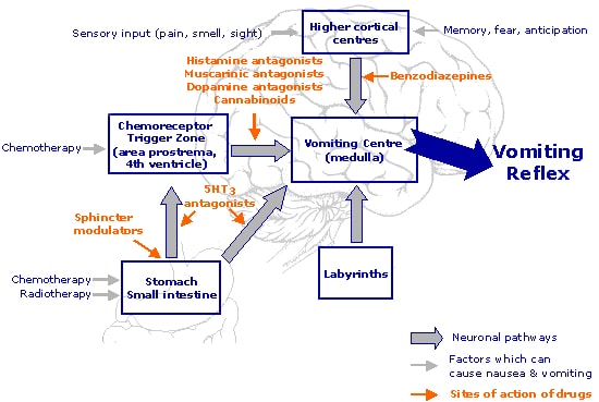 Post-operative nausea and vomiting (PONV) can be one of the most distressing parts of the surgical journey. It affects approximately 20-30% patients within the first 24-48 hours post-surgery. The consequences of PONV can include increased anxiety for future surgical procedures, increased recovery time and hospital stay, and, in severe cases, aspiration pneumonia, metabolic alkalosis, and surgical complications. Risk Factors There are a number of risk factors for PONV. They can be divided into patient factors, surgical factors, and anaesthetic factors. Patient factors Female gender Age (incidence declines throughout adult life) Previous PONV or motion sickness Use of opioid analgesia Non-smoker Surgical factors Intra-abdominal laparoscopic surgery Intracranial or middle ear surgery Squint surgery (highest incidence of PONV in children) Gynaecological surgery, especially ovarian Prolonged operative times Poor pain control post-operatively Anaesthetic Factors Opiate analgesia or spinal anaesthesia Inhalational agents (e.g. Isoflurane, nitrous oxide) Prolonged anaesthetic time Intraoperative dehydration or bleeding Overuse of bag and mask ventilation (leading to gastric dilatation) Pathophysiology There are two areas in the nervous system that play a key role in the control of vomiting and nausea Vomiting centre – located within the lateral reticular formation of the medulla oblongata, which controls and coordinates the movements involved in vomiting Chemoreceptor trigger zone – located in the area postrema (situated at the inferoposterior aspect of the 4th ventricle), which is located outside the blood brain barrier and can therefore respond to stimuli in the circulation The vomiting centre receives input from the chemoreceptor trigger zone, gastrointestinal tract, vestibular system, and higher cortical structures (such as sight, smell and pain), resulting in nausea (Fig. 1). If the stimuli are sufficient, it acts on the diaphragm, stomach and abdominal musculature to initiate vomiting. A number of neurotransmitters are involved in the control of vomiting. This is important clinically, as they can be targeted by anti-emetic medications. A summary of the neurotransmitters in the vomiting process: Chemoreceptor trigger zone – Dopamine and 5HT3 receptors Vestibular apparatus – Acetylcholine and Histamine receptors Gastrointestinal tract – Dopamine receptors Vomiting centre – Histamine and 5HT3 receptors By Oxygen Time Release Figure 1The pathways and neurotransmitters involved in the control of vomiting Clinical Assessment When assessing a patient suffering with PONV, the first priority is to ensure that they are safe and stable – if in any doubt, an ABCDE approach should be taken. If the patient is drowsy or vomiting there is a risk of aspiration, so airway assessment and use of an nasogastic tube may be required. Consider the following questions during your assessment of the patient: What was the operation? Is it likely to cause PONV? Which anaesthetic agents/post-operative drugs have been used? Are there other factors contributing to nausea? Which antiemetic therapy would suit this patient best? In addition, it is important to be aware of alternative causes of nausea and vomiting in the post-operative patient, such as infection, gastrointestinal causes (post-operative ileus, bowel obstruction), metabolic causes (hypercalcaemia, uraemia, diabetic ketoacidosis), medication (antibiotics, opioids), neurological causes (raised ICP), or psychiatric causes (anxiety). Management The management of post-operative nausea and vomiting can be divided into three areas; prophylactic, conservative and pharmaceutical. Prophylactic Measures Anaesthetic measures – reduce opiates, reduce volatile gases, avoiding spinal anaesthetics Prophylactic antiemetic therapy Dexamethasone at induction of anaesthesia Conservative Measures Adequate fluid hydration Adequate analgesia Consider nasogastric tube insertion to aid gastric decompression Pharmaceutical Measures A wide variety of pharmacological options are available for anti-emetic action and it is important that the choice of antiemetic is considered by the likely cause of the nausea. Multi-modal therapy is often more effective, therefore add in a different antiemetic to that given in theatre. Patients with impaired gastric emptying or gastric stasis should be trailed on a prokinetic agent, such as metoclopramide (dopamine antagonist) or domperidone (dopamine antagonist), unless bowel obstruction is suspected A suspected metabolic or biochemical imbalance, such as uraemia, electrolyte imbalance, or cytotoxic agents, causing PONV can be trialled on metoclopramide Opioid-induced PONV typically responds well to ondansetron (5-HT3 receptor antagonist) or cyclizine (H1 Histamine receptor antagonist) Key Points Identifying patients who are at risk of post-operative nausea and vomiting will aid in their management A range of antiemetic medications are available and are often used in combination Nausea and vomiting may be a sign of post-operative complication, such as paralytic ileus Do you think you’re ready? Take the quiz below Pro Feature - Quiz Post-Operative Nausea and Vomiting Question 1 of 3 Submitting... Skip Next Rate question: You scored 0% Skipped: 0/3 Keep your streak going Unlock the full question bank You’ve made a great start. Continue with over 1,200 MRCS-style MCQs, two full mock papers, and ad-free revision with TeachMeSurgery Pro. Continue with Pro Rate This Article