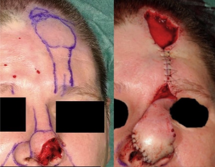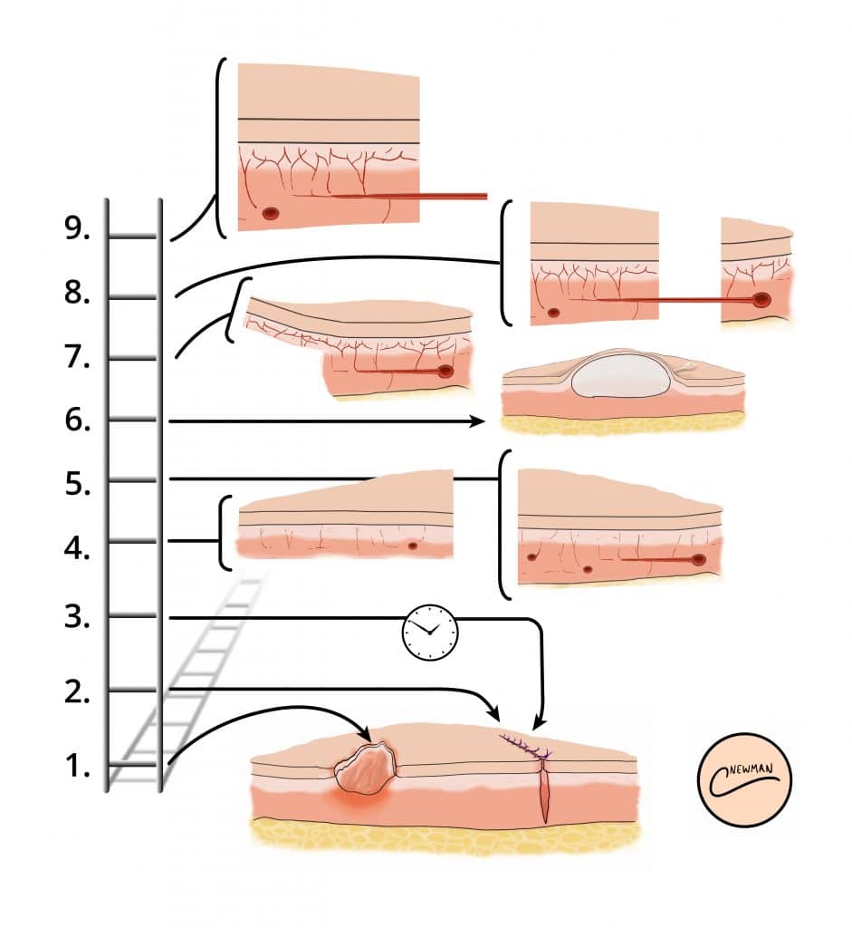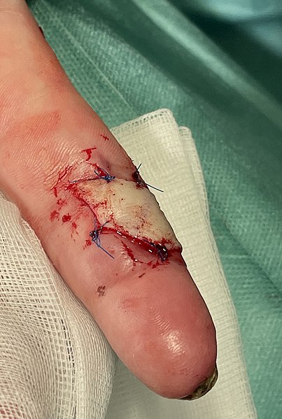 Skin grafts and skin flaps are two surgical techniques that are commonly utilised by plastic surgeons when a defect cannot be closed by primary or secondary intention (Fig. 1, see Reconstructive Ladder). The key differences between a graft and a flap is in regards to its blood supply; a skin graft receives its blood supply from the recipient site though the vascular bed, whilst a skin flap brings its blood supply from the flap donor site. They can be used to cover sizeable defects however contra-indications to their use include infection, known skin cancer, and certain patient co-morbidities (immunosuppression, current smoker, poorly controlled diabetes) By Thomas Newman, TeachMeSurgery [CC-BY-NC-ND 4.0] Figure 1The Reconstructive Ladder, with numbers 4 & 5 representing skin grafts and numbers 7-9 representing skin flaps Skin Grafts A skin graft has no blood supply, and therefore depends on the vascularised bed where it is placed. Skin grafts are often utilised as part of the management of extensive skin damage, such as those caused from deep burns, following large skin excision procedures, or poorly healing ulcerating lesions Several considerations need to be made when choosing a donor site and follow the principle of “replacing like-for-like” when possible; this includes the amount of skin required, the colour and texture of the donor skin, and if hair growth is required at the recipient site. There are two types of skin graft: Split-skin thickness skin graft (SSG) – does not contain the whole dermis Full-thickness skin graft (FTSG) – contains the whole dermis (also transplanting hair follicles) Physiology of Graft Take Graft take is the incorporation of the new graft into implanted site and can be divided into four main stages: Adherence – Fibrin bonds form immediately and is a normal physiological response Plasmatic imbibition – occurs around days 2-4 following application of skin grafts, whereby initially fluid (serum) migrates and is absorbed into the skin graft Revascularisation – occurs around day 2-3, whereby a vascular network slowly begins to be established; direct anastomosis occurs between vessels from the skin graft and those from the wound bed/ recipient site (inosculation), and then neovascularisation (formation of new blood vessels) follow inosculation Remodelling of scar tissue Skin grafts must heal by developing a new blood supply. For that, the skin graft must be firmly adherent to the recepient wound bed. They can fail (i.e. not obtain an adequate blood supply) for a number of reasons, including haematoma or seroma formation under the graft, infection (commonly Streptococcus spp.), shearing forces, an unsuitable bed (e.g. avascular wound beds, such as tendons or bone), or technical error. Signs of graft failure include pallor or discolouration at the graft site, skin graft non-adherence to the wound bed, and evidence of localised infection, systemic features (malaise, lethargy), or even full thickness necrosis* (occurs 1-2 weeks after grafting) All skin grafts undergo contraction, either primary or secondary. Primary contraction relates to the immediate contraction or recoil of freshly harvested skin and is more pronounced in FTSG. Secondary contracture describes the process of contraction once the graft has been applied to its bed and healing is underway and is more pronounced in SSGs. *Superficial necrosis can be seen in a full thickness graft and may be replaced by healthy tissue Kevin308, Public domain, via Wikimedia Commons Figure 2Donor site 8 days following a split thickness skin graft; note the islands of pigmented epithelium scattered on the donor site which represent healing of the donor site) Full Thickness Skin Grafts A full thickness skin graft contains the full thickness of the epidermis and dermis. They are commonly used to cover areas with optimal vascular availability (Table 1), as they have higher energy requirements and are therefore may be more prone to graft failure. Once the graft is harvested, there is no epidermis left behind at the donor site and therefore this site must be closed using sutures (direct closure). Donor site Common recipient site(s) Postauricular skin Face Upper eyelid skin Contralateral eye defect Supraclavicular skin Face Flexural skin (e.g. antecubital fossa) Hand surgery, flexion contractures Thigh and abdominal skin The palms of the hands or soles of the feet Table 1 – Common Donor Sites and Recipient Areas for Full Thickness Skin Graft The graft is harvested using a scalpel, taking the epidermis and dermis. All subcutaneous fat is removed, in a process called de-fatting, with tissue scissors, to then be sutured into place at the donor site (Fig. 3) WikiTL65, CC BY-SA 4.0 <https://creativecommons.org/licenses/by-sa/4.0>, via Wikimedia Commons Figure 3A full thickness skin graft from the left forearm on the left index finger Split Thickness Skin Grafts A split thickness skin graft contains the full epidermis with a variable thickness of dermis, leaving dermal remnants at the donor site to allow for re-epithelization. Split thickness grafts are commonly used for skin defects that are too large for a full thickness graft. The most commonly used donor site is the thigh, however other donor sites include the forearm, torso, and lower leg. Schwartz; Boris, Public domain, via Wikimedia Commons Figure 4Sideview of a dermatome, with the blade (24) removing the epidermis (40) and part of the dermis (38) Skin grafts are commonly harvested using a dermatome. The dermatome is applied to the skin with downward and forward pressure to harvest the graft (Fig. 4). A dermatome is designed to harvest a graft with consistent dermal thickness from almost any anatomical location on the trunk or limbs*. Other options for harvesting grafts include the oscillating Goulian knife or free hand knives (Watson knife). *The versatility of this piece of equipment makes it a useful tool for the surgical management of burns patients due to 