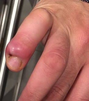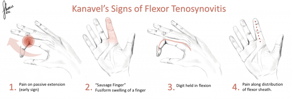 Hand infections are common presentations to the Emergency Department and often require admission for intravenous antibiotics and surgical intervention. Hand infections often present as a result of trauma, animal bites, human bites, or contaminated lacerations. Hand infections are more common in those with pre-existing co-morbidities, such as diabetes mellitus, or in current smokers. The most common organisms are S. aureus or Streptococci. Any hand infection can result in damage to local structures and subsequent loss of function, hence early identification is essential. This article will focus on common types of infections involving the hand including paronychia, infectious tenosynovitis, felon infections, and deep space infections. By TeachMeSeries Ltd (2020) Figure 1Palmar view of the thenar muscles of the hand Investigations Patient presenting with suspected hand infections should have routine blood tests to aid diagnosis, including include CRP, WCC, and urate levels. As penetrating trauma is often a contributing factor in most hand infections, plain film radiographs are routinely used to exclude foreign bodies and assess for underlying fractures or evidence of osteomyelitis. For infections producing any pus, wound swabs and / or pus culture can aid appropriate antibiotic selection. Management Areas of erythema should be marked to help determine any rate of spread. All hand infections will require antibiotic treatment started, however further management often depends on the type and degree of infection. Infectious tenosynovitis, flexor sheath infection, and deep space infections will often require a formal thorough washout in theatre, with subsequent re-looks in order to exclude re-accumulation of infection. Once complete, patients often require a period of close observation and strict hand elevation to reduce swelling. Paronychia Paronychia is the most common infection of the hand. Infection of the perionychium (the soft tissue fold around the nail plate) can occur secondary to contamination with oral flora from nail biting or sucking. Previous trauma or injury causing a disruption to the perionychium can be a significant risk factor. Pus can track along the perionychium in a horse-shoe shape, producing a characteristic abscess at the skin-nail plate junction*. The fingertip may be swollen, inflamed, and very tender (Fig. 2); pus can collect subungually, even cause necrosis of the nail bed and untreated paronychia can result in osteomyelitis of the distal phalanx. Treatment typically involves antibiotics, however incision and drainage of the pus will be required. Nail plate removal may be necessary to allow for sufficient drainage of pus. Following incision and drainage, a thorough washout with normal saline and antiseptic solution is necessary, with regular dressing changes. *Chronic paronychia is typically non-suppurative and clinically resembles acute paronychia Aputze, CC BY-SA 4.0 <https://creativecommons.org/licenses/by-sa/4.0>, via Wikimedia Commons Figure 2Paronychia of the 1st digit Infectious Tenosynovitis Tenosynovitis is inflammation of tendon sheath, the most common cause of which is infection. Tenosynovitis most often arises from direct inoculation of bacteria (commonly S. aureus) secondary to penetrating trauma* The most common type of tendosynovitis are flexor sheath infections. These should be deemed as a surgical emergency, as the raised pressure that occurs within the tendon sheath can impair blood flow and lead to eventual tendon necrosis and rupture. *Haematogenous spread or direct spread from a felon, septic joint or deep space infection can also lead to infectious tenosynovitis Henry Vandyke Carter, Public domain, via Wikimedia Commons Figure 3Illustration showing the anatomy of the flexor sheath of the hand Patients present with pain, swelling, and erythema of the affected digit. Kanavel’s signs (4 cardinal features, Fig. 4) are strong indicators of flexor sheath infection: Tenderness along the flexor sheath Flexed finger posture Pain on passive extension Fusiform swelling of the affected digit A thorough washout of the flexor sheath in theatre followed by strict elevation and close monitoring should be the mainstay of treatment. It is common practice to perform a re-look and further washout in theatre, especially if the clinical features do not resolve. By Francesca Leone, TeachMeSurgery [CC-BY-NC-ND 4.0] Figure 4The Kanavel cardinal signs of flexor sheath infection Felon Infections A felon infection is a subcutaneous infection of the fingertip pulp, most commonly occur in the thumb or index finger and are caused by S. aureus. Fibrous vertical septae run from the periosteum to the epidermis of the pulp, creating a closed system of microcompartments that are susceptible to rising pressure from inflammation. Felon infections present with swelling of the pulp distal to the distal phalangeal crease and severe pain (Fig. 5). The most common cause is through direct contamination, such as via splinters or garden thorns. Most cases are simple and will resolve spontaneously after a short period; antibiotics can aid resolution. James Heilman, MD, CC BY-SA 3.0 <https://creativecommons.org/licenses/by-sa/3.0>, via Wikimedia Commons Figure 5A felon infection in a thumb Deep Hand Space Infections The deep spaces of the hand consist of the thenar, mid-palmar, and hypothenar spaces. When infected, the respective spaced become swollen, tender, and erythematous, with hand movements limited. The thenar space overlies adductor pollicis and is bound ulnarly by the insertion of the adductor onto the metacarpal; when infected, pus may track dorsally around the adductor and in-between its two heads The mid-palmar space is a continuation of the carpal tunnel, deep to the palmar aponeurosis and superficial to the deep palmar interossei; it has multiple septa distally that separate the space and direct the flexor tendons to their digits The hypothenar space is located palmar to the f