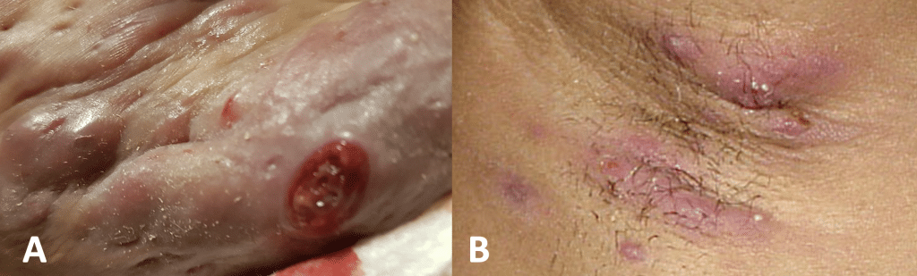A skin abscess is a collection of pus within the subcutaneous tissues, lined by a pyogenic membrane. Skin abscesses are a common clinical presentation, to both primary care and secondary care settings. A pyogenic skin abscess is different to an infected sebaceous cyst, as whilst both will present with similar clinical features and both contain infected contents, sebaceous cysts are lined with a stratified squamous epithelium Skin abscess can be classified based on their anatomical location (e.g. perianal abscess or a pilonidal abscess). Patients can also suffer from recurrent abscess formation, which can often be due to an underlying cause, such as perianal fistulae, hidradenitis suppurativa (discussed below), or inflammatory skin conditions. In this article, we shall look at the risk factors, clinical features, and management of a skin abscess. Pathophysiology The main organism involved in skin abscess formation is S. aureus, however multiple skin commensals can cause their formation. Skin abscess of form when there is a breach to the skin’s defensive barrier, leading to inoculation of pathogens in the subcutaneous tissue. The resultant acute inflammatory response results in non-specific host tissue damage (Fig. 1), resulting in necrotic tissue and non-viable immune cells forming, termed pus; this becomes surrounded by the pyogenic membrane. By the Open University [CC BY-NC-SA] Figure 1The stages of acute inflammation, including vessel vasodilation, exudate formation, and neutrophil migration Panton-Valentine Leucocidin Panton-Valentine Leucocidin (PVL) is a cytotoxin produced by Staphylococcus Aureus. PVL causes leukocyte and tissue destruction and is produced by <5% of S. aureus strains. PVL-positive infections are associated with recurrent skin infections and abscess formation, as well as life-threatening infections such as necrotising pneumonia or necrotising fasciitis and osteomyelitis, especially in young previously healthy patients. Risk Factors The main risk factors for developing a skin abscess include diabetes mellitus, patients on steroids or any immunosuppressive medication, sickle cell disease, intravenous drug users, or malnutrition. Clinical Features Patients with a skin abscess will present with a localised erythematous tender swelling, that may or may not be discharging purulent material (Fig. 1). There may be an associated history of trauma or localised skin condition, results in the initial pathogen inoculation. On examination, there will be a tender and fluctuant swelling, with surrounding cellulitis. In severe cases, there may be extensive cellulitis and features of sepsis. Adobe Stock, Licensed to TeachMeSeries Ltd Figure 2A skin abscess located over a patient’s elbow Investigations The majority of skin abscesses can be diagnosed clinically. In patients with clinical equipoise regarding the diagnosis or in severe cases, routine blood tests, including the full blood count and C-reactive protein, can be performed. Imaging is rarely required in the investigation of skin abscesses, however it may be warranted if a deeper abscess is suspected yet clinical examination cannot confirm. Depending on the location and subtype, ultrasound scans, CT scan, and MRI scan can all be used to diagnose an abscess formation. Management Patients with a skin abscess should be started on empirical antibiotics and adequate analgesia provided. In patients showing clinical features of sepsis, appropriate fluid resuscitation and broad-spectrum antibiotics should be started. As an abscess does not have a blood supply, antibiotic therapy alone will not resolve all abscesses. The definitive management for any sizeable skin abscess is with an incision and drainage (see video); the specifics of the operation is dependent on the size and location of the abscess. Incision and drainage allows for drainage of the pus to ensure appropriate source control, reducing the potential overall morbidity and the subsequent risk of recurrence. If left untreated, the infective process may progress into further cellulitis, necrotising fasciitis, or sepsis. Hidradenitis Suppurativa Hidradenitis Suppurativa (HS) is a condition of chronic and recurrent infections affecting the apocrine gland-bearing areas of the body. It is characterised by multiple superficial abscesses, with or without features of chronic sinus formation or ulceration. Patients present with the condition from adolescent years onwards, affecting 1-2% of the population (with a known genetic predisposition) and is more common in females. Adapted from HidradenitisAwareness, CC BY-SA 4.0 <https://creativecommons.org/licenses/by-sa/4.0>, via Wikimedia Commons, and Samuel Freire da Silva, CC BY-SA 4.0 <https://creativecommons.org/licenses/by-sa/4.0>, via Wikimedia Commons Figure 3Hidradenitis Suppurativa (A) Severe (B) Mild Clinical Features HS is a diagnosis that is made clinically (Fig. 3). Patients will present with recurrent abscess formation, often resulting in sinus formation due to the breakdown of the apocrine gland walls. There can be eventual surrounding fibrosis of the affected areas due to recurrent infections. Hurley classification The severity of HS can be classified using the Hurley classification: Type 1 (mild) – isolated lesions with no sinus tracking and minimal scarring Type 2 (moderate) – recurrent and multiple abscesses, with features of sinus formation and scarring Type 3 (severe) – diffuse disease affecting the majority of a region, with characteristic multiple coalesced abscesses and inflammatory plaques Management Management depends on the severity of the disease. Alongside pharmacological and surgical options, ensuring appropriate patient education, smoking cessation, and weight management services are offered where applicable. Initial management involves use of topical agents, such as Clindamycin solution and Chlorhexidine wash. Long-term oral antibiotics can further be trialled, such as oral tetracycline in milder dis