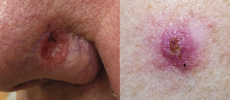 Basal cell carcinoma (BCC) is a slow-growing and locally-invasive skin cancer that arises from the pluripotent cells of the stratum basale layer of the epidermis. BCC is the most common form of skin cancer, however fortunately it is the least likely to metastasise (<0.5% risk). The overall incidence is increasing worldwide, with a lifetime risk of 23-39% in Caucasian patients. Nephron, CC BY-SA 3.0 <https://creativecommons.org/licenses/by-sa/3.0>, via Wikimedia Commons Figure 1High magnification of a basal cell carcinoma Risk Factors Most BCCs are associated with long-term UV exposure, especially repeated sunburn during childhood. UV exposure leads to genetic mutations in DNA (specifically on the p53 tumour suppressor 9q22). Other risk factors include PUVA therapy for psoriasis, Fitzpatrick type 1 skin, immunosuppression (e.g. transplant patients have a 10-fold increased risk), and genetic syndromes (such as Xeroderma Pigmentosa or Gorlin syndrome). Clinical Features The majority of BCCs will occur on sun-exposed areas of the head and neck, with the remainder mainly occurring on the trunk or lower limbs. They present typically as small slow-growing lesions, with raised pearly edges and evident telangiectasia (Fig. 2). They rarely cause symptoms initially, aside from aesthetic changes. However, if left to grow, they can cause symptoms such as pain, bleeding, and ulceration, or subsequent local invasion into surrounding tissues. Adapted from James Heilman, MD, CC BY-SA 3.0 <https://creativecommons.org/licenses/by-sa/3.0>, via Wikimedia Commons, and from Adobe Stock library (licensed) Figure 2Examples of Basal Cell Carcinoma Subtypes There is a range of different presentations of BCC, depending on the subtype: Nodular – most common (50-60%), commonly a pink pearly nodule with telangiectasia, and can become ulcerated or encrusted; subtypes include cystic, pigmented, or keratotic Superficial – (10-15%) erythematous scaly plaques with a thread-like border, and may bleed or ulcerate Morphoeic – more uncommon, presenting as thickened and sclerosing plaques with poorly defined borders; highest risk of incomplete excision and often prone to recurrence after treatment Basosquamous – a mixed basal cell and squamous cell malignancy, with an infiltrative growth pattern and often are more aggressive Differential Diagnosis The main differential diagnoses to consider for a patient presenting with a lesion suspicious for a BCC include Trichoepithelioma (a rare benign tumour of the hair follicle), Keratoacanthoma (rapidly-growing tumour of the skin derived from the glands surrounding a hair follicle), or a cutaneous Squamous Cell Carcinoma. Investigations Although BCC is usually diagnosed clinically, it can only be confirmed through excision biopsy (discussed below)*. Dermatoscope examination can aide the clinician with diagnosis, as under the dermtoscope features of the lesion can be seen that make the diagnosis of BCC more probable (such as arborising vessels, spoke wheel like structures, areas of ulceration). No further investigation is usually required unless there are features of invasion into underlying structures or metastasis, where additional radiological imaging would be appropriate. *In clinically indistinct larger lesions, those close to crucial anatomical structures, or atypical looking lesions, an incisional tissue biopsy can be performed primarily to obtain histopathological diagnosis prior to further treatment Management Factors such as tumour subtype, size, anatomical location, and histological diagnosis will impact how a BCC is managed: Low-risk BCCs are small, well-circumscribed lesions superficial type lesions that do not meet any of the high-risk criteria High-risk BCCs include those occurring in the young (<25yrs) or immunocompromised patients, recurrent lesions, lesions on the nose, lips, ears, or around the eyes, lesions with poorly defined margins, and all non-nodular subtypes of BCC Multiple management options are available BCCs. Superficial disease can often be treated with non-surgical options alone, which include: Cryotherapy (or CO2 ablation) Curettage and electrodissection – 75% cure rate (95% for smaller lesions <2cm) Immune response modulator – Topical imiquimod 5% cream (for superficial BCCs) Topical chemotherapy – 5-fluorouracil 5% cream (for superficial BCCs) Photodynamic therapy – Uses light therapy together with a topical photosensitising agent (for superficial BCCs) Radiotherapy – usually reserved for the older age group, achieves ~90% cure rates Surgical Management The mainstay of surgical management is with excision biopsy. The margins required are between 3-5mm, depending on how demarcated the border is and the location of the lesion. Higher excision margins are required for recurrent BCCs (5mm) or high-risk histological subtypes. If there is sufficient skin laxity in the region, the defect can be closed directly. However, some may require local, regional or free flap or skin grafts. Lesions which are close to vital anatomical structures, have indistinct margins, or are recurrent should be considered for Mohs’ micrographic surgery. Mohs’ Micrographic Surgery Mohs’ micrographic surgery is a tissue preserving technique which removes the lesion whilst assessing the entire excision margins. The tumour is initially debulked, and then saucer-shaped 1mm layers of tissue are excised at a time. Each layer is then immediately checked under a microscope by a trained technician, and the process is continued until the tumour has been fully removed. Mohs’ micrographic surgery is particularly useful in (1) recurring or incompletely removed BCC, (2) areas where it would be cosmetically better to remove as little skin as possible (3) at sites of previous surgery or radiotherapy. Overall cure rates are high for both primary (99%) and recurrent (95%) tumours using Mohs’ micrographic surgery. Prevention Prevention advice is vital in managing skin cancer pat