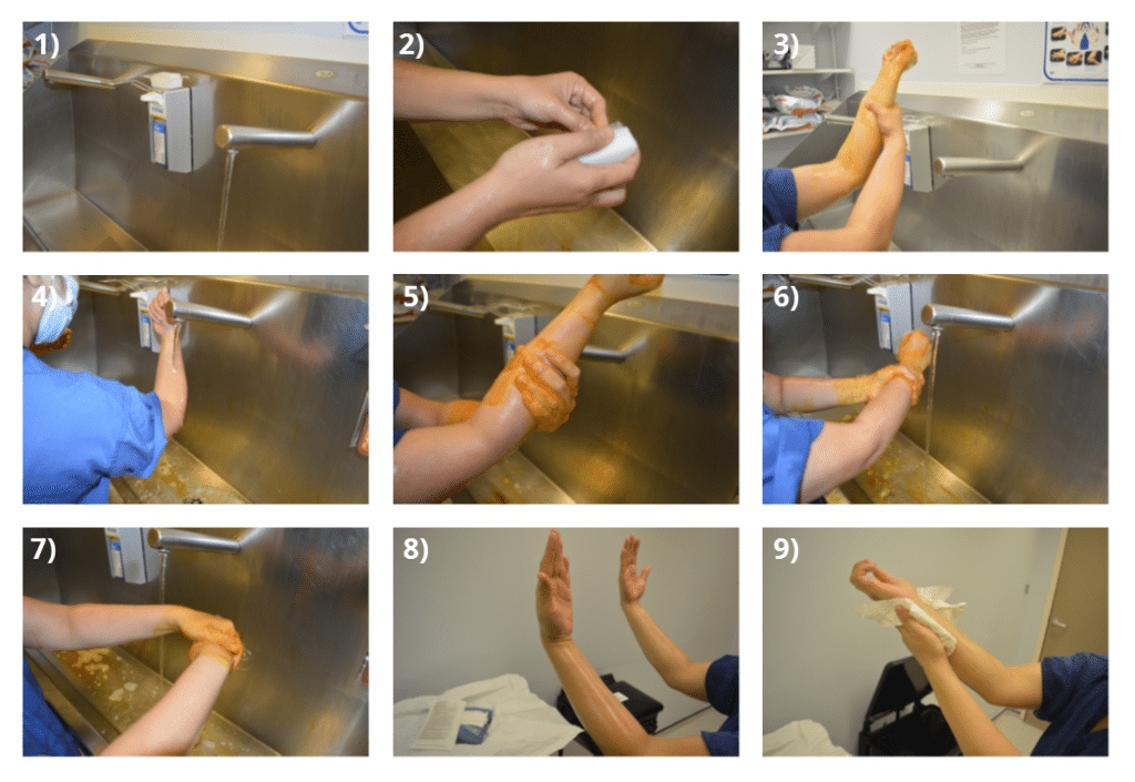 The process of scrubbing, gowning, and gloving is one that all members of the surgical team must complete before each operation. In the surgical scrub, the hands and forearms are decontaminated. A sterile surgical gown and pair of gloves are subsequently donned, creating an aseptic environment. ‘Scrubbing in’ dramatically reduces the risk of infection and significantly improves patient outcomes. As such, it is a skill that should be taken seriously and always performed to the highest standard. In this article, we shall look at the procedure for surgical scrubbing, gowning, and gloving. Procedure Preparation Remove any watches and rings from your hands Ensure that your sleeves are at least two to thee inches above your elbows Open out your gown pack onto a clean table, only grabbing the outermost edges to maximise the sterile field (Figure 1.1, 1.2) Open your glove packet and let it drop onto the clean area (Figure 1.3,1.4) Collect a nail pick and brush Put on a face mask, securing appropriately By TeachMeSurgery (2020)Figure 1The preparation stage of scrubbing and gowning. Scrubbing Allow the water to run (Figure 2.1) and cover the nail pick and brush with soap, using your elbows on the soap dispenser; clean your nails and remove any gross debris from your hands (Figure 2.2) Start by scrubbing your hands and forearms, down to your elbows, using the WHO hand washing procedure for the hands and a rotational action for your forearms (Figure 2.3); this should last for at least one minute Wash the soap from your hands and forearms by holding up your arms with your hands elevated under the tap, such that the water runs off into the sink from your elbows (Figure 2.4) Repeat this procedure a further three times, initially down to the mid-forearm (Figure 2.5), then down to the wrists (Figure 2.6), then just for the hands (Figure 2.7), each time lasting for at least one minute Keeping your arms elevated (Figure 2.8), dry your hands and forearms with the sterile towels in the gowning pack, using a dabbing motion instead of a wiping motion (Figure 2.9); use one towel for each hand, before throwing them away By TeachMeSurgery (2020)Figure 2Scrubbing in, the aim is to decontaminate the hands and forearms Gowning and Gloving Take the sterile gown (Figure 3.1) and gently shake it out, taking care not to let anything else touch it (Figure 3.2) Open it up and place your hands into the sleeves (Figure 3.3,3.4); keep your hands inside the sleeves (Figure 3.5) Ask an assistant to help pull it up over your shoulders and fasten it up at the back Take the right hand glove and place it, palm down, fingers facing your body (Figure 3.6) Grasp the bottom of the cuff with the thumb and index finger of your right hand, still inside the sleeve (Figure 3.7); grasp the top of the cuff with your left hand (also inside the sleeve) and pull the glove around and over your right hand (Figure 3.8) Pull gently on the sleeve of the gown to help move your hands into the gloves and straighten out the fingers (Figure 3.9); the sleeves of the gown should remain over most of your palm Repeat this technique for the left hand To Complete It is advised to rest your hands on your front as you move around to ensure you remain sterile Make sure you do not touch any non-sterile equipment as you move to the operating area By TeachMeSurgery (2020)Figure 3Gowning and gloving Key Points All members of the surgical team must scrub, gown, and glove appropriately before each operation. The hands and forearms are decontaminated, before a sterile surgical gown and pair of gloves are donned ‘Scrubbing in’ dramatically reduces the risk of infection and significantly improves patient outcomes Rate This Article