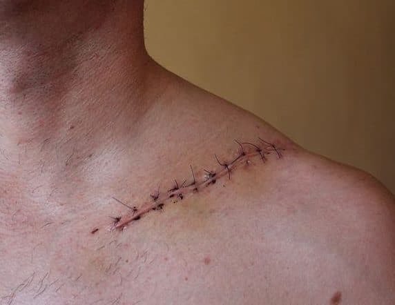 The basic principles for the management of a wound or laceration are: Haemostasis Cleaning the wound Analgesia Skin closure Dressing and follow-up advice These principles can be applied to any simple wound, yet always involve your senior colleagues for advice and input as necessary. Always remember your own personal protection when assessing a wound, including gloves, apron or gown, and goggles/visors Haemostasis Haemostasis is the process that causes bleeding to stop. In most wounds, haemostasis will be spontaneous. In cases of significant injury or laceration of vessels, steps may need to be taken to reduce bleeding and aid haemostasis. These include pressure, elevation, tourniquet, or suturing. Cleaning the Wound Wound cleaning is important for reducing infection and promoting healing. There are five aspects of wound cleaning: Disinfect the skin around the wound with antiseptic Avoid getting alcohol or detergents inside the wound Decontaminate the wound by manually removing any foreign bodies Debride any devitalised tissue where possible Irrigate the wound with saline If there is no obvious contamination present, low pressure irrigation is sufficient* (pouring normal saline from a sterile container carefully into the wound) Antibiotics for high-risk wounds or signs of infection (follow local antibiotic guidelines) Risk factors for wound infection include foreign body present or heavily soiled wounds, bites (including human), puncture wounds, and open fractures *If the wound is clearly contaminated, it must be irrigated at high pressure to remove any visible debris present Analgesia Analgesia will allow for a humane and easier closure of the wound. Infiltration with a local anaesthetic is the most common form of analgesia used, with regular systemic analgesia (such as paracetamol) used as an adjunct. The maximum level of lidocaine is 3mg/kg and the addition of adrenaline allows for up to 7mg/kg (a 1% solution equates to 10mg/ml). Remember to not use adrenaline with local anaesthetic if administering in or near appendages (e.g. a finger) Skin Closure The aid wound healing, the edges of the wound can be manually opposed. There are four main methods of doing so: Skin adhesive strips (e.g. Steri-StripsTM) are suitable if no risk factors for infection are present Tissue adhesive glue (e.g. Indermil®) can be used for small lacerations with easily opposable edges (a popular choice in paediatrics) Sutures are typically used for any laceration greater than 5cm, deep dermal wounds, or in locations that are prone to flexion, tension, or wetting Staples can be used for some scalp wounds siegertmarc [CC BY 2.0 (https://creativecommons.org/licenses/by/2.0)] Figure 1Suture wound closure, following clavicular surgery Dressing the Wound and Follow-Up Correct dressing of the wound will reduce infection and contamination. When applying a wound dressing to a non-infected laceration, the first layer should be non-adherent (such as a saline-soaked gauze), followed by an absorbent material to attract any wound exudate, and finally soft gauze tape to secure the dressing in place. Tetanus prophylaxis is required for any individual not up to date with (or unsure of) their tetanus immunisation status. Following initial wound management, advise patients to: Seek medical attention for any signs of infection Take simple analgesia (e.g. paracetamol) Keep the wound dry as much as possible, even if wearing a waterproof dressing Any sutures or adhesive strips should be removed 10-14 days after initial would closure (or 3-5 days if on the head); tissue adhesive glue will naturally slough off after 1-2 weeks. Remove dressings at the same time as the sutures or adhesive strips. Key Points Clean the wound thoroughly, starting antibiotics and referring for debridement as necessary Ensure adequate analgesia is provided Choice of skin closure technique depends on the wound Ensure the wound is appropriately dressed Do you think you’re ready? Take the quiz below Pro Feature - Quiz Basic Wound Management Question 1 of 1 Submitting... Skip Next Rate question: You scored 0% Skipped: 0/1 Keep your streak going Unlock the full question bank You’ve made a great start. Continue with over 1,200 MRCS-style MCQs, two full mock papers, and ad-free revision with TeachMeSurgery Pro. Continue with Pro Rate This Article