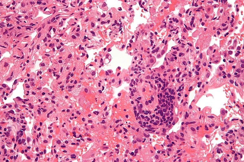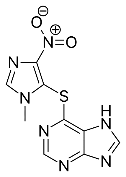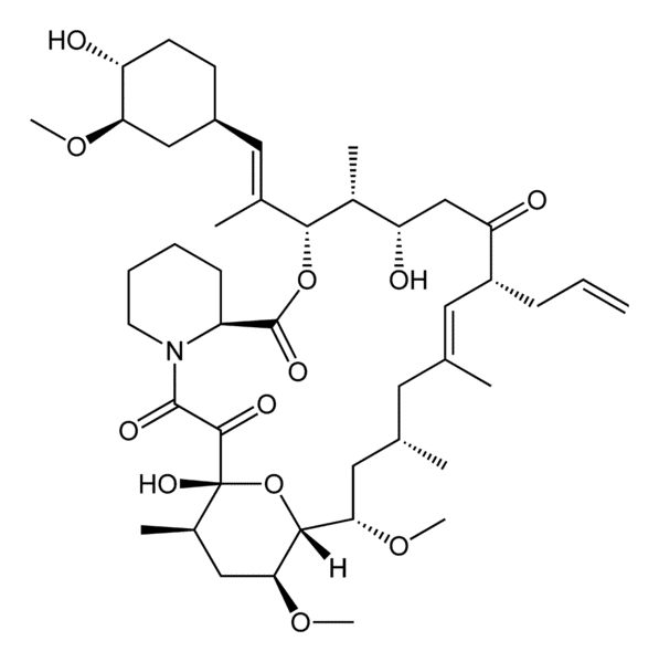 The immunology of transplantation surrounds the host’s recognition and response to foreign tissue. Following transplantation, major histocompatibility complex (MHC) antigens (termed human leukocyte antigens, or HLAs, in humans) from the donor tissue are presented to recipient T cells, leading to recipient T-cell activation. The activation of the recipient immune system can lead to damage of the transplanted organ, through both antibody-mediated (via B-cells, activated by CD4+ T-cells, produce donor specific antibodies) or cellular-mediated (via cytotoxic T cells, natural killer cells, macrophages and neutrophils) mechanisms. Consequently, post-transplant immunosuppression aims to modify these responses to reduce the damage occurring to the transplanted organ by the recipient’s immune system. Tissue Typing Prior to transplantation, HLA tissue typing is performed in potential recipients prior to listing to reduce risk of rejection. Patients are typed for class-I (HLA-A, B, and C) and class-II (HLA-DR, DQ and DP) HLA antigens. Since each person has two chromosomes, and the paternal and maternal chromosome produce different HLA molecules, an individual has the potential to express up to six class-I and six class-II molecules. HLA matching prior to organ allocation has the role to identify the best match between the donor organ and recipient, as this will ensure an optimal outcome and minimise the risk of rejection. Organ Rejection Broadly, the recipient response to the donor organ can be classified as hyperacute rejection, acute rejection, or chronic rejection. Presentation varies between the transplanted organ involved, yet diagnosis will require a tissue biopsy for definitive confirmation. Hyperacute rejection occurs due to preformed cytotoxic antibodies directed against donor HLA or ABO antigens. There is often graft destruction within 24 hours, especially if left untreated. Hyperacute rejection can be avoided by pre-operative blood group and HLA matching. Acute rejection is the most common type of rejection, occurring in up to 50% of grafts, and present within the first 6 months. It is most commonly caused by a T-cell mediated immune response* against the graft MHCs, with increased risk with previous HLA sensitising episodes (such as previous transplants or blood transfusions). Patients can be treated with high-dose steroids, with second line treatment options including plasma exchange or intravenous immunoglobulin. Chronic rejection occurs after 6 months and will present as a progressive decline in organ function. Its aetiology is multifactorial, mechanisms including immune-mediated injury, ischaemia-reperfusion injury and immunosuppressive agents’ toxicity. Unfortunately, immunosuppressive therapies have limited effectiveness in reversing chronic rejection. *A humoral acute rejection can also occur, although is much less common Nephron [CC BY-SA 3.0 (https://creativecommons.org/licenses/by-sa/3.0)] Figure 1Histology of acute lung transplant rejection, showing features of perivascular lymphocytic infiltration Modern Immunosuppression The primary goal of immunosuppression is to prevent graft rejection and minimise adverse reactions. Currently, immunosuppression regimens used are associated with rejection rates between 35%-40%, but graft loss due to rejection is uncommon (<5%). Immunosuppressive drugs can be classified as induction therapies, maintenance therapies, and antirejection therapies. Current immunosuppression agents are given as combination therapies, with constituents depending on both patient and operative factors: Calcineurin inhibitors, such as cyclosporine or tacrolimus Anti-proliferative agents, such as mycophenolate mofetil or azathioprine mTOR Inhibitors, such as sirolimus and everolimus Corticosteroids, such as prednisolone or methylprednisolone Monoclonal antibodies, such as Basiliximab or Alemtuzumab Induction Agents Basiliximab is a monoclonal antibody that blocks IL-2 receptors, thereby inhibiting IL-2–induced T-cell activation. It is most often used as an induction agent in kidney transplantation, or as part of steroid-free protocols in pancreas transplantation. The use of Basiliximab as an induction agent allows for early steroid withdrawal and a substantial reduction in other immunosuppressive agents early after transplantation. Side effects include oedema, hypertension, and tremor. Alemtuzumab is a monoclonal antibody directed against CD52; CD52 is widely expressed on the surface of immune cells (all B and T cells and most macrophages and natural killer cells), allowing Alemtuzumab to act as a lymphocyte-depleting agent. Its use is generally for patients with high immunological risk. Whilst effective in reducing the risk of rejection, it is also associated with a high risk of post-operative opportunistic infections and post-transplant lymphoproliferative disease. Early Maintenance Agents Benjah-bmm27 [Public domain] Figure 2Tacrolimus molecular structure Calcineurin Inhibitors Calcineurin inhibitors (CNIs), such as cyclosporine and tacrolimus, are strong inhibitors of the T-cell response, acting by blocking IL-2 production. They are the mainstay of most initial post-operative immunosuppression, with tacrolimus the first-line immunosuppressant in most transplant centres They are nephrotoxic, through vasoconstrictive action, therefore their levels should be regularly monitored, and can their therapeutic windows are narrow. Other less common side effects of CNIs include hypertension, neurotoxicity (more common with tacrolimus which causes tremor, headache, irritability), diabetes mellitus, and hyperlipidaemia. Hirsutism and gingival hyperplasia are additional adverse events specific to cyclosporine. Anti-Proliferatives The most common anti-proliferative agents currently used are mycophenolate mofetil (MMF) and azathioprine. Neither agent requires regular therapeutic drug monitoring. Ayacop [Public domain] Figure 3Azathioprine molecular structure Azathioprin