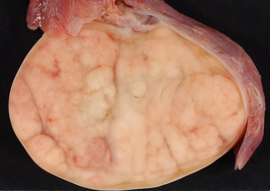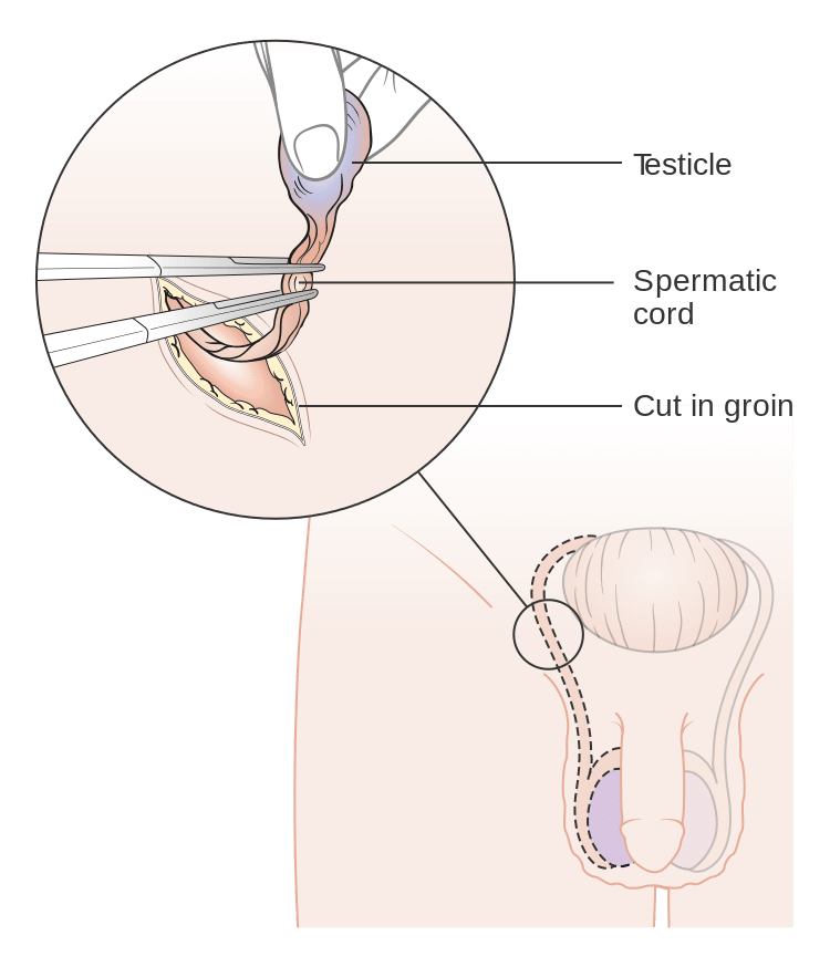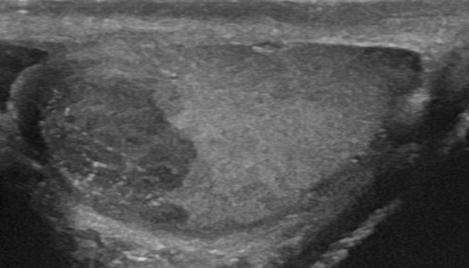 Testicular cancer is most common cancer in males aged 20-40yrs, with those of Caucasian and Northern European descent at highest risk. Primary testicular tumours are categorised into germ cell tumours (GCT) (95%) and non-germ cell tumours (NGCTs) (5%); GCTs can be further sub-classified into seminomas and non-seminomatous GCTs (NSGCT), and are usually malignant. NGCTs are usually benign, comprising of either Leydig cell tumours or Sertoli cell tumours*. Seminomas tend to remain localised until late and have very good prognosis. NSGCTs include yolk sac tumours, choriocarcinoma, embryonal carcinoma, and teratoma; NSGCTs often metastasise early and have worse prognosis than seminomas. *Leydig cell tumours and Sertoli cell tumours are benign and secrete androgens and oestrogens respectively By TeachMeSeries Ltd (2020) Figure 1The testis and epididymus Risk Factors Cryptorchidism (undescended testes) is associated with a 4-10x higher risk of GCTs. Other risk factors include previous testicular malignancy, a positive family history, Caucasian ethnicity, and Kleinfelter’s syndrome. Clinical Features Patients will present with a unilateral painless testicular lump. On examination*, the mass is typically irregular, firm, fixed, and does not transilluminate. Evidence of metastasis may present with weight loss, back pain (from retroperitoneal metastases), or dyspnoea (secondary to lung metastases). *Lymphatic drainage of the testes is to the para-aortic nodes, therefore localised lymphadenopathy may not be present, even in cases of metastatic disease Ed Uthman from Houston, TX, USA, CC BY 2.0 <https://creativecommons.org/licenses/by/2.0>, via Wikimedia Commons Figure 2A testicular seminoma Differential Diagnosis Differential diagnoses for a scrotal lump include epididymal cyst, haematoma, epididymitis, or hydrocoele. Investigations For patients with suspected cases of testicular cancer, tumour markers can be used for both diagnostic and prognostic* means. ßHCG is elevated in 60% of NSGCTs (100% in choriocarcinomas) and 5-10% of pure seminomas, whilst AFP can be raised in some NSGCTs but not in pure seminomas. LDH can also be used as a surrogate marker for tumour volume and necrosis, as well as for tumour response to oncological treatment. Scrotal ultrasound (Fig. 3) should be used in the initial assessment of scrotal lumps, alongside concurrent tumour markers. The disease will then be staged via CT imaging with contrast of the chest-abdomen-pelvis. Crucially, a trans-scrotal percutaneous biopsy should not be performed, as it might cause seeding of the cancer. Diagnosis is made through tumour markers and imaging alone. *Levels can be used post-treatment to determine its efficacy By Mme Mim [CC BY-SA 4.0 (https://creativecommons.org/licenses/by-sa/4.0)], from Wikimedia Commons Figure 3US testes demonstrating a seminoma of the testis Staging of Testicular Cancer The Royal Marsden Classification can be used in the staging of the testicular cancer Stage Characteristics I Disease confined to testes II Infra-diaphragmatic lymph node involvement III Supra- and infra-diaphragmatic lymph node involvement IV Extralymphatic metastatic spread Management All patients with confirmed testicular cancer he should be discussed in a specialist MDT. The main treatment options for testicular cancer are surgery, radiotherapy, and chemotherapy; the treatment of choice depends on the tumour type, risk scoring, and prognosis. Most cases suitable for surgery will undergo an inguinal radical orchidectomy*. An inguinal approach (Fig. 4) allows for limited lymphatic disruption, important in cases of malignancy; the tumour-bearing testicle being removed with epididymis, spermatic fascia and cord. Sperm abnormalities and Leydig cell dysfunction are frequently found in patients with testicular cancer prior to orchiectomy. Furthermore, chemotherapy and radiation treatment can additionally impair fertility. Therefore, in patients in the reproductive age group, pre-treatment fertility assessment should be performed, and semen analysis and cryopreservation offered to all patients. *A biopsy of the contralateral testicle is performed in patients <40years old and the volume of contralateral testis <12ml, or there is a history of cryptorchidism or subfertility Cancer Research UK, CC BY-SA 4.0 <https://creativecommons.org/licenses/by-sa/4.0>, via Wikimedia Commons Figure 4Illustration demonstrating an inguinal approach for orchidectomy Non-Seminomatous Germ Cell Tumours Stage 1 NSGCTs will require orchidectomy, then further managed dependent on their risk score. Low risk patients without any evidence of vascular invasion can routinely enter just surveillance, whilst high risk patients (including embryonal cancer >50% or proliferation rate >70%) or those with vascular invasion require adjuvant chemotherapy, and then surveillance, including regular examination, surveillance CT imaging and plain film chest radiographs (CXRs), and tumour markers. Metastatic NSGCTs management is also dependent on risk scoring. Cases with intermediate prognosis should be treated with chemotherapy, whilst those with poor prognosis should be treated with one cycle of chemotherapy before reassessment (those with marker decline should have continued chemotherapy cycles, whilst those with unfavourable decline should have their chemotherapy intensified). Seminomas Stage 1 seminoma can often be managed with orchidectomy alone and surveillance monitoring. Patients with a high relapse risk are often considered for adjuvant chemotherapy. Histological factors which indicate higher risk for relapse are invasion of rete testis and tumour size >4cm. Surveillance for stage 1 seminoma includes twice yearly including regular examination, surveillance CT imaging, and tumour markers. Beyond 5 years, surveillance can be transferred to the GP, with regular examination and tumour markers alomne. For metastatic seminoma, stage IIA can be treated with either radiotherapy or chemoth