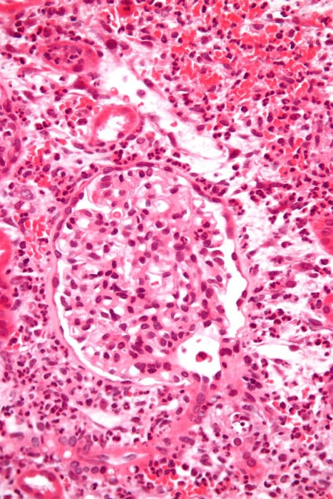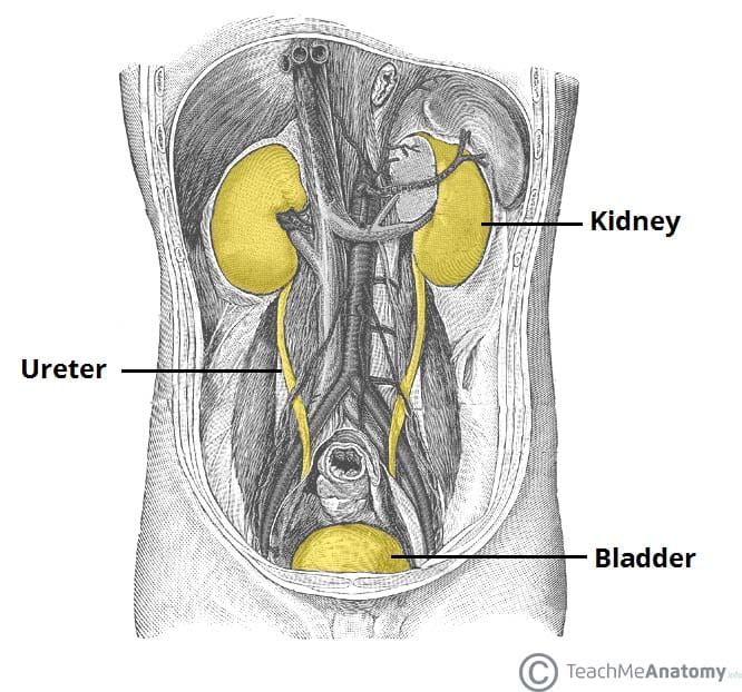 By TeachMeSeries Ltd (2020) Figure 1The urinary tract Pyelonephritis is defined by inflammation of the kidney parenchyma and the renal pelvis, typically due to bacterial infection. Acute pyelonephritis can affect patients of all ages, however the highest incidence occurs in women aged 15-29. Pyelonephritis can be described as uncomplicated, when present in a structurally or functionally normal urinary tract in a non-immunocompromised host, or complicated*, when the opposite is true. *Urinary tract infections in males are complicated by definition, as they will be associated with abnormal urinary tracts. Pathophysiology Acute pyelonephritis results from bacterial infection of the renal pelvis and parenchyma. Bacteria can reach the kidney either by ascending from the lower urinary tract, directly from the blood stream, as in cases of septicaemia or infective endocarditis or, rarely, via lymphatics (as seen in cases of retroperitoneal abscess). Neutrophils infiltrate the tubules and interstitium and cause suppurative inflammation. There are often small renal cortical abscesses and streaks of pus in the renal medulla. The most common organism* (~80%) isolated is Escherichia coli. Other organisms include, Klebsiella, Proteus, Enterococcus faecalis (catheters), Staphylococcus aureus (catheters), Staphylococcus saprophyticus (commensal), and Pseudomonas (catheters). *Rarely, Mycobacterium spp, yeasts, or other fungi can be the cause in immunocompromised patients Risk Factors By Nephron [CC BY-SA 3.0 (https://creativecommons.org/licenses/by-sa/3.0) from Wikimedia Commons Figure 2Histology of acute pyelonephritis, using H&E stain Factors reducing antegrade flow of urine Obstructed urinary tract, including BPH Spinal cord injury, resulting in a neuropathic bladder Factors promoting retrograde ascent of bacteria Female gender (due to a short urethra) Indwelling catheter or ureteric stents / nephrostomy tubes in-situ Structural renal abnormalities, such as vesico-ureteric reflux (VUR) Factors predisposing to infection or immunocompromise Diabetes mellitus, corticosteroid use, HIV infection (untreated) Factors promoting bacterial colonisation Renal calculi Sexual intercourse Oestrogen depletion (menopause) Clinical Features The classical triad for pyelonephritis is of fever, unilateral loin pain (or rarely bilateral), and nausea & vomiting, typically developing over the course of 24-48 hours. Patients may also have symptoms of co-existing lower urinary tract infection (frequency, urgency, dysuria), as well as visible (or non-visible) haematuria. On examination, patients will often look unwell, often pyrexial and features of sepsis. They will have unilateral or bilateral costovertebral angle tenderness*, with or without suprapubic tenderness. Assess the patient’s fluid status and measure any post-void residual volumes. *Ensure to assess for evidence of an AAA, an important differential of back pain. Differential Diagnosis Any patient present with back pain and tachycardia and / or hypotension, especially if elderly or with sufficient risk factors, should be assessed for a potential ruptured AAA. Other differentials include renal calculi, acute cholecystitis, ectopic pregnancy or pelvic inflammatory disease, lower lobe pneumonia, or diverticulitis Investigations All patients will require urinalysis, assessing for nitrites and leucocytes, as well as a urinary beta-hCG for all women of child-bearing age. In all suspected cases, ensure to send off a urine culture (starting empirical treatment once sent). Routine bloods should be taken, including FBC and CRP for evidence of inflammation and U&Es, to assess renal function. All cases of pyelonephritis should have a renal US scan performed for evidence of obstruction (as an infected obstructed system is a urological emergency). If obstruction is suspected, non-contrast CT imaging of the renal tract should be performed (CT KUB). Management Patients who are systemically unwell will require management in an A to E approach and appropriate resuscitation. Start empirical antibiotics based on local protocols and IV fluids as appropriate, also prescribing suitable analgesia and anti-emetics. Tailor antibiotic therapy once sensitivities are available. Whilst many uncomplicated cases can often be treated in the community, consider admission in those cases who are clinically unstable, significant dehydration, or with co-morbidities such as diabetes mellitus, renal transplant graft, immunocompromised. Severe or non-responding cases may warrant catheterisation and high-dependency unit monitoring, as such cases can becoming profoundly and rapidly unwell. Consider early CT imaging* in such cases to check for obstruction and complications of pyelonephritis, such as of pyonephrosis (infected obstructed kidney) or a perinephric abscess. *Males without a clear underlying cause or risk factor for infection, many would advise that the patient be consider for further imaging (either US or CT KUB) and flexible cystoscopy, to rule out any identifiable underlying causes. Complications Complications of pyelonephritis include severe sepsis and multi-organ failure, renal scarring leading to chronic kidney disease, pyonephrosis, and even preterm labour in pregnant women Chronic Pyelonephritis By Kristoffer Lindskov Hansen, Michael Bachmann Nielsen and Caroline Ewertsen [CC BY 4.0 (https://creativecommons.org/licenses/by/4.0)], via Wikimedia Commons Figure 3Chronic pyelonephritis with reduced kidney size and focal cortical thinning Repeated infections can lead to chronic pyelonephritis, with such repetitive inflammatory events leading to fibrosis (scarring) and ultimately destruction of the kidney. These cases are more common in obstructed systems resulting in urinary reflux, such as strictures caused by UTIs, VUR, other anatomical abnormalities. The diagnosis if often made radiologically when evidence of a small, scarred shrunken kidney is seen (Fig. 3). Chronic pyelonephritis is more