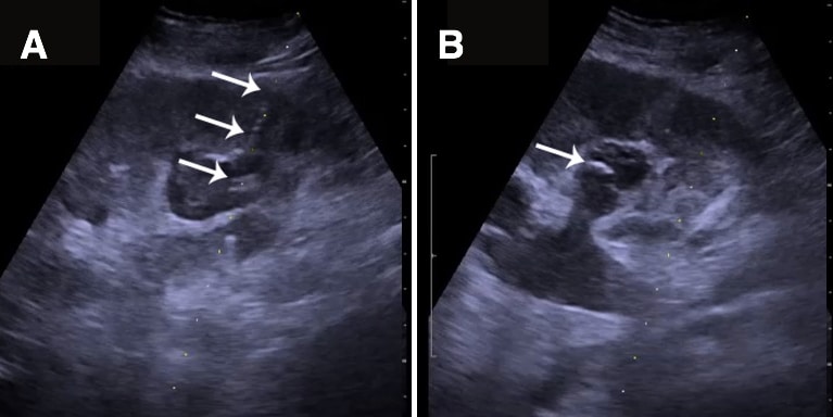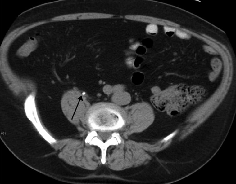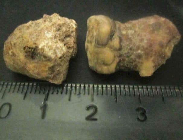 Renal tract stones (also termed urolithiasis) are a common condition, affecting around 2-3% of the Western population. They are more common in males and typically affect those <65yrs. They commonly form as renal stones (within the kidney) but can migrate to become ureteric stones (within the ureter). Around 80% of urinary tract stones are made of calcium, as either calcium oxalate (35%), calcium phosphate (10%), or mixed oxalate and phosphate (35%). The remaining stone compositions include struvite stones* (magnesium ammonium phosphate), urate stones (the only radiolucent stones), and cystine stones (typically associated with familial disorders affecting cystine metabolism). *Struvite stones are often large soft stones, the most common cause of “staghorn calculi” (Fig. 1), whereby the stone will fill the renal pelvis By Nevit Dilmen [CC BY-SA 3.0 (https://creativecommons.org/licenses/by-sa/3.0) or GFDL (http://www.gnu.org/copyleft/fdl.html)] Figure 1A large staghorn calculi, as seen on plain film abdominal radiograph Pathophysiology The basis for formation of urinary tract stones is over-saturation of urine. Calcium and oxalate precipitate at lower saturation levels and are therefore the most common stone composition. However, certain stone types that form may also be caused by a specific underlying pathology. For struvite stones, also called infection stones, form in alkaline urine in the presence of urease-producing organisms, such as Proteus and Klebisella species. Urease catalyses urea into carbon dioxide and ammonia, which leads to the precipitation of magnesium ammonium phosphate crystals. For urate stones, high levels of purine in the blood, either from diet (e.g. red meats) or through haematological disorders (such as myeloproliferative disease), results in increase of urate formation and subsequent crystallisation in the urine. For cystine stones, these are typically associated with homocystinuria, an inherited defect that affects the absorption and transport of cystine in the bowel and kidneys; as citrate is a stone inhibitor, hypocitraturia from the condition can thus predispose affected individuals to recurrent stone formation. Location of Ureteric Stones For stones that enter the drainage system of the urinary tract, there are three natural narrowed points where stones are likely to impact: Pelviureteric Junction (PUJ), where the renal pelvis becomes the ureter Crossing the pelvic brim, where the iliac vessels travel across the ureter in the pelvis Vesicoureteric Junction (VUJ), where the ureter enters the bladder Clinical Features The most common presenting symptom of ureteric stone is pain*, termed ureteric/renal colic, which occurs from the increased peristalsis from around the site of obstruction. The pain has a sudden onset, severe, and radiates from flank to pelvis (termed “loin to groin”), often associated with nausea and vomiting. Distal ureteric stones may cause urinary frequency or need to micturate (despite an empty bladder). Haematuria occurs in around 90% cases, however this is typically non-visible. In certain cases, renal calculi can become infected, therefore associated symptoms, such as rigors, fevers, or lethargy. may be present; in severe cases, patient’s may shown clinical features of sepsis. Examination is typically unremarkable, occasionally demonstrating some tenderness in the affected flank. There may be signs of dehydration, from reduced fluid intake secondary to associated vomiting. *It is possible to have no pain with a stone, especially if the stone is non-obstructing Jakupica [CC BY-SA 4.0 (https://creativecommons.org/licenses/by-sa/4.0)], from Wikimedia Commons Figure 2Macroscopic appearance of two renal calculi Differential Diagnosis Differentials for flank pain include pyelonephritis, ruptured AAA, biliary pathology, bowel obstruction, lower lobe pneumonia, or musculoskeletal related pain. Investigations A urine dip can show microscopic haematuria, as well as evidence of infection (always ensure to send a urine culture as well in such cases). Routine bloods should be performed, include FBC & CRP (for evidence of infection) and U&Es (to assess renal function). Urate and calcium levels can also aid in the assessment of stone analysis; if the patient notices they have passed the stone during micturition, retrieval of the stone and sending for analysis can also be of use. Imaging The gold standard for diagnosis of renal stones is a non-contrast CT scan of the renal tract (KUB). The benefit of the CT KUB (Fig. 3) as an imaging modality is the high sensitivity and specificity in identifying stone disease, as well as concurrent assessment of any alternative pathology. Ultrasound scans of the renal tract can often be used concurrently in cases of known stone disease, to assess for any hydronephrosis (they can also often detect renal stones, however not ureteric stones). Its benefits are in no radiation risk, however are often operator dependent. Plain film abdominal radiographs (AXR) are rarely used for the initial assessment of stone disease, as not all stones are radio-opaque which limits their use, alongside their associated radiation exposure. However, if a patient is known to have radio-opaque urinary tract calculi an AXR may be used as part of stone surveillance. James Heilman, MD [CC BY-SA 3.0 (https://creativecommons.org/licenses/by-sa/3.0)], from Wikimedia Commons Figure 3A 3mm ureteric stone on non-contrast CT axial scan Management Initial Management Patients with renal stones will often be dehydrated, secondary to reduced oral fluid intake +/- vomiting, so ensure adequate fluid resuscitation if required. For the majority of cases, renal stones will pass spontaneously without further intervention*, especially if in the distal ureter or <5mm in diameter. Ensuring patients have sufficient analgesia is paramount (NSAIDs per rectum are the most effective). Any evidence of significant infection or sepsis present warrants intravenous ant