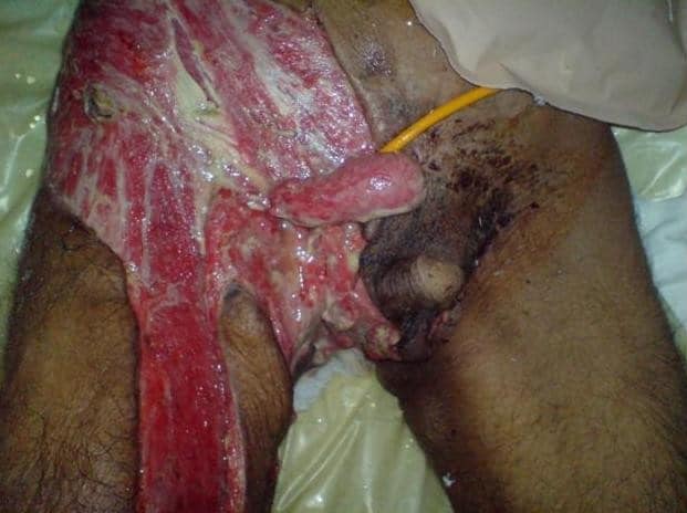 Fournier’s gangrene is a form of necrotising fasciitis that affects the perineum. Whilst rare, it is a urological emergency with a mortality rate of 20-40%*. Necrotising fasciitis is a group of rapidly spreading necrosis of subcutaneous tissue and fascia, the term also encompassing Fournier’s gangrene. Much of the principles for its management therefore hold true for Fournier’s. Fournier’s gangrene can be a monomicrobial or a polymicrobial infection, with causative organisms including Group A streptococcus, C. Perfringes,and E. Coli. Anatomic barriers to the spread of infection include the dartos fascia of the penis and scrotum, Colles fascia of the perineum, and Scarpa fascia of the anterior abdominal wall. As a result, the testes and epididymis are commonly not affected by the fasciitis. *The condition was first described by Jean Alfred Fournier, who described 5 cases involving previously healthy young men, all of which survived Risk factors Diabetes mellitus, excess alcohol intake, poor nutritional state, excess steroid use, haematological malignancies, and recent trauma to the region (allowing the protective outer layers of the perineum to be breached) are all known risk factors. Clinical Features Early stage of the condition may simply present with severe pain, out of proportion to clinical signs, or as pyrexia. Clinical features are often non-specific until significant deterioration, most commonly seen in those who are “not quite right” for a simple cellulitis. As the condition progresses, crepitus, skin necrosis, and haemorrhagic bullae may begin to develop, however they may not be present at the time of deterioration. Sensory loss of the overlying skin may also occur. Patients will rapidly deteriorate and become significantly unwell, with sepsis and often entering septic shock. By Mohammd Kazem Moslemi, Mohammad Ali Sadighi Gilani, Ali Akbar Moslemi and Ali Arabshahi [CC BY 2.0 (https://creativecommons.org/licenses/by/2.0)], via Wikimedia Commons Figure 1A case of Fournier’s gangrene following extensive debridement Differential Diagnoses As with any case of suspected necrotising fasciitis, the main differential in the early stage is a cellulitis. For potential Fournier’s Gangrene cases, further differentials will include epididimyo-orchitis and testicular torsion. Investigation Diagnosis is largely clinical, often patients being monitored for evidence of disease progressed being the mainstay of diagnosis. Any suspected cases should be taken for immediate surgical exploration. Ensure routine bloods (FBC, CRP, U&Es, LFTs, clotting) and blood cultures should be taken. If no obvious risk factors present, consider also sending a HbA1c test if feasible, to assess for any underlying diabetes mellitus. CT imaging can show fascial swelling and soft tissue gas, however is less specific and should not delay surgical intervention. Risk Scores for Necrotising Fasciitis A diagnostic scoring system called the Laboratory Risk Indicator for Necrotising Fasciitis (LRINEC) can be used to aid in the diagnosis of necrotising fasciitis, including Fournier’s Gangrene. Based on laboratory factors, a LRINEC score ≥6 is a reasonable score to consider the diagnosis based on lab results alone. Whilst the LRINEC can be a useful tool, it is not widely accepted in the everyday practise for many urologists 0 +1 +2 +4 C-Reactive Protein (mg/L) <150 – – ≥150 White Cell Count (x103/µL) <15 15-25 >25 – Haemoglobin (g/dL) >13.5 11.0-13.5 <11 – Sodium (mEq/L) ≥135 – <135 – Creatinine (µmol/L) ≤141 – >141 – Glucose (mmol/L) ≤180 >180 – – Table 1 – The Laboratory Risk Indicator for Necrotising Fasciitis Management The definitive management is urgent surgical debridement and this should not be delayed. Debridement can often be extensive, however ensuring adequate removal of all necrotic tissue is key; debrided tissue should be sent for both tissue histology and culture separately (MC&S) and any pus sent for fluid culture (MC&S) too Patients should be started on broad-spectrum antibiotics (to cover Gram-positive, Gram-negative, Aerobic and Anaerobic bacteria, and an anti-MRSA agent) and transferred to a high-dependency setting. Antibiotics can be tailored accordingly, depending on culture sensitivities. Further surgical relooks and debridement are required, until the patient is free of necrotic tissue. Secondary closure with skin grafts can be a long process, therefore early involvement of plastic surgeons is key. Post-operative outcomes vary, depending on disease extent and tissue involvement. *The surgical debridement may also encompass partial or total orchiectomy, depending of the size of expansion of the process, with the wound usually left open. Key Points Fournier’s gangrene is a form of necrotising fasciitis that affects the perineum Risk factors include diabetes mellitus, excess alcohol, or poor nutritional state Clinical features are often non-specific in the conditions early stages, before rapid deterioration occurs Definitive management is urgent surgical debridement with broad-spectrum antibiotic cover Do you think you’re ready? Take the quiz below Pro Feature - Quiz Fournier’s Gangrene Question 1 of 3 Submitting... Skip Next Rate question: You scored 0% Skipped: 0/3 Keep your streak going Unlock the full question bank You’ve made a great start. Continue with over 1,200 MRCS-style MCQs, two full mock papers, and ad-free revision with TeachMeSurgery Pro. Continue with Pro Rate This Article