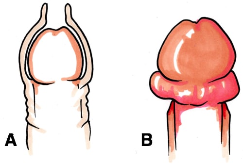 Paraphimosis is the inability to pull forward a retracted foreskin over the glans penis. By TeachMeSeries Ltd (2025)Figure 1The three anatomical divisions of the penis It is most often caused due to the presence of a tight constricting band as part of the foreskin that prevents the retraction over the glans As the paraphimosis remains, the glans becomes increasingly oedematous due to reduced venous return, leading to vascular engorgement of the distal penis and further oedema. If untreated this may lead to penile ischaemia and worsening infection, including Fournier’s gangrene. Consequently, it is a urological emergency that requires urgent reduction. Risk Factors Phimosis, indwelling urethral catheter (due to non-replaced foreskin), poor hygiene, and prior paraphimosis. Clinical Features Typical presentation is with progressive pain and swelling in the glans or distal prepuce, following retraction of their foreskin, being unable to retract in back over their glans (Fig. 2). Patients may have had repeated admissions if the underlying cause has not been addressed. By Aimee Rowe, TeachMeSurgery [CC-BY-NC-ND 4.0] Figure 2Schematic demonstrating (A) normal prepuce (B) a paraphimosis Management Any paraphimosis should be reduced as soon as possible, as delays in management can lead to worsening swelling and a reduced likelihood in successful reduction. Prior to any reduction, ensure suitable analgesia; a penile block via local anaesthetic (without adrenaline) may be warranted in some cases. Once reduced, ensure definitive management (such as consideration for circumcision) is arranged urgently as an outpatient. Methods of Reduction Various techniques to treat paraphimosis have been described: Manual pressure to the glans can aid to reduce oedema, squeezing gently but constantly, before applying force to the glans to reduce it into the prepuce (use of lubricant jelly as required). Application of dextrose-soaked gauze to act as an osmotic effect, drawing fluid out of the glans, reducing the oedema present, and allowing for glans reduction as above. Similar technique for reducing oedema can be performed with ice packs The “Dundee Technique” involves the use of needle punctures into the glans penis, squeezing the area to allow drainage of oedematous fluid, before attempting reduction of the glans, as discussed above If manual reduction fails, then a dorsal slit (incision of the prepuce at the 12’o clock position) or an emergency circumcision may be required Key Points Paraphimosis is the inability to pull forward a retracted foreskin over the glans penis Left untreated, the glans becomes progressive oedematous and can lead to necrosis Cases should be reduced as soon as possible with suitable analgesia Do you think you’re ready? Take the quiz below Pro Feature - Quiz Paraphimosis Question 1 of 3 Submitting... Skip Next Rate question: You scored 0% Skipped: 0/3 Keep your streak going Unlock the full question bank You’ve made a great start. Continue with over 1,200 MRCS-style MCQs, two full mock papers, and ad-free revision with TeachMeSurgery Pro. Continue with Pro Rate This Article