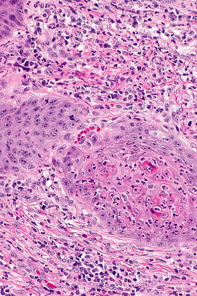 Penile cancer is a rare urological cancer. Around 630 men are diagnosed each year in the UK, although higher rates are seen in Africa, South East Asia and South America. It is most commonly diagnosed in men over 60yrs. Penile cancer has a strong association with Human Papillomavirus (HPV), specifically subtypes 16, 6, and 18, with around one third to half of all cases associated with HPV-related carcinogenesis The most common penile malignancy is squamous cell carcinoma (SCC), usually arising from the epithelium of the inner prepuce or the glans, and accounts for 95% of cases (Fig. 2). Other types include basal cell carcinomas, sarcomas, melanomas, or urethral carcinoma. By TeachMeSeries Ltd (2020) Figure 1The three parts of the penis Risk Factors The most important risk factor for penile cancer is HPV infection. Other risk factors include phimosis, smoking, lichen sclerosis, untreated HIV infection (around 8 times increased risk), or previous Psoralen-UV-A Photochemotherapy (PUVA) treatment (used for some forms of psoriasis and cancer). Circumcision is deemed protective; indeed, penile cancer is virtually unknown in patients who have been circumcised as a child Clinical Features Penile cancer typically presents as a palpable or ulcerating lesion on the penis. They are most commonly located on the glans, however can be found on the foreskin, penile shaft, and scrotum. The lesions are typically painless, however the lesions may discharge or be prone to bleeding. On examination, inguinal lymphadenopathy is present in 30-60% on cases at diagnosis, however not all demonstrate malignant infiltration (the remainder are presumed to represent an inflammatory reaction). Distant metastases are uncommon at presentation, only in 1-10% of patients. Differential Diagnosis There are a wide range of differentials for individuals presenting with ulcerating lesions on the penis. Infections form the mainstay, including Herpes Simplex or Syphilis, whilst inflammatory conditions, such as psoriasis, lichen planus, or balanitis, should also be considered. Premalignant conditions include Condyloma acuminatum (genital warts), Bowens disease, or Lichen sclerosus. Nephron / CC BY-SA (https://creativecommons.org/licenses/by-sa/3.0) Figure 2Squamous Cell Carcinoma of the Penis, as seen on H&E staining microscopy Investigations Any patient with a suspected penile cancer should be referred to a specialist regional centre for further investigation. The mainstay of initial investigation is via penile biopsy, allowing for the confirmation of the diagnosis. Once confirmed, inguinal lymphadenopathy should be determined, typically using PET-CT imaging (especially in those with palpable nodes). For those with positive inguinal lymph nodes, CT imaging of the chest-abdomen-pelvis is required for complete staging. The TNM staging system is used to classify the stage of penile cancer, as well as help establish an appropriate treatment plan. Management The aim of treatment is complete tumour removal and oncological control, whilst ensuring as much organ preservation as possible. Management often requires a combination of surgery, radiotherapy, and chemotherapy. Those with superficial non-invasive disease can be treated with topical chemotherapy agents, such as imiquimod or 5-fluorouracil (5-FU), then followed up with repeat biopsy and long term surveillance is advised prior to commencing treatment. Other treatment options include laser treatment (to ablate the tumour) or glans resurfacing (consisting of complete removal of the glandular epithelium down to the corpus spongiosum, followed by reconstruction with a split skin or buccal mucosa graft). Surgical Management Most cases of penile cancer will need surgical management. Traditionally a 2cm, tumour-free margin has been recommended, however a 5mm margin is considered safe. For those with invasive disease confined to the glans, organ sparing treatment can be performed. Options include local excision, partial glansectomy (Fig 3), or total glansectomy with reconstruction (using a split skin graft). Radical circumcision may be used for purely foreskin tumours. Treatment options for invasive penile cancer include partial amputation (removing glans penis with or without a portion of the underlying corpora) with reconstruction, or total penectomy (removal of glans penis and most or all of the underlying corporal bodies) with perineal urethrostomy. Neoadjuvant radiotherapy or chemotherapy may also be required. Those with inguinal node involvement may require radical inguinal lymphadenectomy, neoadjuvant chemotherapy, or radiotherapy (in palliative cases). Tim nu / CC0 Figure 3A partial penectomy without urethral relocation Reconstruction Options Once the patient is disease free for a suitable time, phallic reconstruction is possible by forearm phalloplasty. Prognosis Penile cancer remains a largely treatable disease, with an 85% 5-year survival rate for those diagnosed at the T1 stage, however reduced to 12% if there are distant metastases at presentation. The overall 5-year survival rate for penile cancer is around 70%. Key Points Penile cancer is a rare urological cancer, and has a strong association with Human Papillomavirus Penile cancer typically presents as a palpable or ulcerating lesion on the penis Diagnosis is made through tissue biopsy and CT imaging Management often requires a combination of surgery, radiotherapy, and chemotherapy The overall 5-year survival rate for penile cancer is around 70% Do you think you’re ready? Take the quiz below Pro Feature - Quiz Penile Cancer Question 1 of 2 Submitting... Skip Next Rate question: You scored 0% Skipped: 0/2 Keep your streak going Unlock the full question bank You’ve made a great start. Continue with over 1,200 MRCS-style MCQs, two full mock papers, and ad-free revision with TeachMeSurgery Pro. Continue with Pro Rate This Article