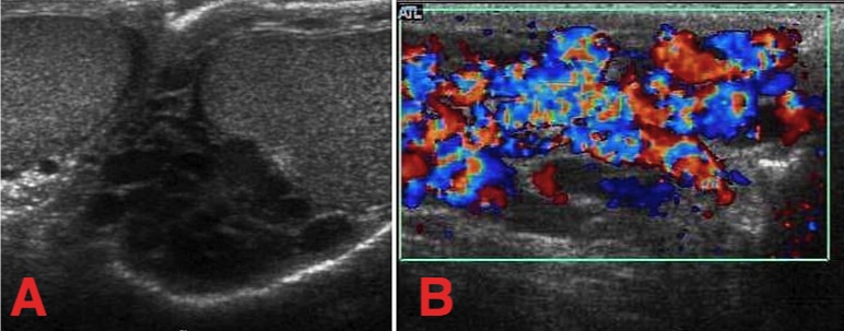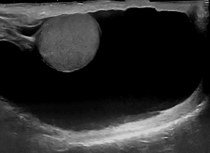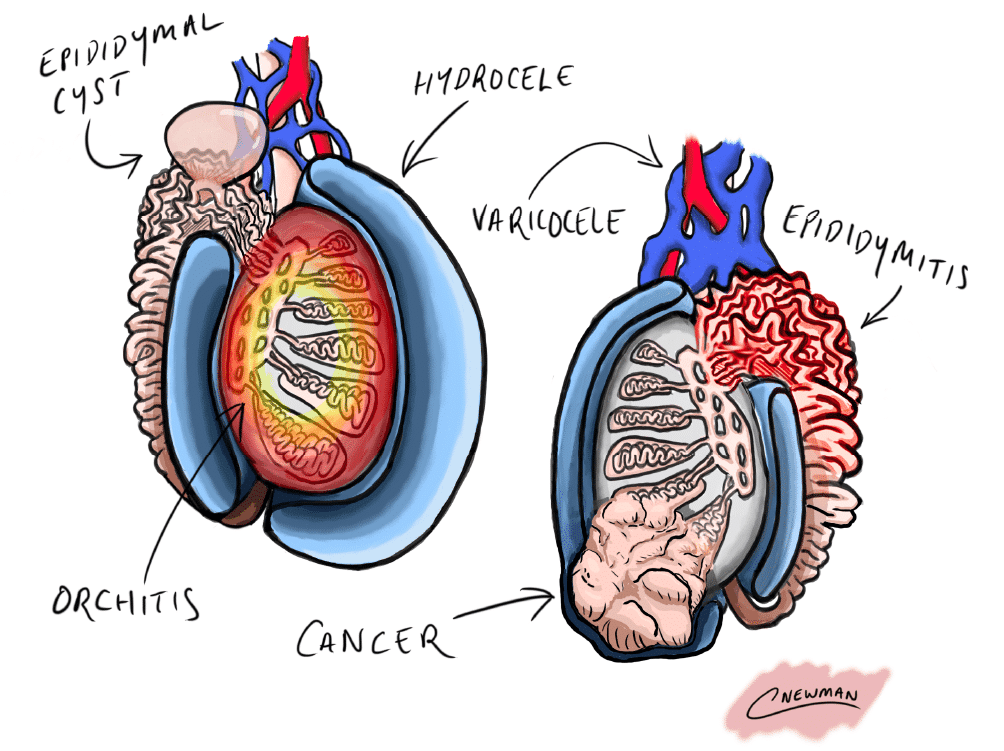 A scrotal lump is an abnormal mass or swelling within the scrotum. They can originate from either testicular or extra-testicular sources. The presentation covers a wide range of pathology, therefore a good understanding of the differentiating features can aid in diagnosis, planning of suitable investigations, and the subsequent management. By TeachMeSeries Ltd (2020) Figure 1The testes and epididymis, surrounded by the tunica vaginalis Clinical Features In the history, ensure to clarify time of onset, associated symptoms (especially pain), and previous episodes. In most cases, however, the diagnosis of a scrotal lump can largely be made from clinical examination alone. Inspection of the lump should include the “6 S’s”, describing the Site, Size, Shape, Symmetry, Skin changes, and any Scars present. When palpating the lump the examining clinician should comment on (CAMPFIRE is a useful acronym) Tenderness, Temperature, Transillumination, Consistency, Attachments, Mobility, Pulsation, Fluctuation, Irreducibility, Regional lymph nodes, and the Edge. Specific to the scrotum, it is important to identify and separately palpate the testis, epididymis, and vas deference. Investigations For the majority of scrotal lumps, especially those testicular in origin, an ultrasound scan of the scrotum is the first line investigation. Additional blood tests or further imaging may be warranted, depending on the suspected underlying cause Investigating Suspected Testicular Cancer Any mass arising from the testes will often need an urgent ultrasound scan to assess for testicular cancer. Unlike many other malignancies, a biopsy is not warranted for the diagnosis of testicular cancer (due to risk of seeding cancer), instead diagnosis is made purely on clinical features, ultrasound, and histopathological examination of the testis following orchidectomy. In those where testicular cancer is suspected, blood tests for testicular tumour markers may also be sent, including lactate dehydrogenase (LDH), alpha-fetoprotein (AFP), and beta-human chorionic gonadotrophin (beta-hCG). Differential Diagnoses Scrotal lumps may be classified as being either testicular or extra-testicular in origin. By Thomas Newman, www.thomasnewman.design, TeachMeSurgery [CC-BY-NC-ND 4.0] Figure 2Schematic showing the potential differential diagnoses of a scrotal lump Extra-testicular Hydrocoele A hydrocoele is an abnormal collection of peritoneal fluid between the parietal and visceral layers of the tunica vaginalis enveloping the testis. They typically present* as a painless fluctuant swelling that will transilluminate, either unilateral or bilateral. Occasionally they can grow very large and cause discomfort when sitting and walking necessitating surgical management. Congenital hydrocoeles affect up to 3% of male neonates and generally regress spontaneously by one or two years of age. No treatment is typically needed. In infants, they can be caused by a patent processus vaginalis requiring ligation to stop recurrence. In older males, hydrocoeles may be primary (idiopathic) or secondary due to trauma, infection, or malignancy. Those presenting with a hydrocoele aged between 20-40yrs (or where the testis cannot be palpated) should undergo urgent ultrasound scan (Fig. 3). *It is important to note that hydrocele can form along the spermatic cord and is a differential for lumps in the groin Mikael Häggström, M.D. [CC0] Figure 3Ultrasound showing a 10cm hydrocoele in a 55yr old male Transillumination Transillumination involves using a pen torch to shine light from behind a scrotal lump to observe whether the light travels through and illuminates the lesion. The technique helps to assess whether a mass is fluid-filled or not, as fluid will transilluminate and solid masses will not. Hydrocoeles and large epididymal cysts will classically transilluminate. Varicocoele A varicocoele is an abnormal dilatation of the pampiniform venous plexus within the spermatic cord. They present as a lump, often described as feeling like a “bag of worms” or with a “dragging sensation”, and may disappear on lying flat. It is important to examine the patient lying down, standing up and whilst performing a valsava manoeuvre. 90% of varicocoeles are found on the left side as the spermatic vein drains directly into the left renal vein* (compared to the inferior vena cava on the right). They can cause infertility and testicular atrophy by increasing the intra-scrotal temperature; men who have a varicocoele and fertility issues should undergo semen analysis, with referral to a urology specialist if abnormal. Red flag signs with a varicocoele are those of acute onset, right-sided, or remain when lying flat, and should be investigated urgently. Asymptomatic varicocoeles with no alarming features generally need no treatment. Surgical management includes embolisation by an interventional radiologist and surgical approaches either open or laparoscopic approach for ligation of the spermatic veins. *The abdomen should always be examined to exclude a renal tumour as the cause of a varicocoele, albeit rare Adapted from Chee-Wai Mak and Wen-Sheng Tzeng [CC BY 3.0 (https://creativecommons.org/licenses/by/3.0)] Figure 4An ultrasound demonstrating the dilated venous plexus of the varicocoele (A) without Doppler (B) with Doppler Epididymal Cysts Epididymal cysts (also known as spermatoceles) are benign fluid-filled sacs arising from the epididymis. They present as a smooth fluctuant nodule, found above and separate from the testis that will transilluminate, often they are multiple. They are common scrotal pathology and are classically seen in middle-aged men. The cysts rarely cause symptoms, have no association to malignancy, and generally do not need treatment. In rare instances, they are very large or painful and therefore surgery may be required, but is best avoided in younger men as surgery may lead to infertility. Epididymitis Epididymitis is inflammation of the epidi