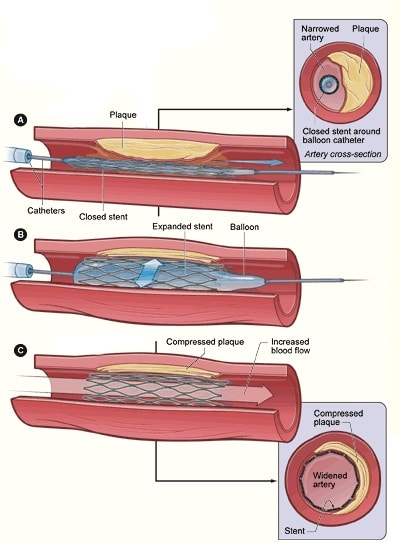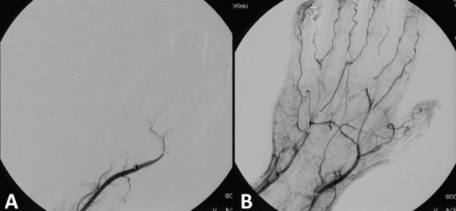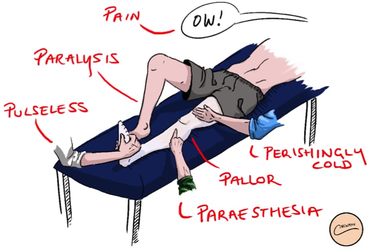 Acute limb ischaemia is defined as the sudden decrease in limb perfusion that threatens the viability of the limb. Complete or even partial occlusion of the arterial supply to a limb can lead to rapid ischaemia and poor functional outcomes within hours. Acute limb ischaemia has an incidence of around 1.5 per 10,000 person-years. In this article, we shall look at the causes, clinical features and management of a patient with acute limb ischaemia Aetiology The causes of acute limb ischaemia can be classified into three main groups: Embolisation whereby a thrombus from a proximal source travels distally to occlude the artery (most common) The original thrombus source may be as a result of atrial fibrillation, post-MI mural-thrombus, abdominal aortic aneurysm, or prosthetic heart valves Thrombosis in situ whereby an atheroma plaque in the artery ruptures and a thrombus forms on the plaque’s cap (presenting as acute or acute-on-chronic) Trauma (less common), including compartment syndrome Clinical Features Classically, the signs and symptoms of acute limb ischaemia can be described using the 6 Ps (the first three here being the most common initial features): Pain Pallor Pulselessness Paresthesia Perishingly cold Paralysis By Thomas Newman, www.thomasnewman.design, TeachMeSurgery [CC-BY-NC-ND 4.0] Figure 1The 6 Ps of Acute Limb Ischaemia Acute limb ischaemia is often characterised by a sudden onset of these symptoms. A normal pulsatile contralateral limb is a sensitive sign of an embolic occlusion. In the history, the causes of potential embolisation should be explored. These include chronic limb ischaemia, atrial fibrillation, recent MI (resulting in a mural thrombus), abdominal aortic aneurysm, and peripheral aneurysm. The later the patient presents to a hospital, the more likely that irreversible damage to the neuromuscular structures will have occurred (more common >6hrs post-symptom onset), which will ultimately result in a paralysed limb (Table 1). Category Prognosis Sensory Loss Motor Deficit Arterial Doppler Venous Doppler I – Viable No Immediate threat None None Audible Audible IIA – Marginally Threatened Salvageable, if promptly treated Minimal (toes) or none None Inaudible Audible IIB – Immediately Threatened Salvageable if immediately revascularised More than toes, rest pain Mild/Moderate Inaudible Audible III – Irreversible Major tissue loss, permanent nerve damage inevitable Profound Profound, paralysis Inaudible Inaudible Table 1 – Clinical Categories of Acute Limb Ischemia, adapted from Rutherford et al., 2009 Differential Diagnosis The differential diagnoses for acute limb ischaemia include critical limb threatening ischaemia, acute DVT (can present as phlegmasia cerulea dolens and phlegmasia alba dolens), or spinal cord or peripheral nerve compression. Investigation Routine bloods, including a serum lactate (to assess the level of ischaemia), a thrombophilia screen (if <50yrs without known risk factors), and a group and save, should be taken, along with an electrocardiogram (ECG). Suspected cases should be initially investigated with beside Doppler ultrasound scan (both limbs), followed by potential CT angiography (Fig. 2). If the limb is considered to be salvageable, a CT arteriogram can provide more information regarding the anatomical location of the occlusion and can help decide the operative approach (such as femoral versus popliteal incision). By Milorad Dimic MD [GFDL], via Wikimedia Commons Figure 2Reconstructed 3D CT angiogram, showing complete occlusion of the right femoral artery Management Initial Management Acute limb ischaemia is a surgical emergency. Complete arterial occlusion will lead to irreversible tissue damage within 6 hours. Early senior surgical support is vital. Start the patient on high-flow oxygen and ensure adequate intravenous access. A therapeutic dose heparin or intravenous heparin infusion should be initiated as soon as is practical. Conservative Management Conservative management can often be considered for those with Rutherford 1 and 2a; a prolonged course of heparin may be the most effective non-operative management of acute limb ischaemia. Any patient started on conservative management via heparin will need regular assessment to determine its effectiveness through monitoring APPT ratio blood tests and clinical review. Surgical intervention may be warranted if no significant improvement is seen. Surgical Intervention Surgical intervention is mandatory for cases presenting in Rutherford 2b If the cause is embolic, the options are: Embolectomy via a Fogarty catheter; this can be done over a wire using radiological guidance Local intra-arterial thrombolysis* Bypass surgery (if there is insufficient flow back), or to exclude an occluded popliteal aneurysm If the cause is due to thrombotic disease, the options are: Local intra-arterial thrombolysis Angioplasty (Fig. 3), likely combined with thrombolysis Bypass surgery *Intra-arterial thrombolysis is often difficult to conduct within 6 hours, therefore often used for Rutherford 2a By TeachMeSeries Ltd (2025) Figure 3Schematic demonstrating how angioplasty is performed Irreversible limb ischaemia (mottled non-blanching appearance with hard woody muscles) requires urgent amputation or taking a palliative approach. Most post-operative cases require a high level of care, typically at a high dependency unit, due to the ischaemia reperfusion syndrome. Long Term Management Reduction of the cardiovascular mortality risk in this patient group is key. Promoting regular exercise, smoking cessation, and weight loss as necessary. Most cases should be started on an anti-platelet agent, such as low-dose aspirin or clopidogrel, or even anticoagulation with warfarin or a DOAC. Any underlying predisposing conditions to the acute limb ischaemia should be treated, e.g. uncontrolled atrial firbillation. Cases resulting in amputation will require occupational therapy and physiotherapy, with a long term reha